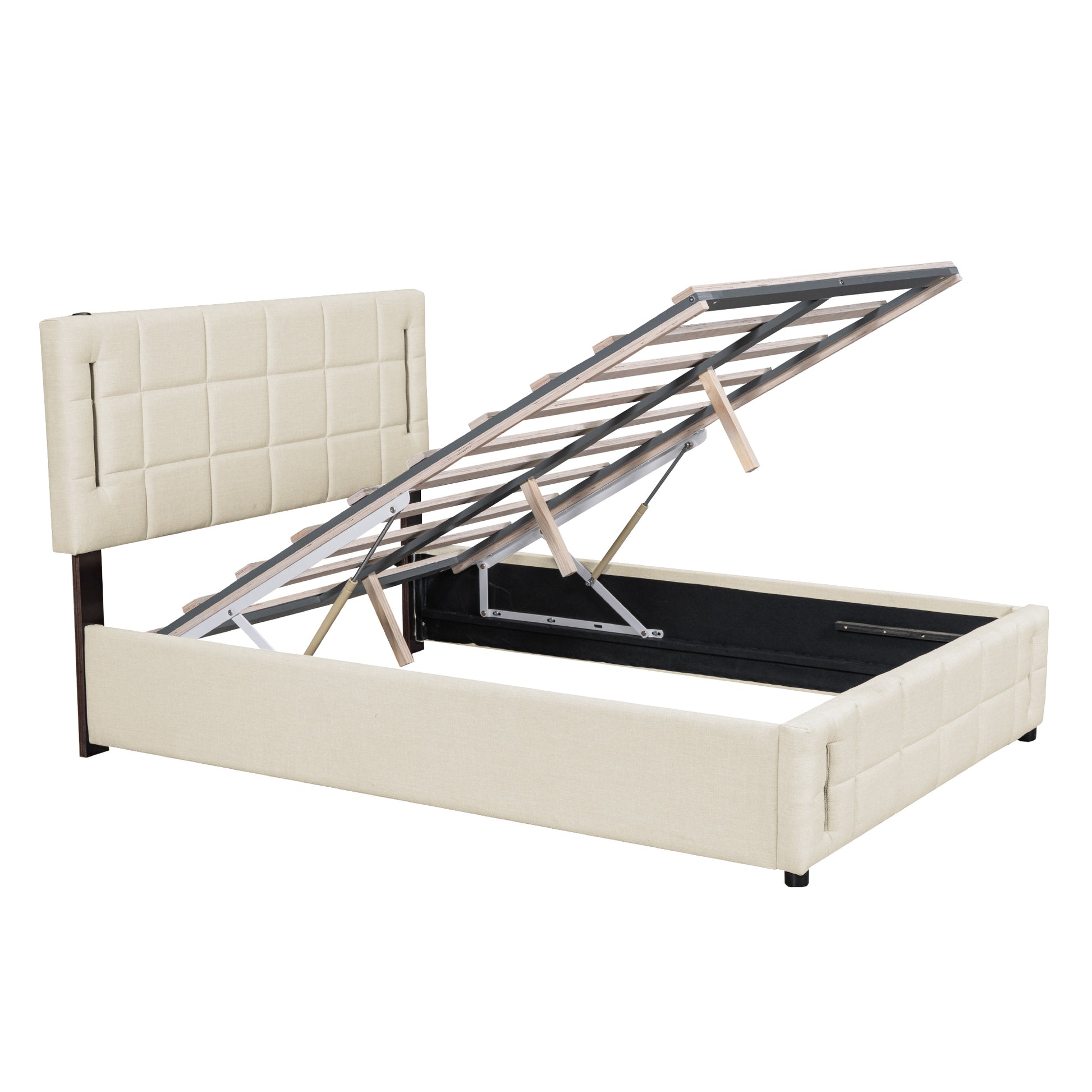 Full Size Upholstered Bed with Hydraulic Storage System and LED Light, Beige