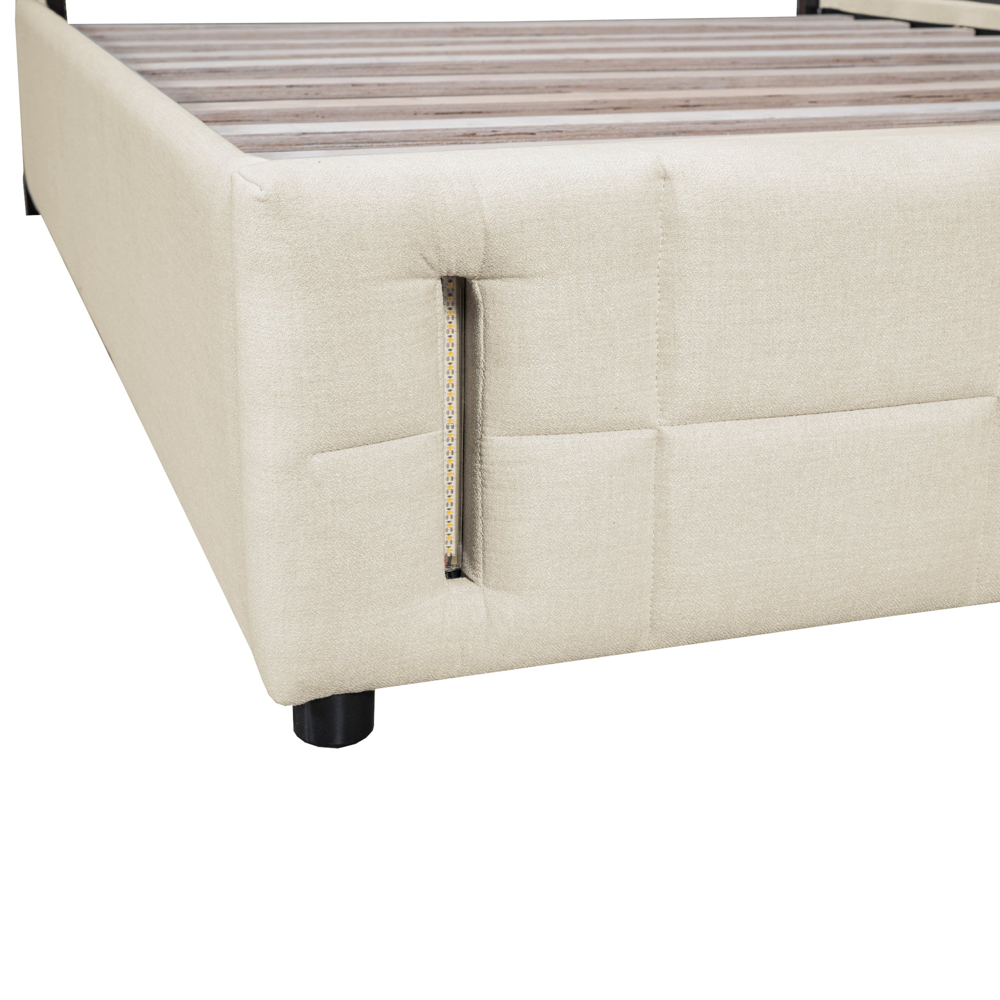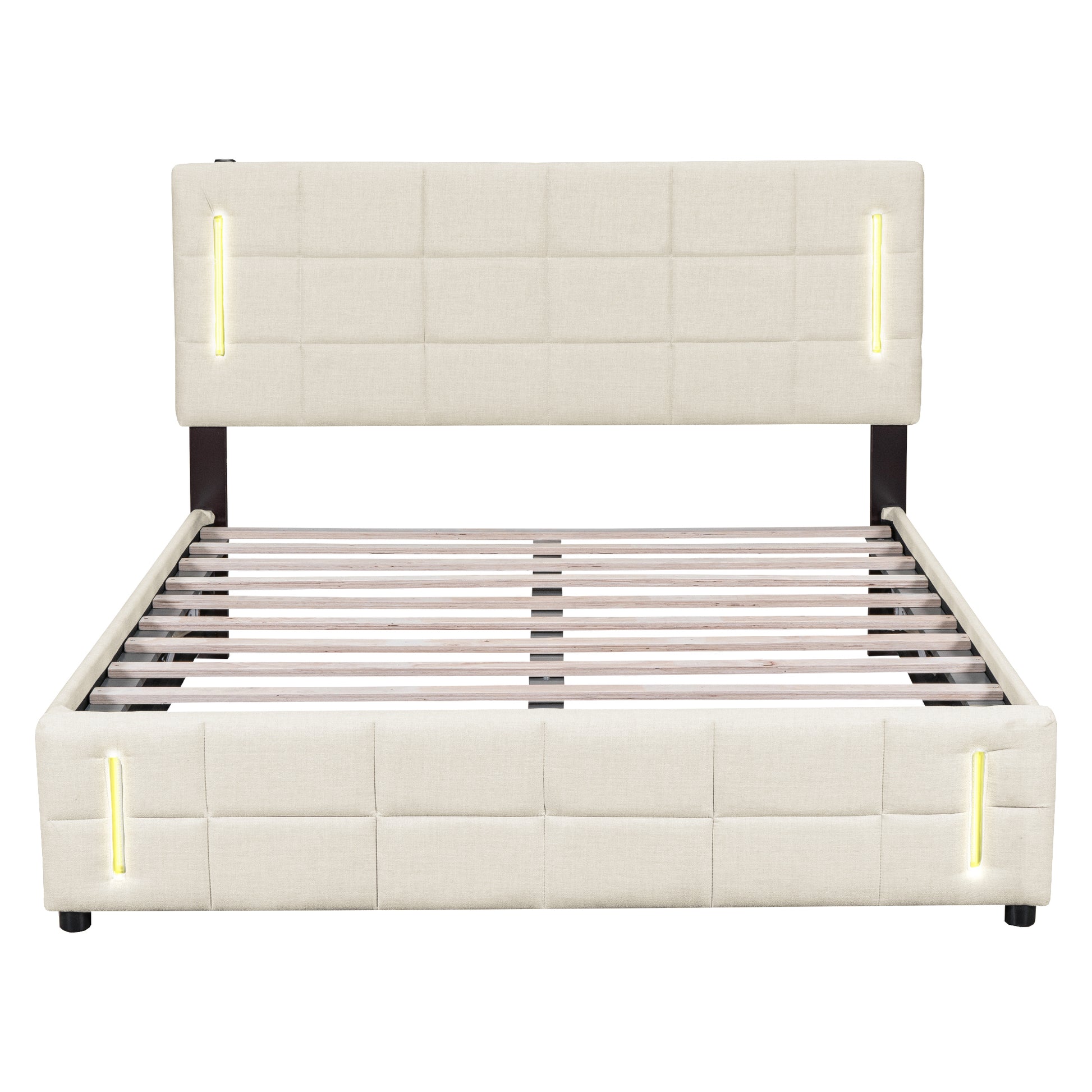 This beautiful Upholstered Platform Bed which features button-tufted design headboard and sensor lights adds a contemporary chic look to your bedroom and filled in thick foam to add extra comfort. Our platform bed frame is equipped with latest RGB light bars.It includes 16 colors of LED lights and 4 lighting patterns. USB Ports on the headboard can be used to charge Ipad or laptop. Colorful lights make your life colorful, you can change lights by remote control at ease. A hydraulic storage system underneath the mattress makes storing your bedroom things in smaller spaces possible without compromising the size of bed you want. This beautiful Upholstered Platform Bed will certainly be a beautiful and practical piece in your bedroom