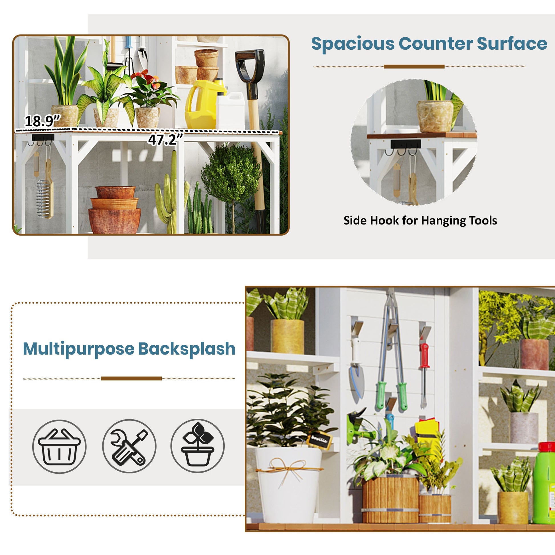 - [Backsplash&Side Hook] Worried about these kits like weeders,trowels,scissors, towels and even your farmer hats when gardening? Then this table will give you a chance to hold all of these. Just with some nails, the middle plate will become a board to hold your tools. Besides, the potting table comes with 3 hooks in the side for saving space.