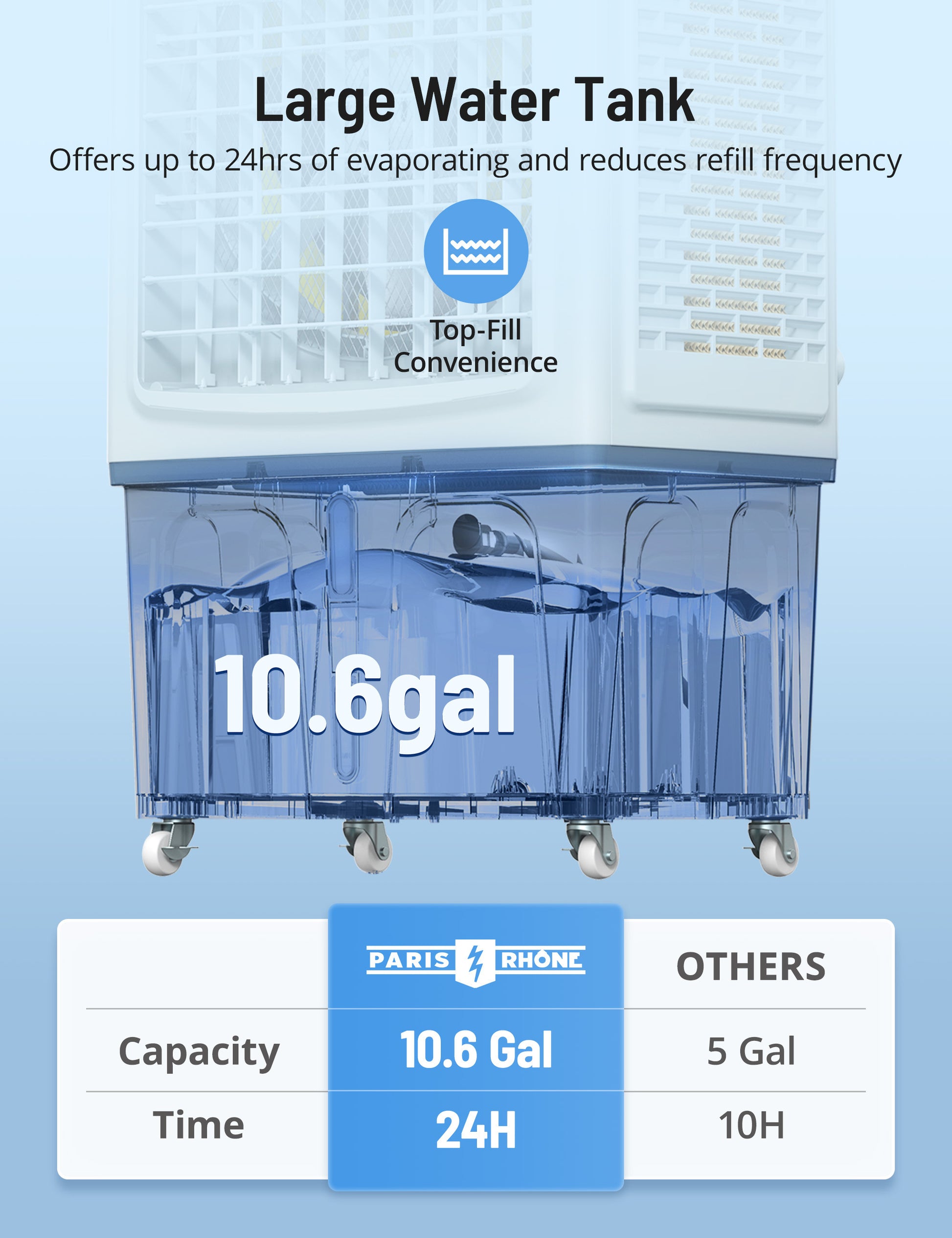 - Big Tank, Less Troubles: Our air conditioner portable impresses with a large 10.6-gallon water tank that provides up to 24hrs of continuous evaporative cooling, eliminating the need for constant refills like smaller 5-gallon coolers. The top-fill design allows for easy refilling without the need to lean low.