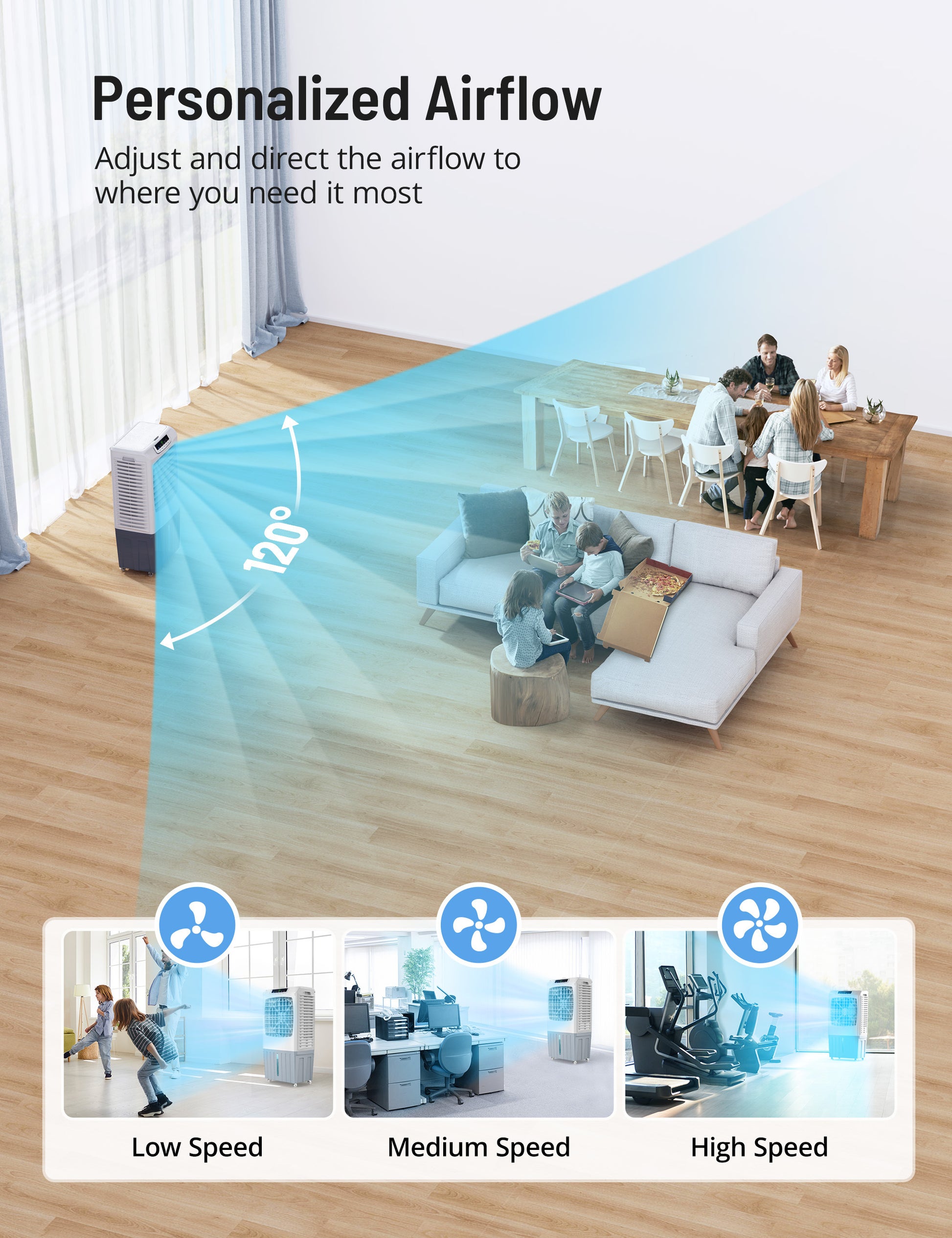 - Personalized Cooling Airflow: With 3 wind speeds to choose from always stay cool with the portable swamp cooler. The portable evaporative cooler directs the breeze to exactly where you need it most with an auto 120° horizontal swing or a manually controlled vertical 75° oscillation.