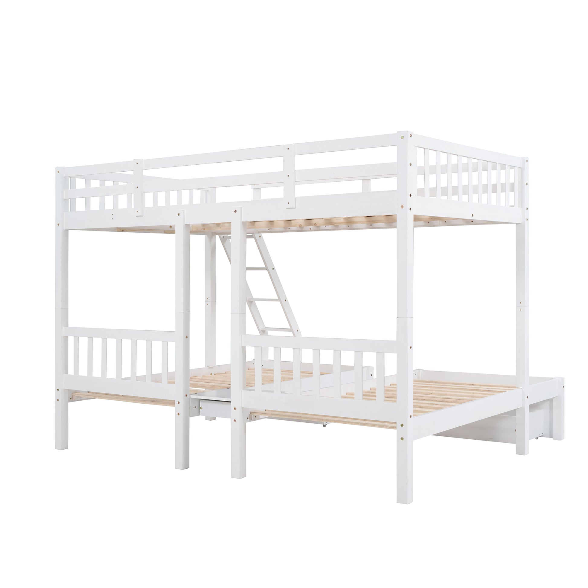 Full Over Twin & Twin Bunk Bed, Wood Triple Bunk Bed with Drawers and Guardrails, White