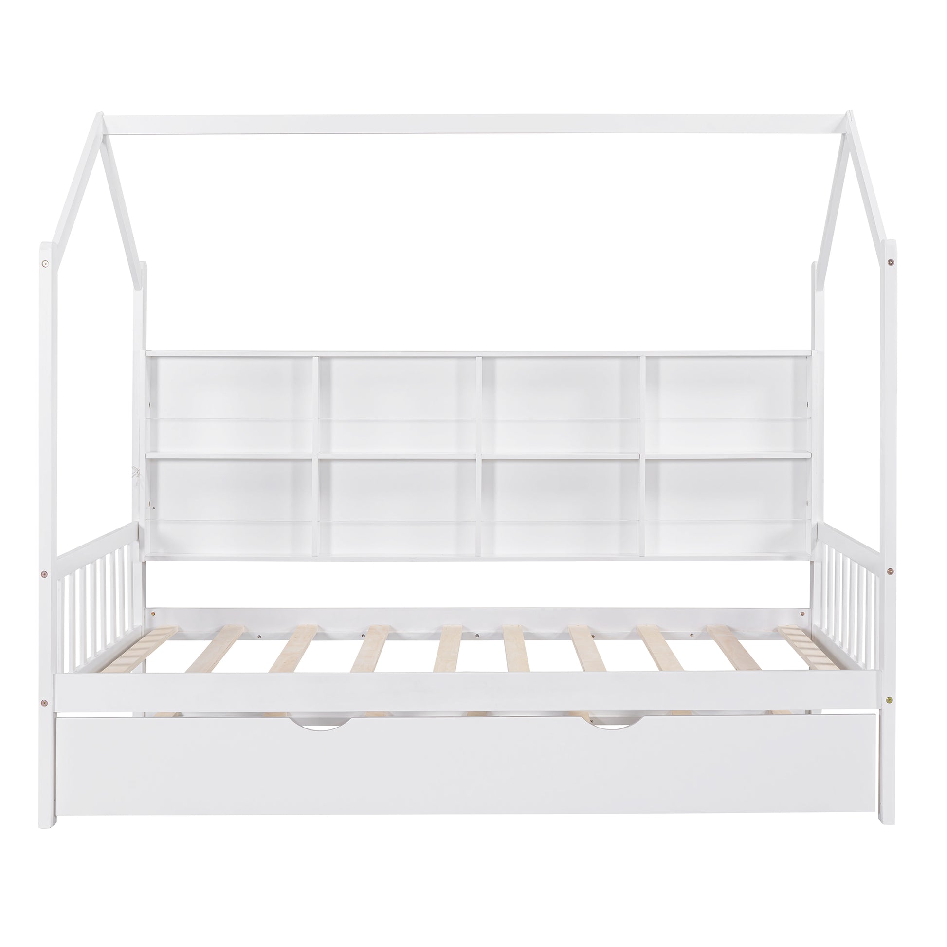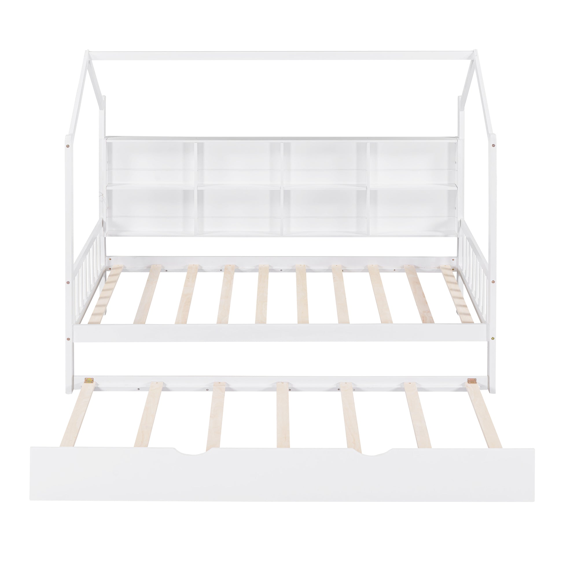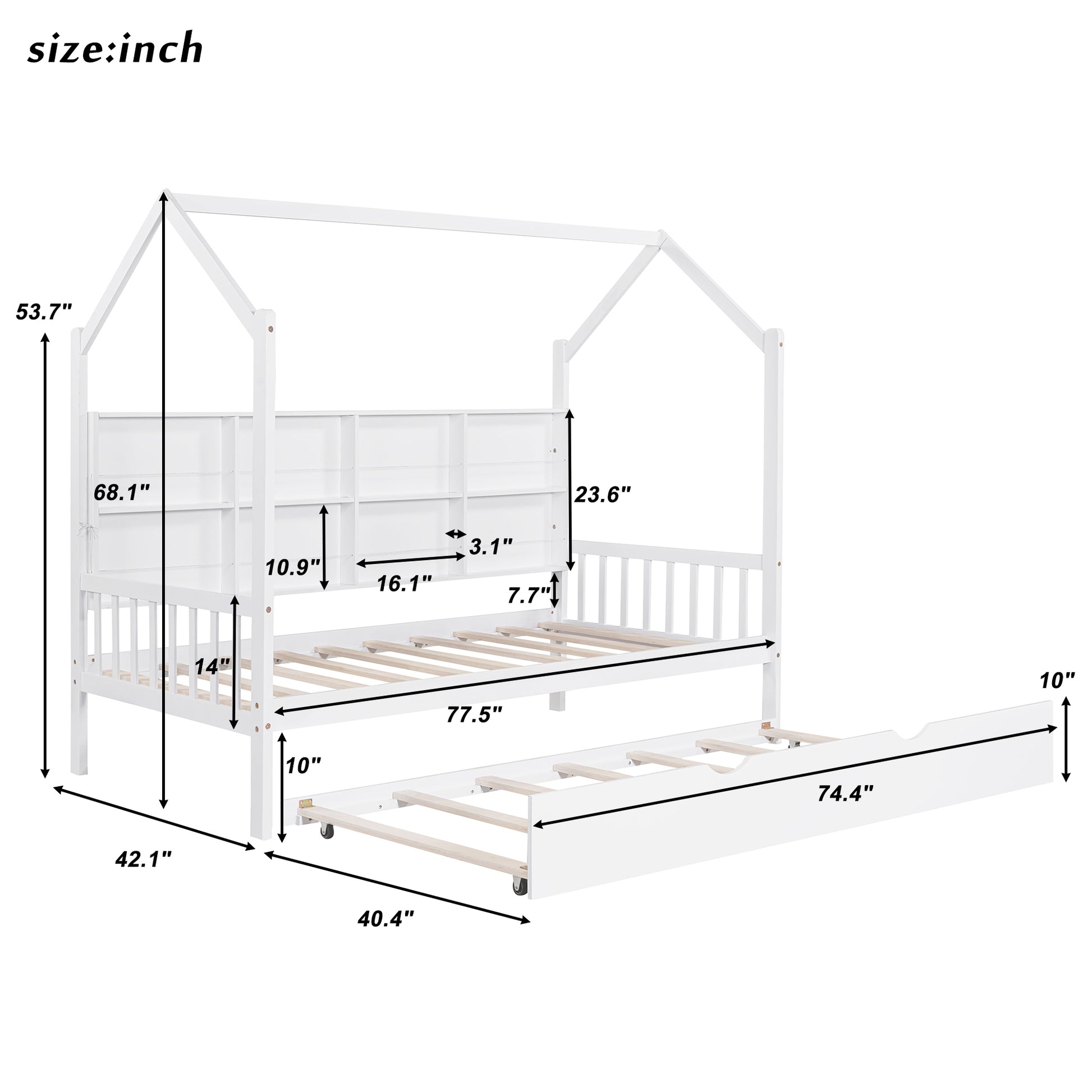 Wooden Twin Size House Bed with Trundle,Kids Bed with Shelf, White