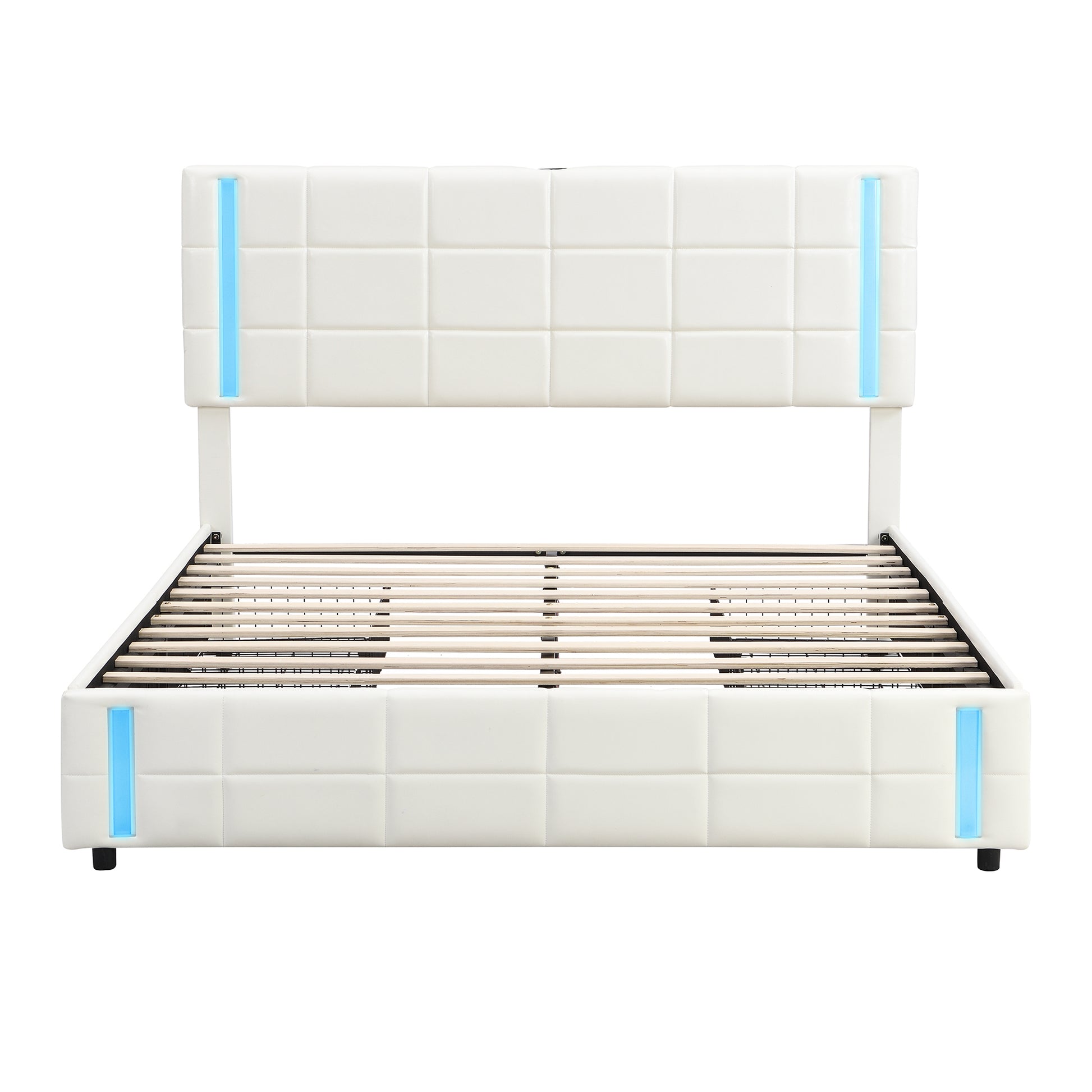 Queen Size Upholstered Platform Bed with LED Lights and USB Charging, Storage Bed with 4 Drawers, White
