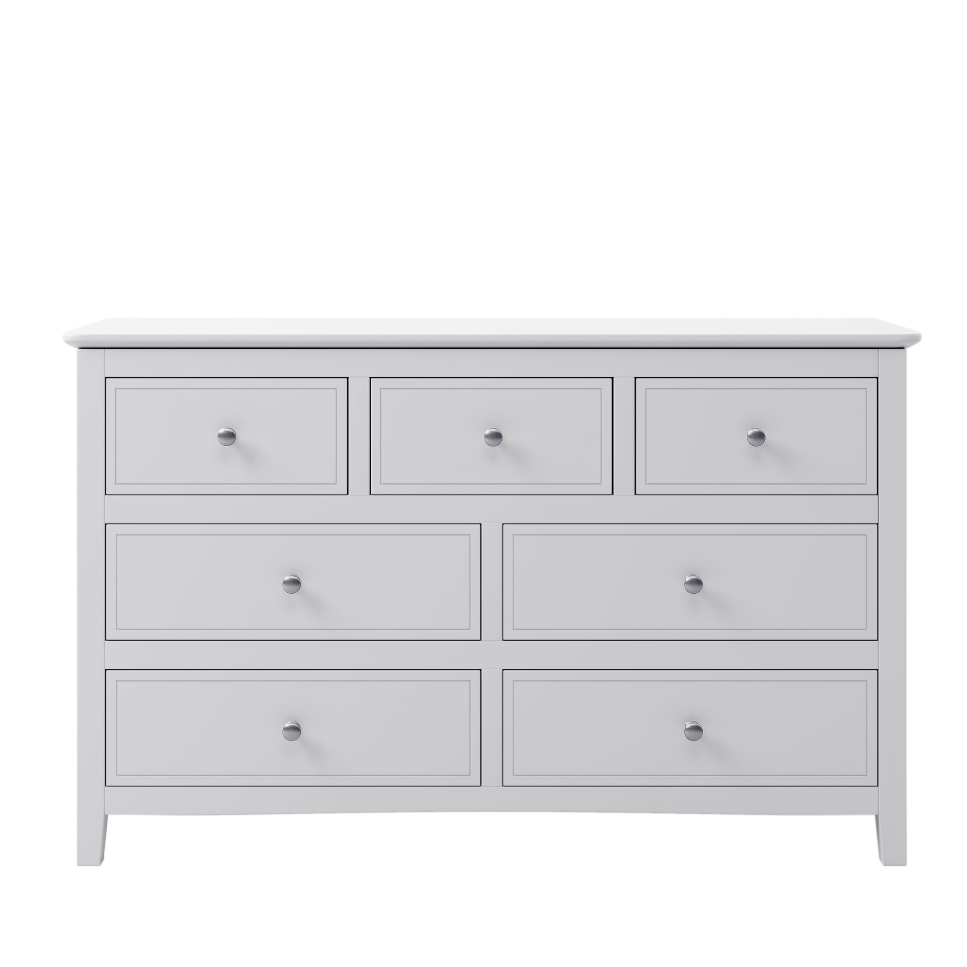 The White 7-Drawer Double Chest is a universal nursery and bedroom storage solution featuring stylish metal knobs for added modern flair. Crafted with pine wood, this durable double dresser features 7 spacious drawers, durable steel hardware, metal-glide drawers with safety stops. |
