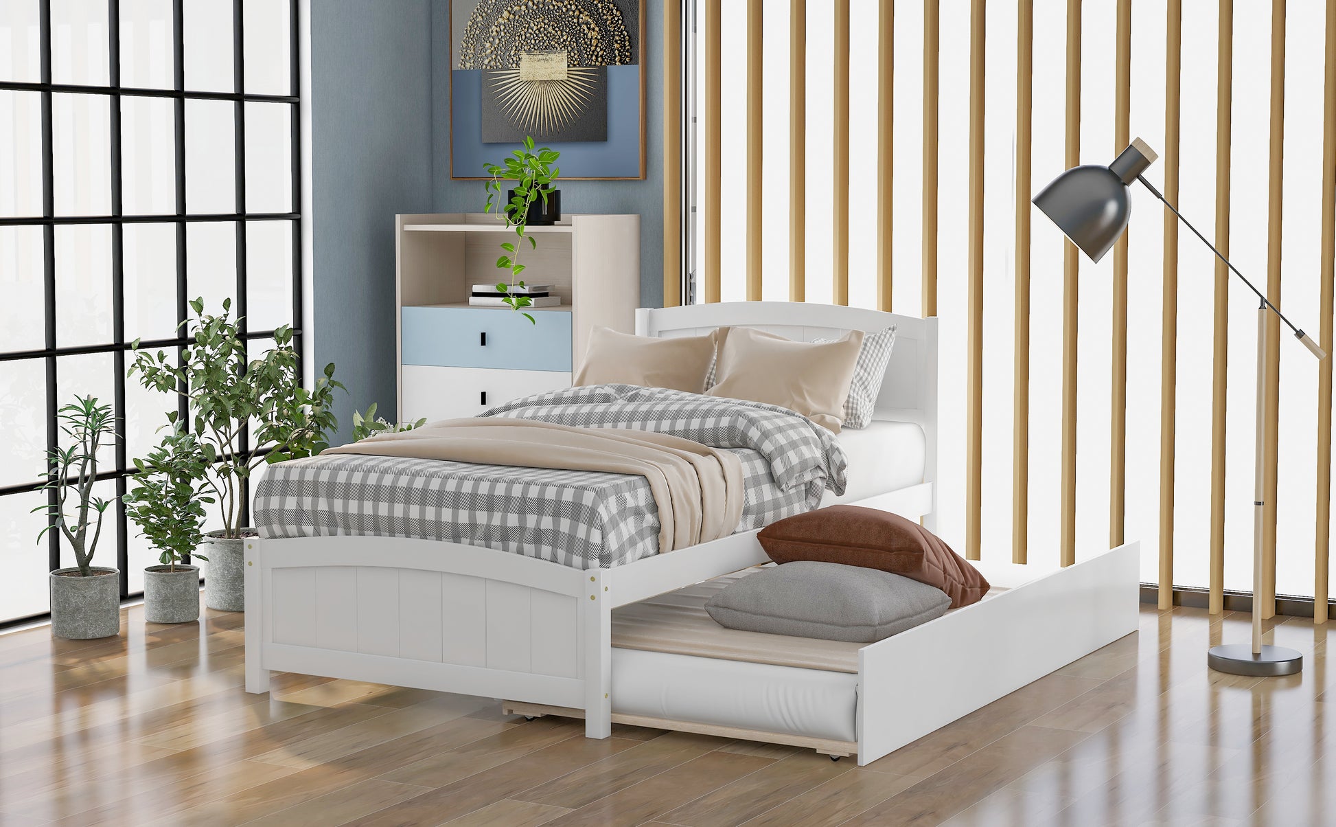 This Wood Platform Bed with Trundle is a minimalistic, stylish bed frame that works well with a variety of decorating styles and makes it easy for you to enhance and improve your space. Featuring strong, solid pine wood and ten supporting slats, this bed is built to last, ensuring it will accompany you for many years. The beautiful white finish lends an elegant look makes this bed frame an excellent addition to any bedroom, do not miss the chance take it home today.