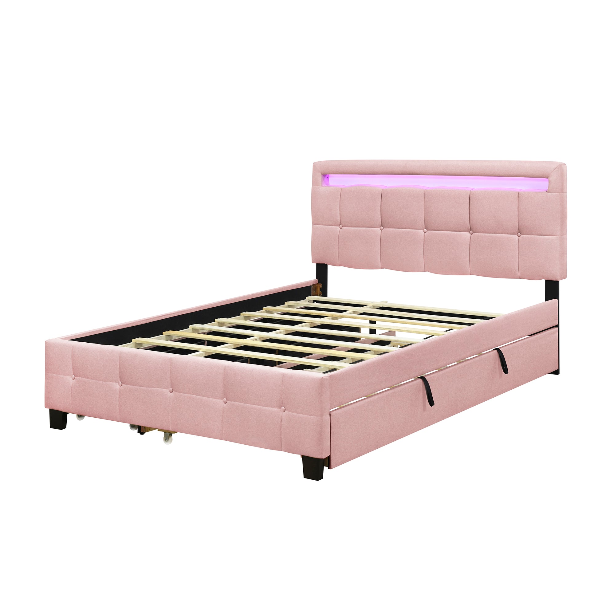 Queen Size Upholstered Platform Bed with LED Frame, with Twin XL Size Trundle and 2 drawers, Linen Fabric, Pink