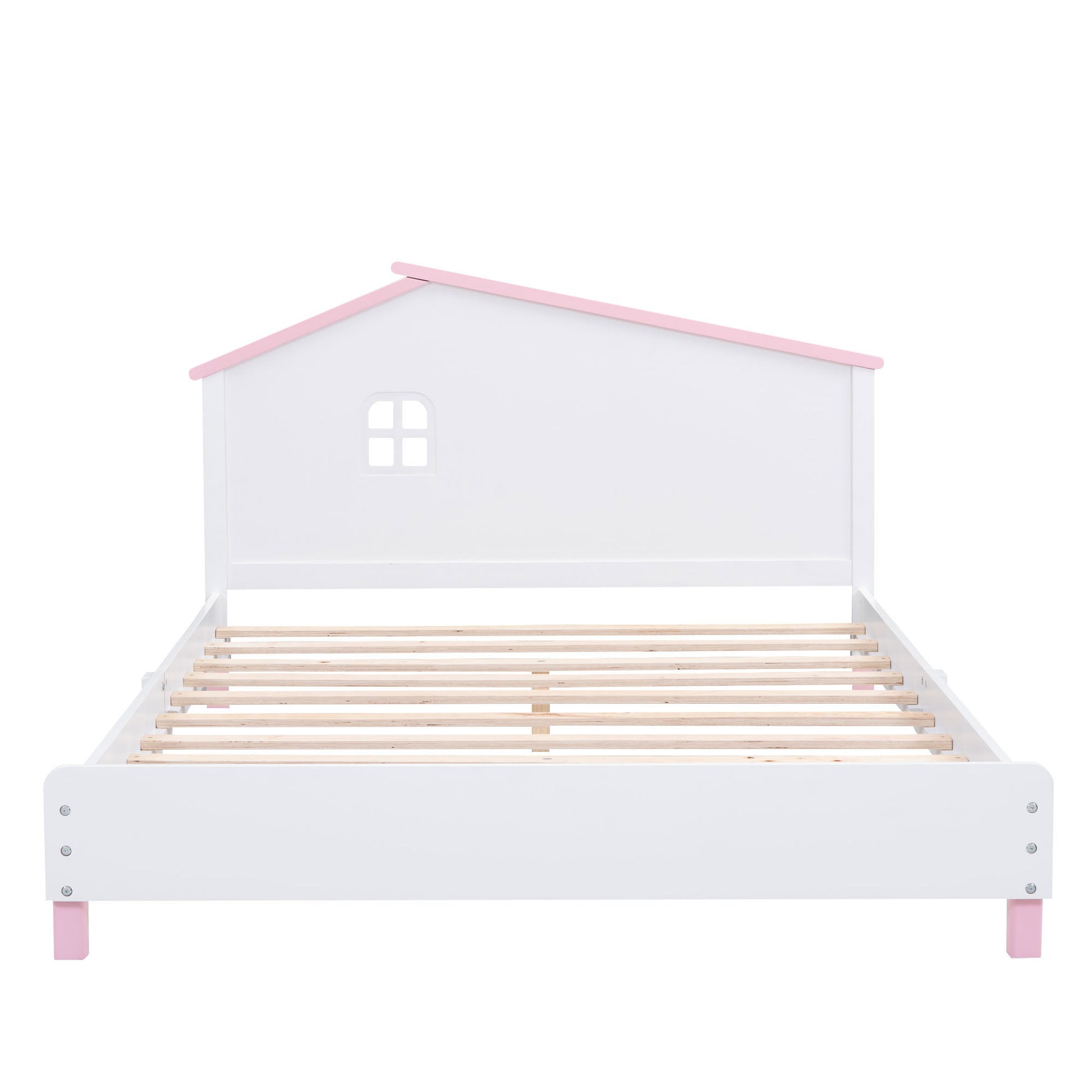 Full Size Wood Platform Bed with House-shaped Headboard (White+Pink)