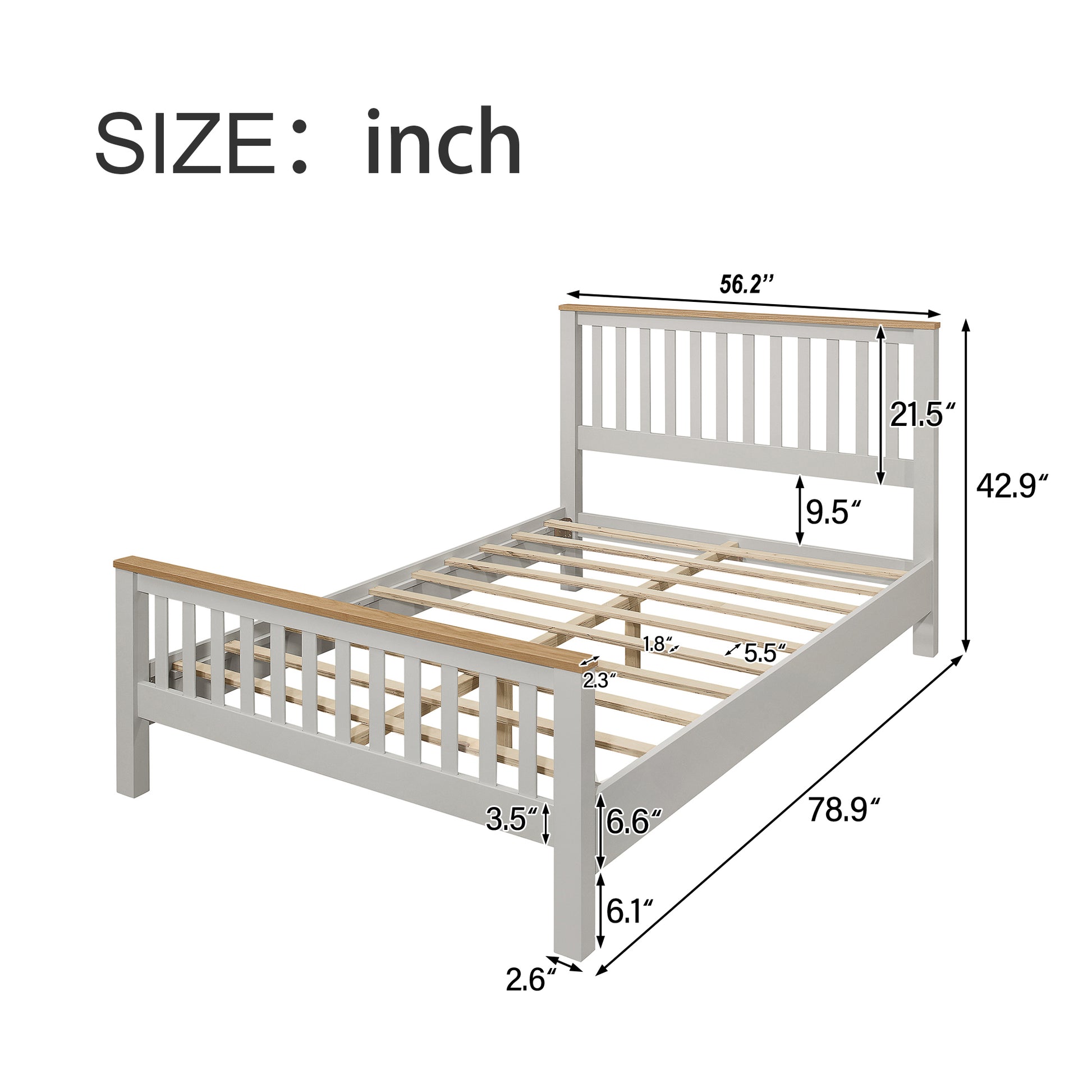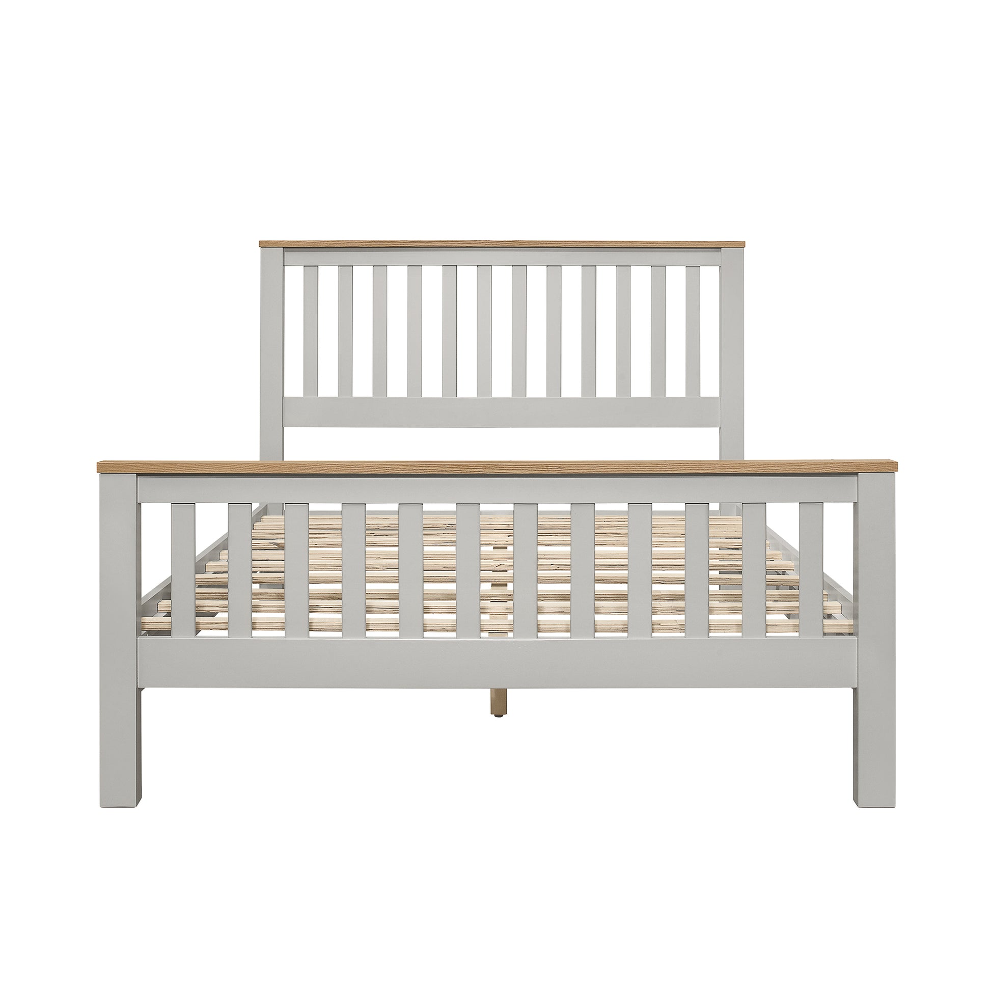 This is your classic farmhouse style solid wooden bed frame. The bed is made from solid pine wood, with a modern mid-grey finish, and features oak stain finish wood trims on the headboards and footboards. The contrast trim adds a subtle fusion of color bringing warmth and style to the traditional design. The bed frame has a solid slatted base for durability and is available in full, queen & king sizes. The timeless design of the bed will suit any bedroom style and will never look dated.