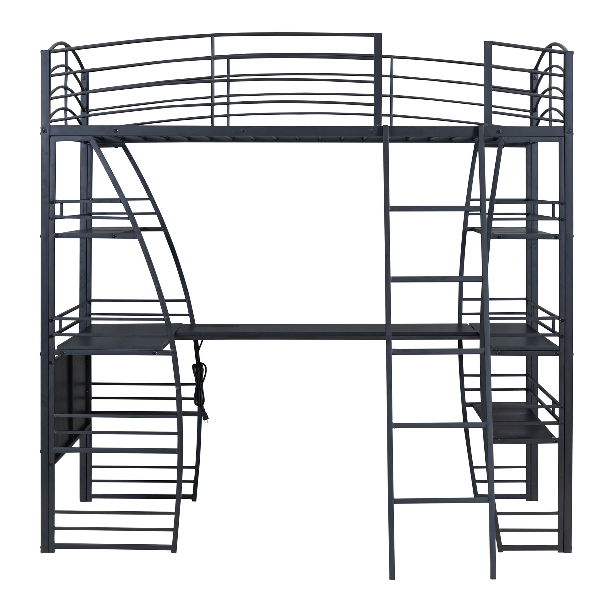 Crafted of metal in a clean painted finish, this metal loft bed strikes a clean-lined silhouette with a curved slatted guardrails.This bold and imaginative modelling design can easily catch attention and be well matched with your room decor.The 4-layers open shelves offer you such space to lay out whatever you want.And for your convenience, a set of sockets, USB ports and a wireless charging is equipped on the desk.It has saved a lot of trouble for you to charge your phone and pad besides you while you are working and reading.Equipped with the L-shaped large desk, this bed definitely offers you a comfortable place to work, read and enjoy yourself.I am sure that this imaginative loft bed could achieve your little wonderful world.