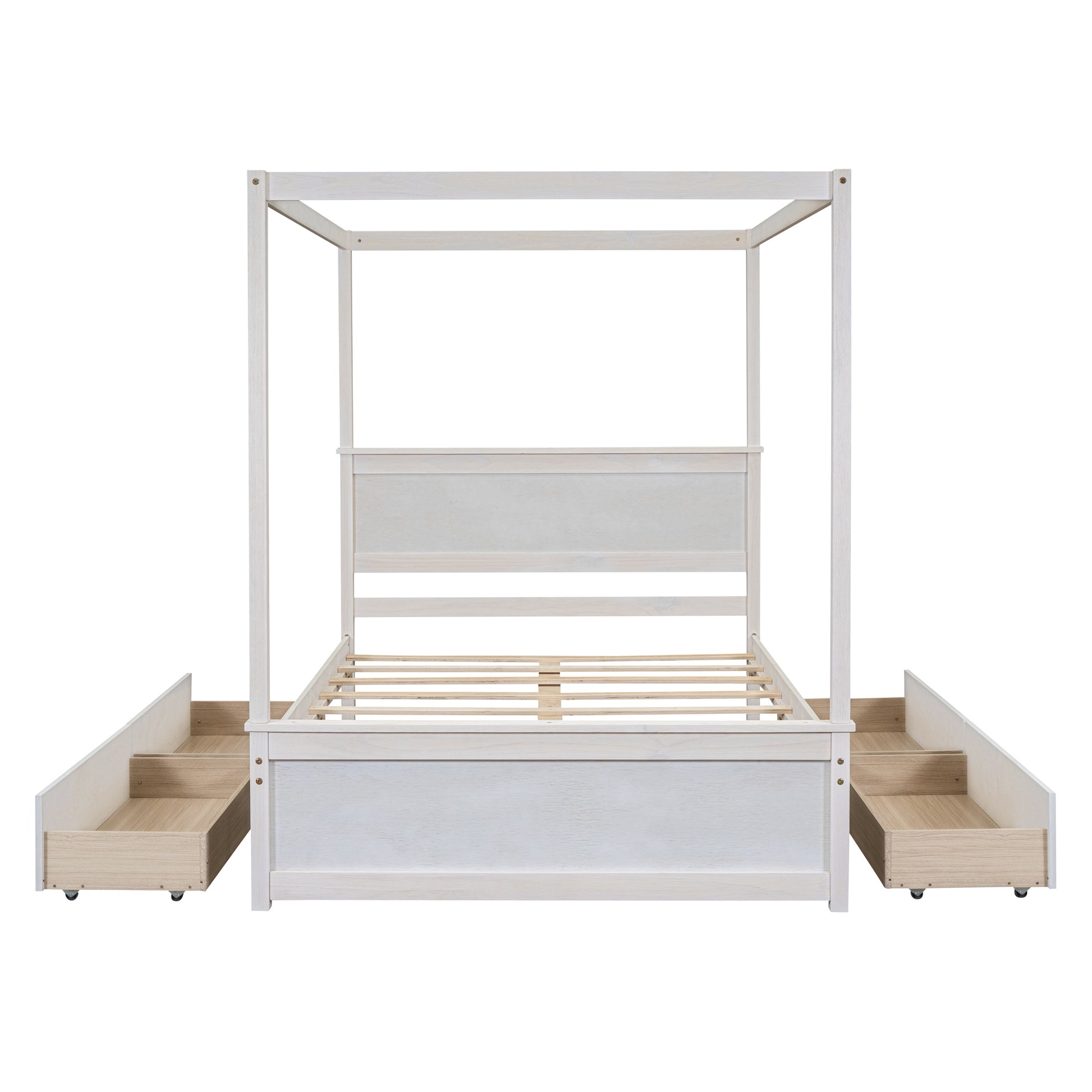 Wood Canopy Bed with four Drawers ,Full Size Canopy Platform Bed With Support Slats .No Box Spring Needed, Brushed White