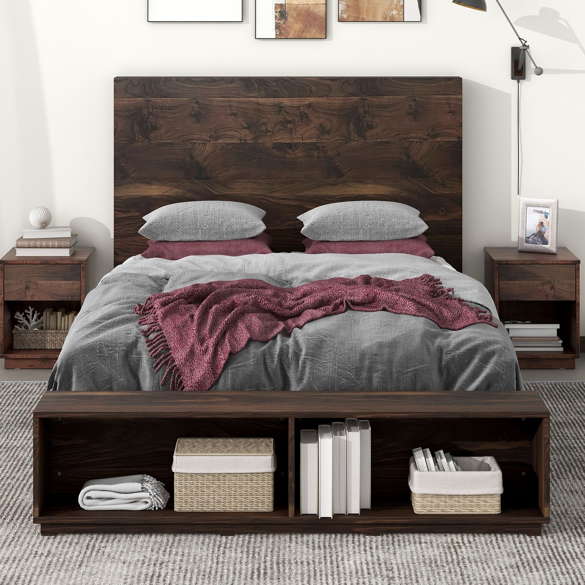Queen Size Wood Platform Bed with Storage Bench in Walnut