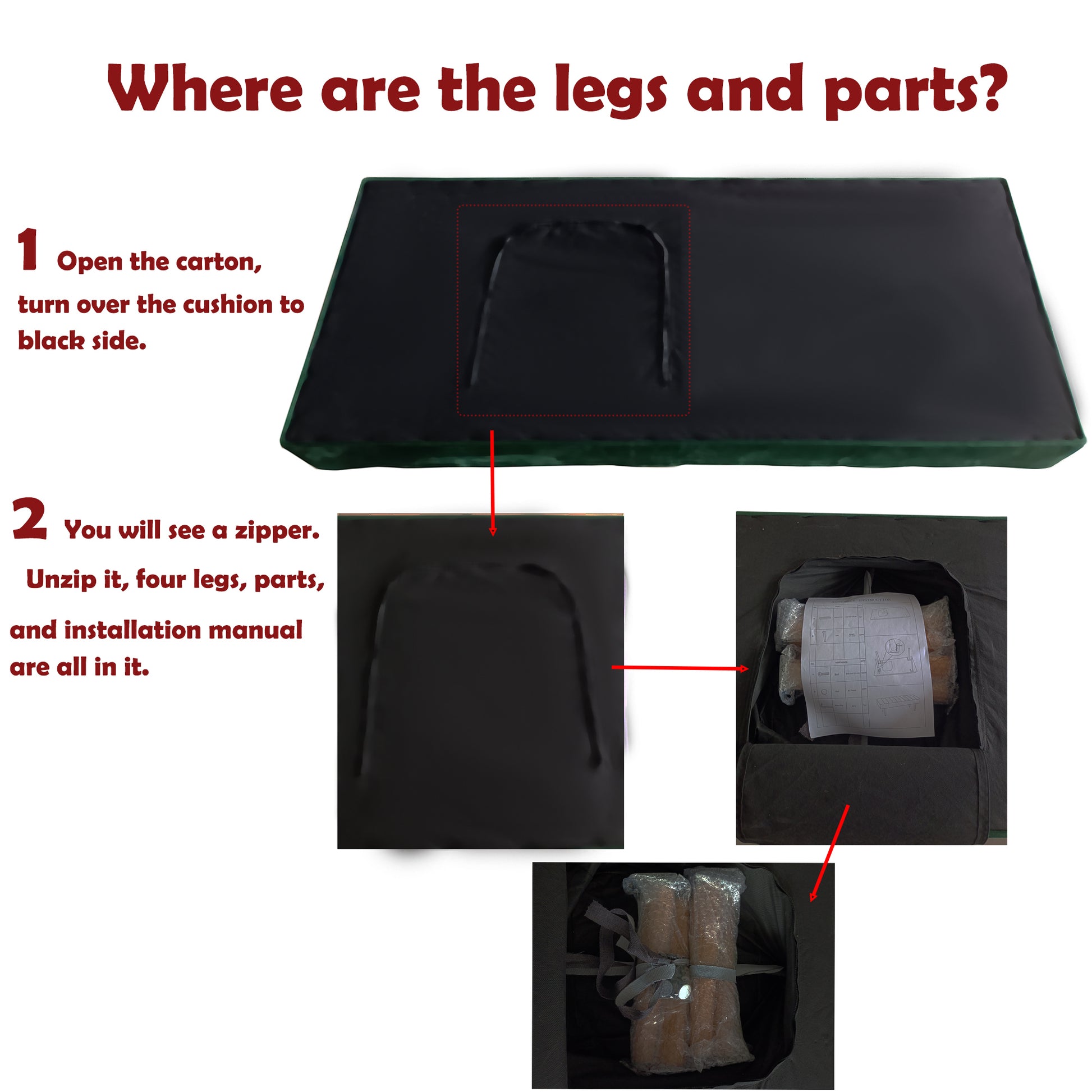 Open the carton and turn over the cushion from green side to black side. You will find a zipper, unzip it, four legs, screws, parts and instruction are all in it. Install the four legs with screws, then enjoy your bench!