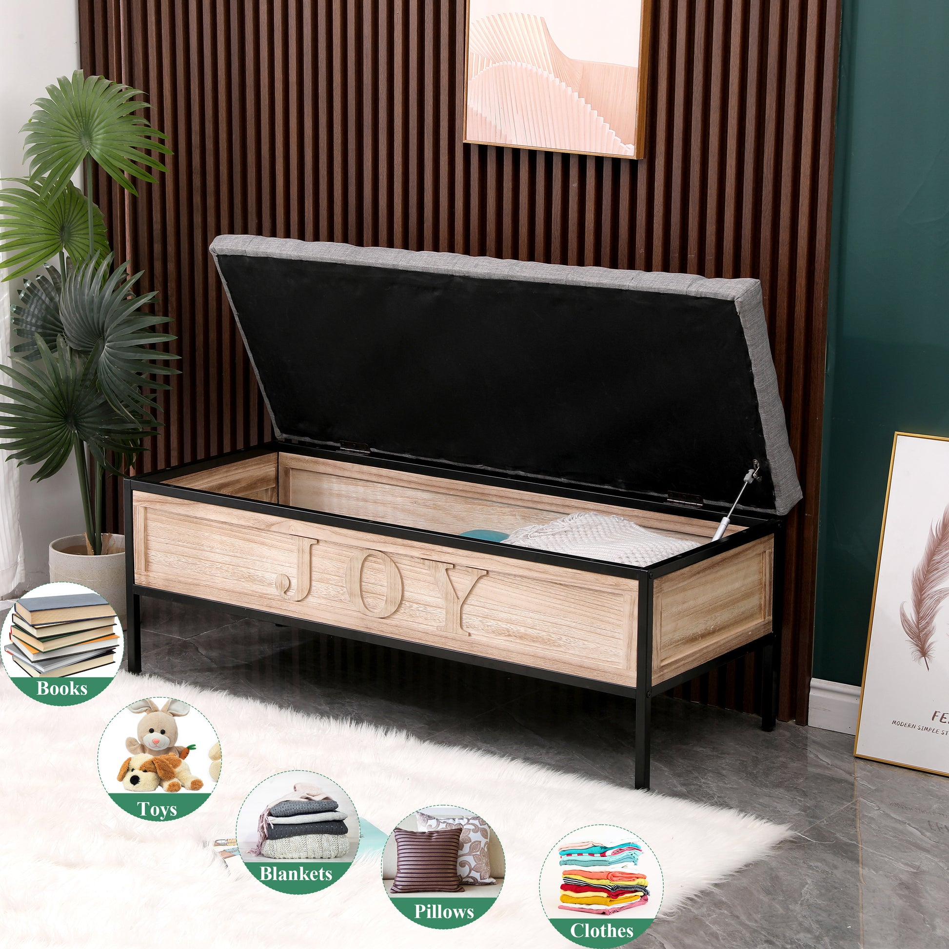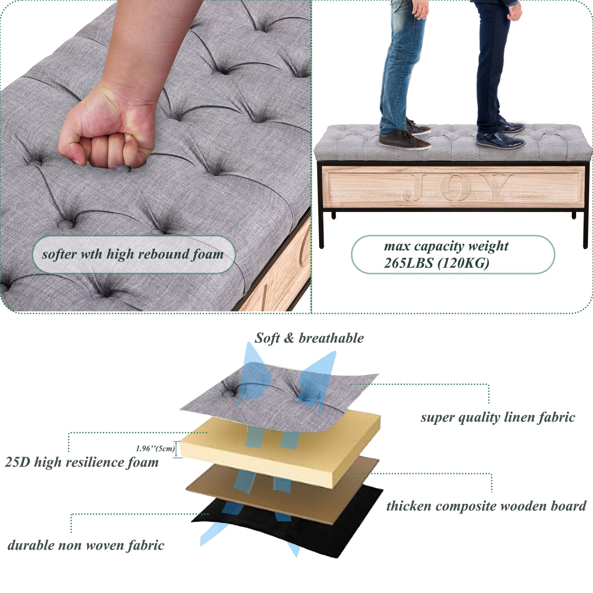 - Premium craftsmanship Storage Bench: Crafted with Paulownia wood & metal frame, soft linen and high-density foam, our end of bed bench provides a superior seating experience. Sturdy metal legs add stability while the 2.36'' thick cushion provides maximum comfort. Easily seats up to 265lbs, perfect for your home.