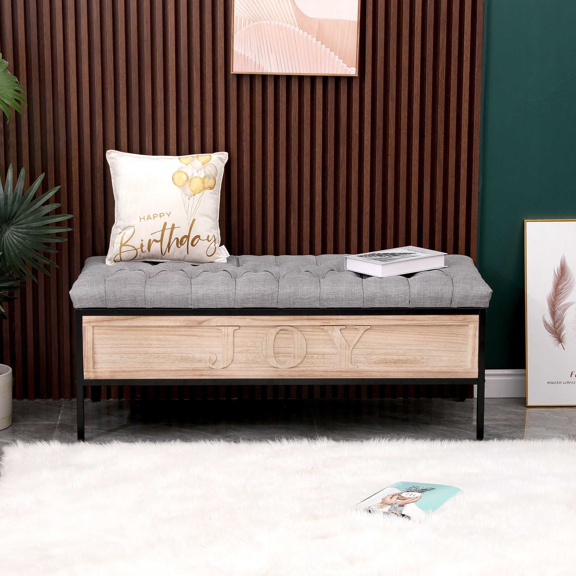 - Unique Design Room Bench: Combining classic and modern design, our linen rectangular bench with metal frame and wooden body boasts a unique look with tufted button detailing at the top. The JOY letters on bench body add a decorative touch that blends in perfectly with any decor.