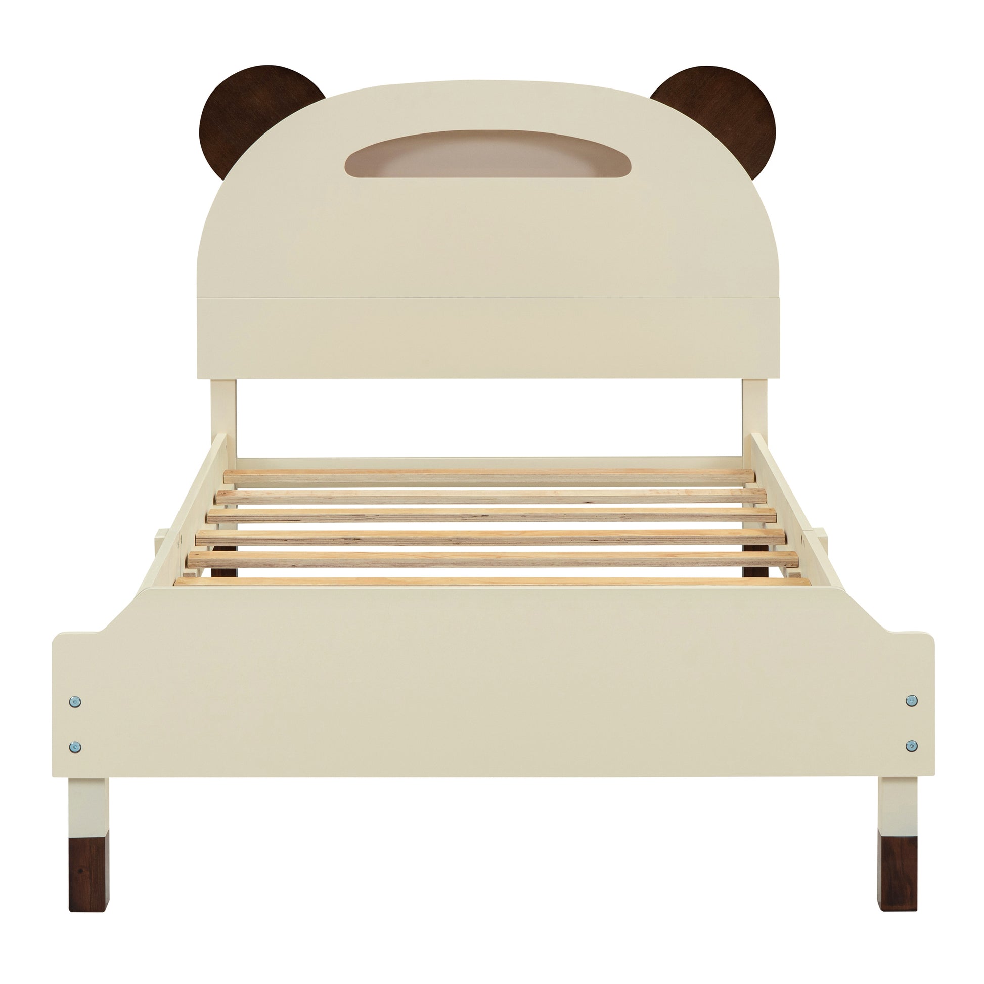 Twin Size Wood Platform Bed with Bear-shaped Headboard,Bed with Motion Activated Night Lights,Cream+Walnut