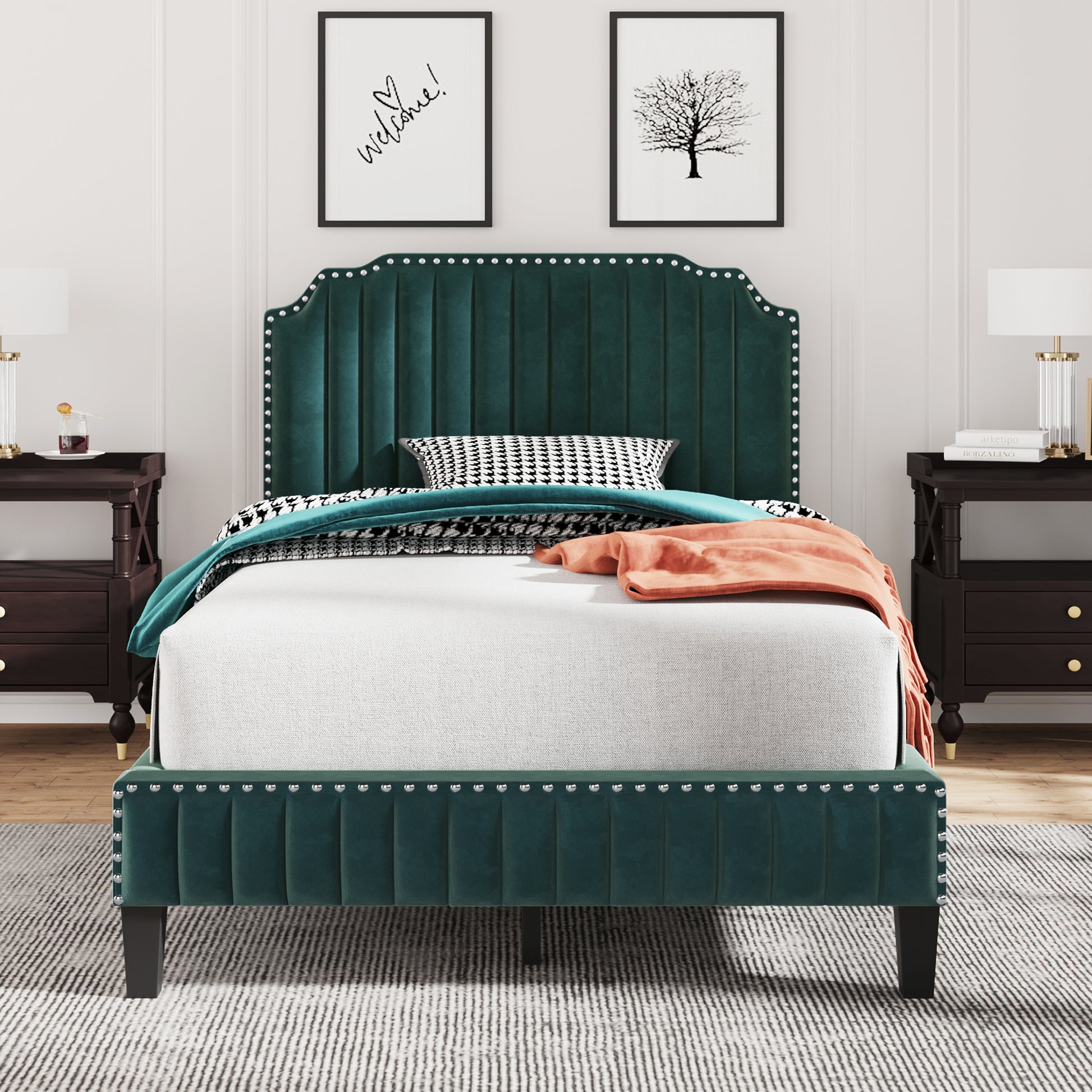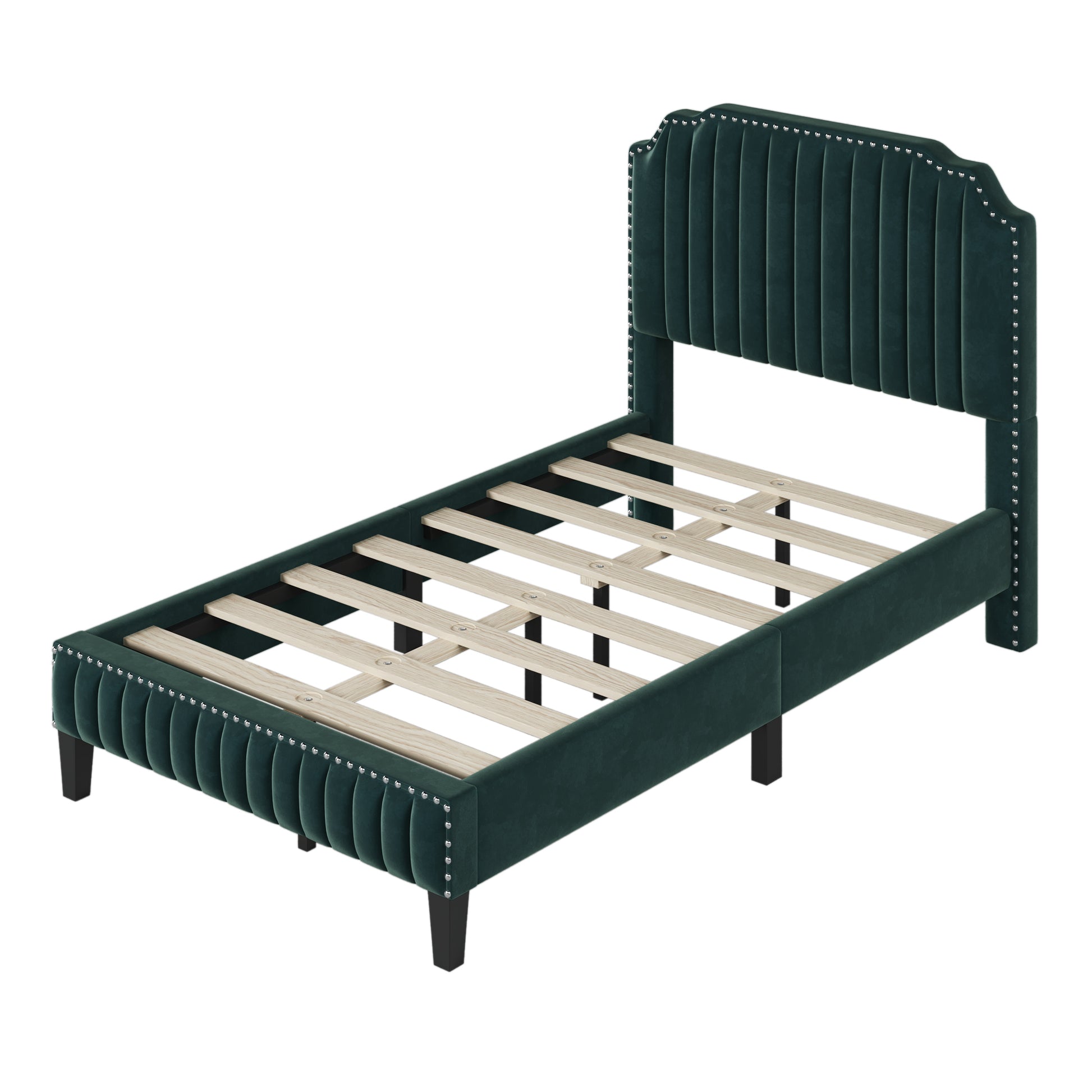 Modern Velvet Curved Upholstered Platform Bed , Solid Wood Frame , Nailhead Trim, Green (Full)