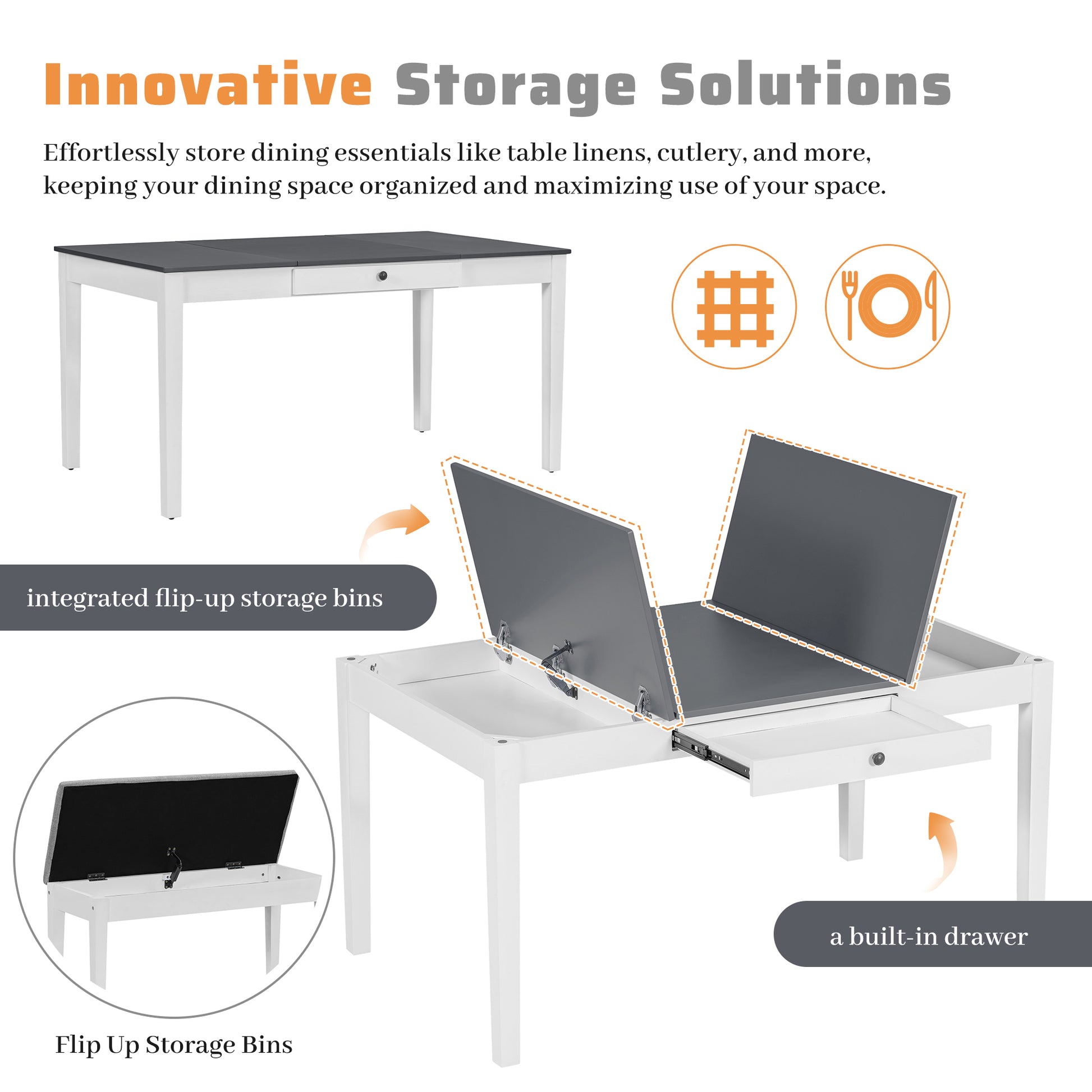 Say goodbye to clutter with cleverly integrated flip-up storage bins on both ends and a built-in drawer. Effortlessly store dining essentials like table linens, cutlery, and more, keeping your dining space organized and maximizing use of your space.
