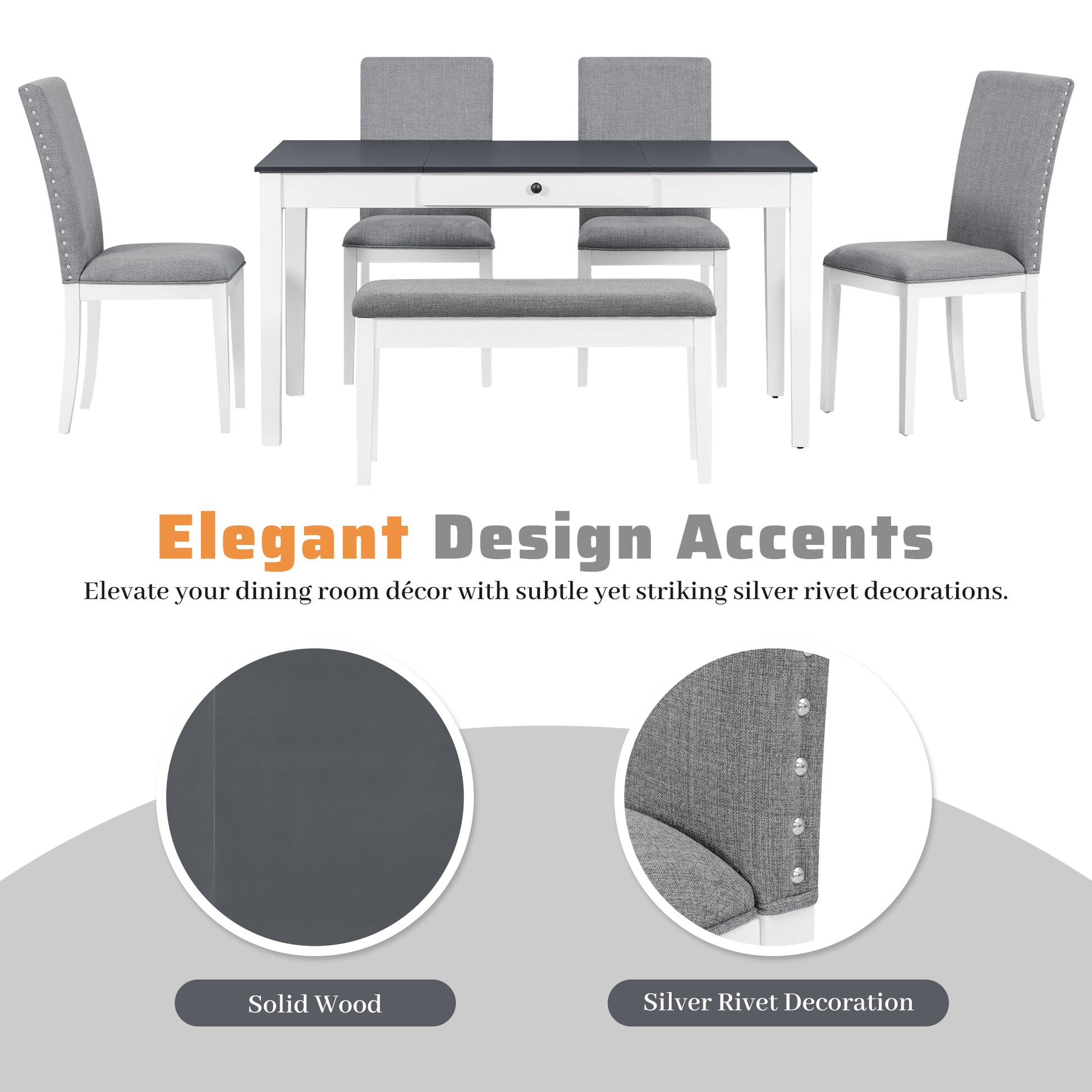 Summary | Enhance your dining experience with this exquisite 6-piece dining set, crafted from solid wood for unmatched durability. Featuring four luxuriously upholstered chairs and a storable padded bench, each piece invites comfort and elegance into your home. The set includes flip-up storage bins on both table ends and a handy storage drawer, perfect for tucking away dining essentials. Silver rivet decorations add a touch of sophistication, while the choice of two colors ensures the perfect match for any decor. |