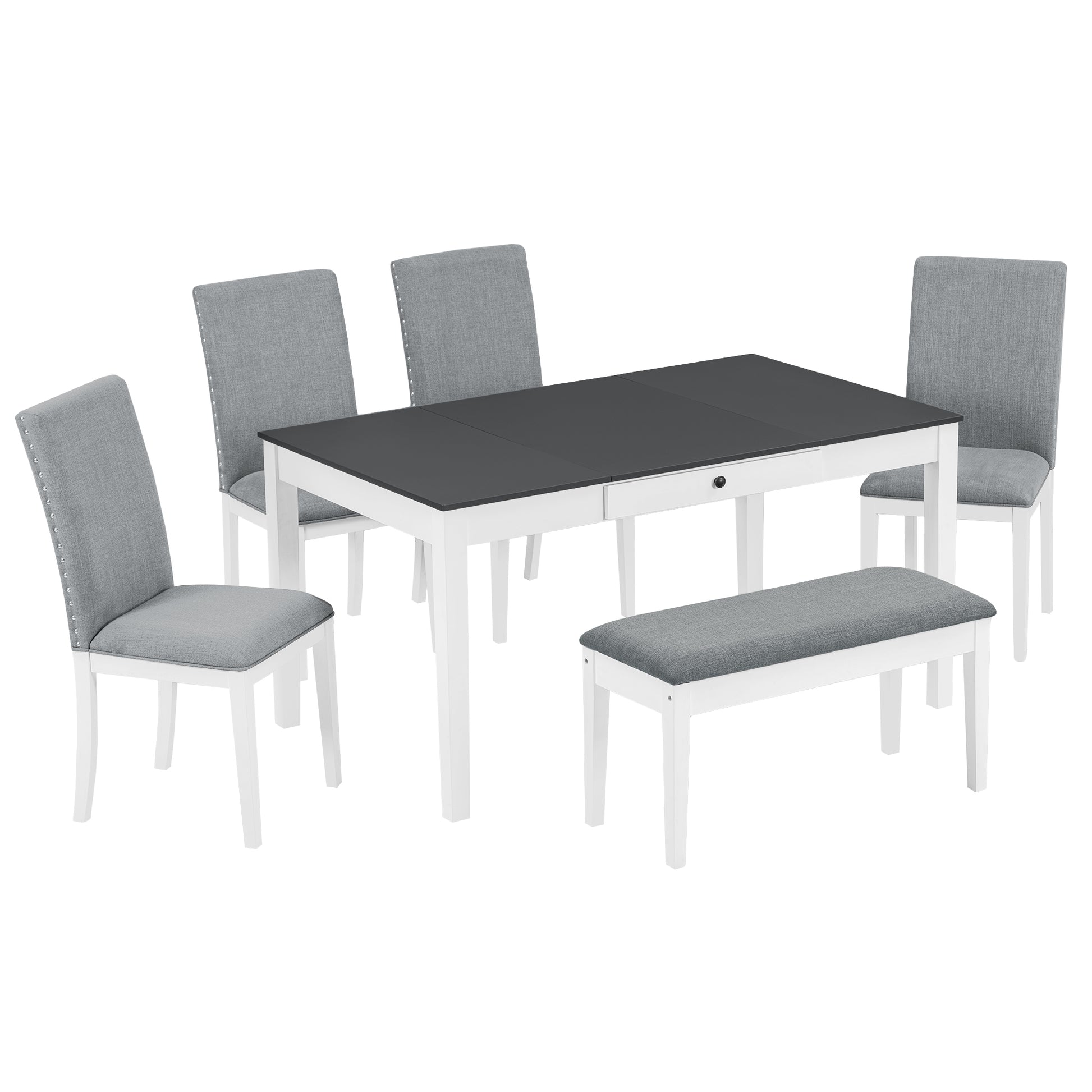 TOPMAX Farmhouse 6-Piece Dining Table Set with Storage Table, Kitchen Table Set with Drawer, Storable Bench and Upholstered Dining Chairs, White+Gray