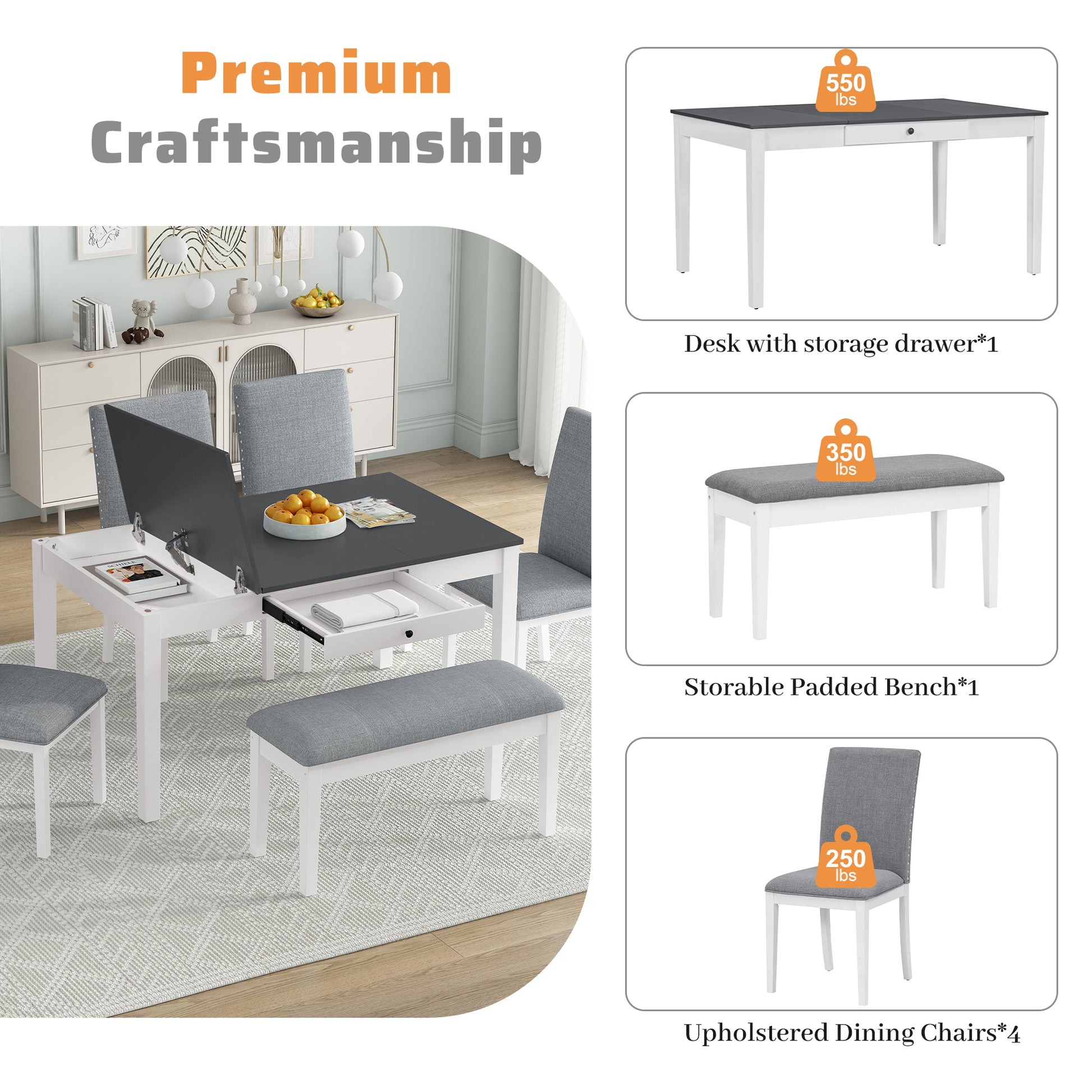 - [Premium Craftsmanship] Crafted from premium solid rubberwood, this 6-piece dining set ensures durability and stability for everyday use. Each table can hold 550lbs while each chair and bench can hold up to 250lbs and 350lbs. Its expert construction guarantees reliability, providing a sturdy foundation for memorable dining experiences with family and friends.