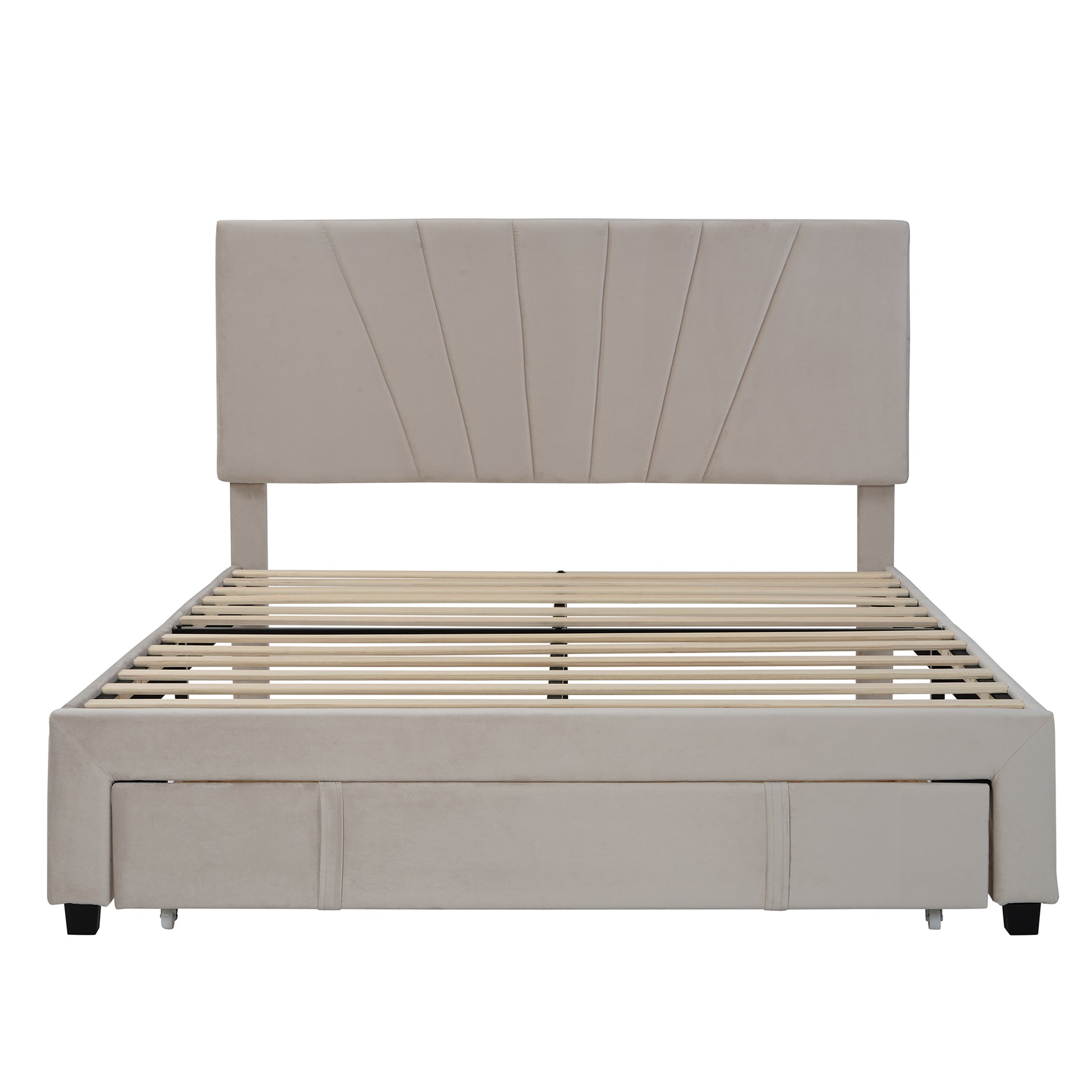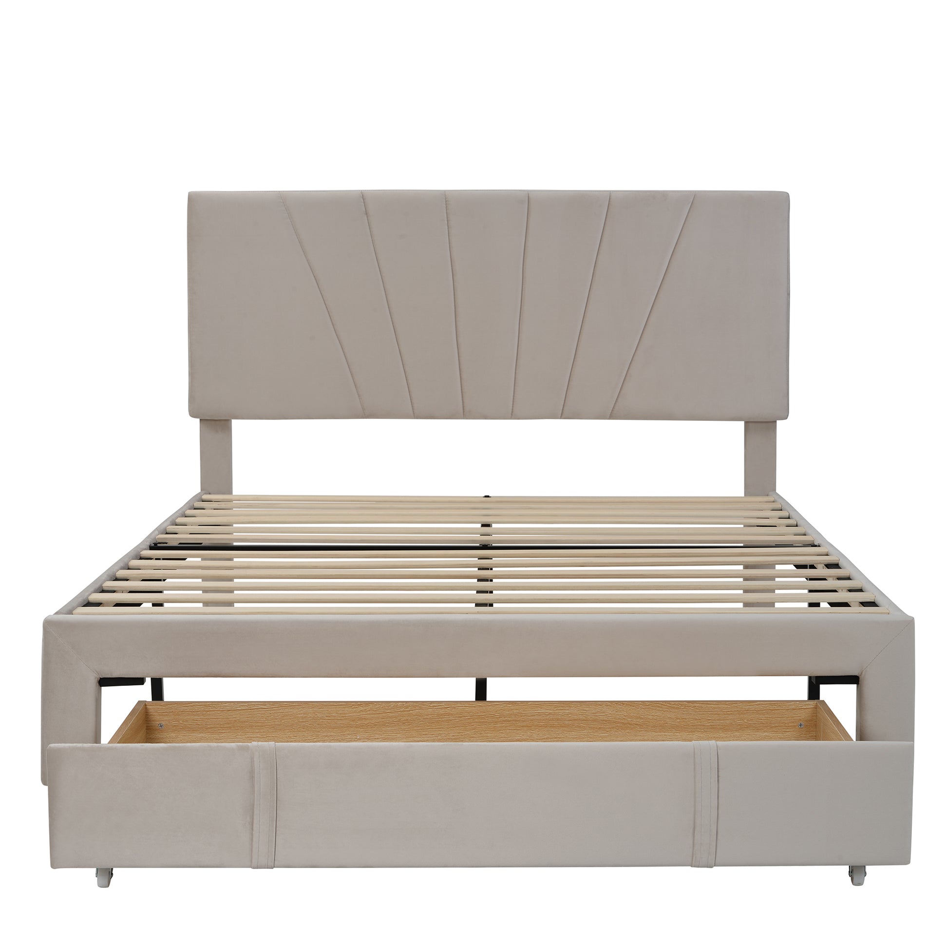 Queen Size Storage Bed Velvet Upholstered Platform Bed with a Big Drawer - Beige