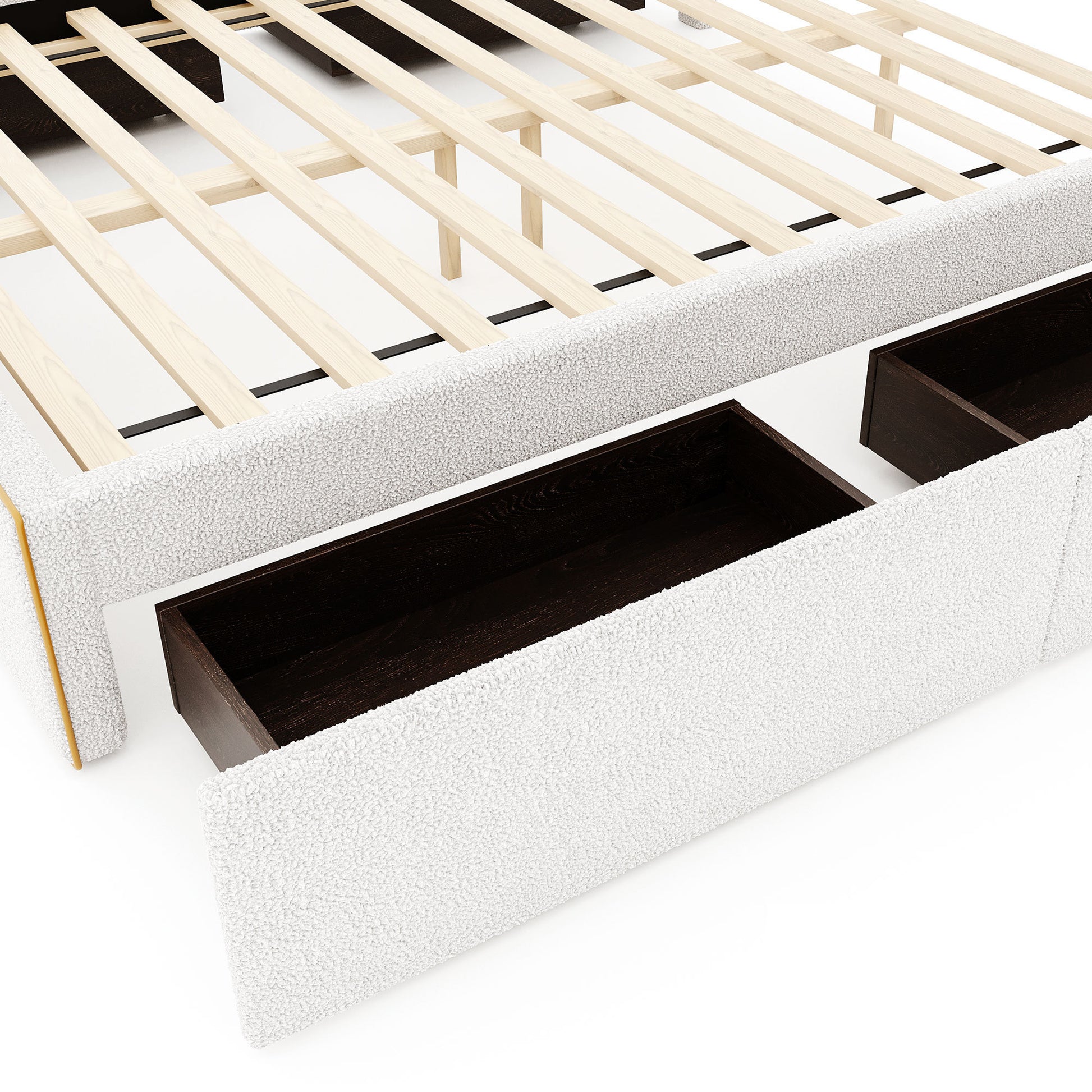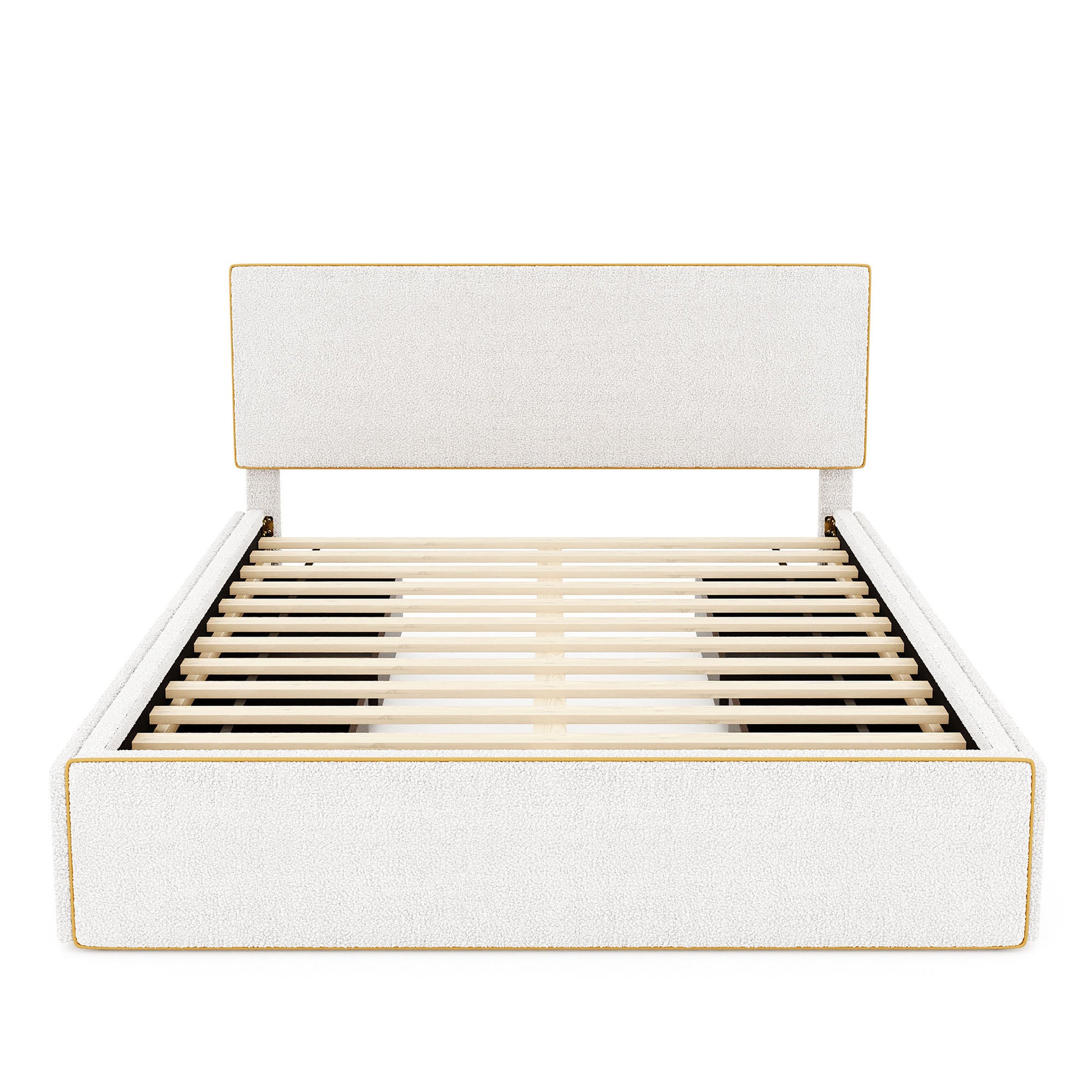 Queen Size Upholstered Platform Bed with 4 Drawers and Golden Edge on the Headboard & Footboard, White