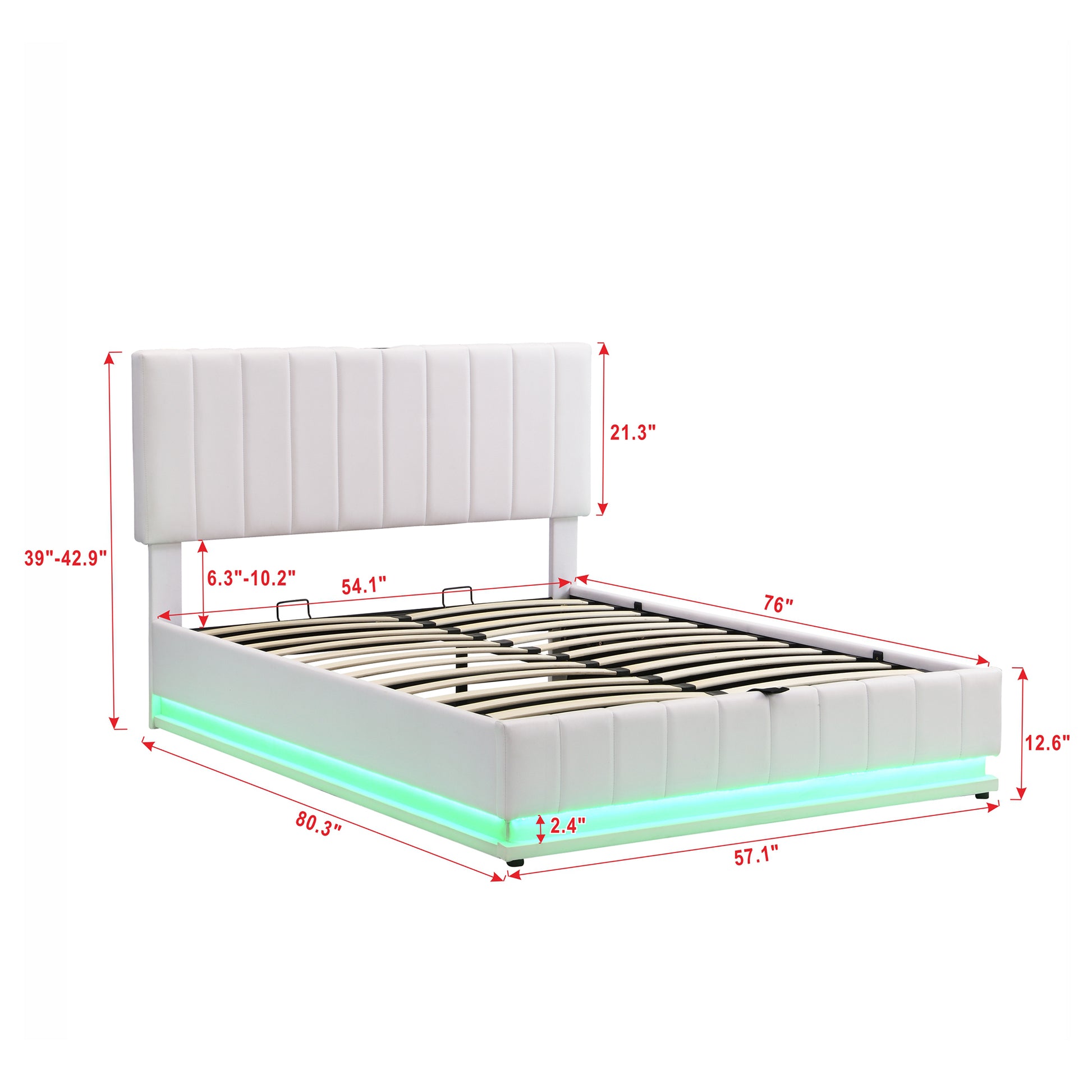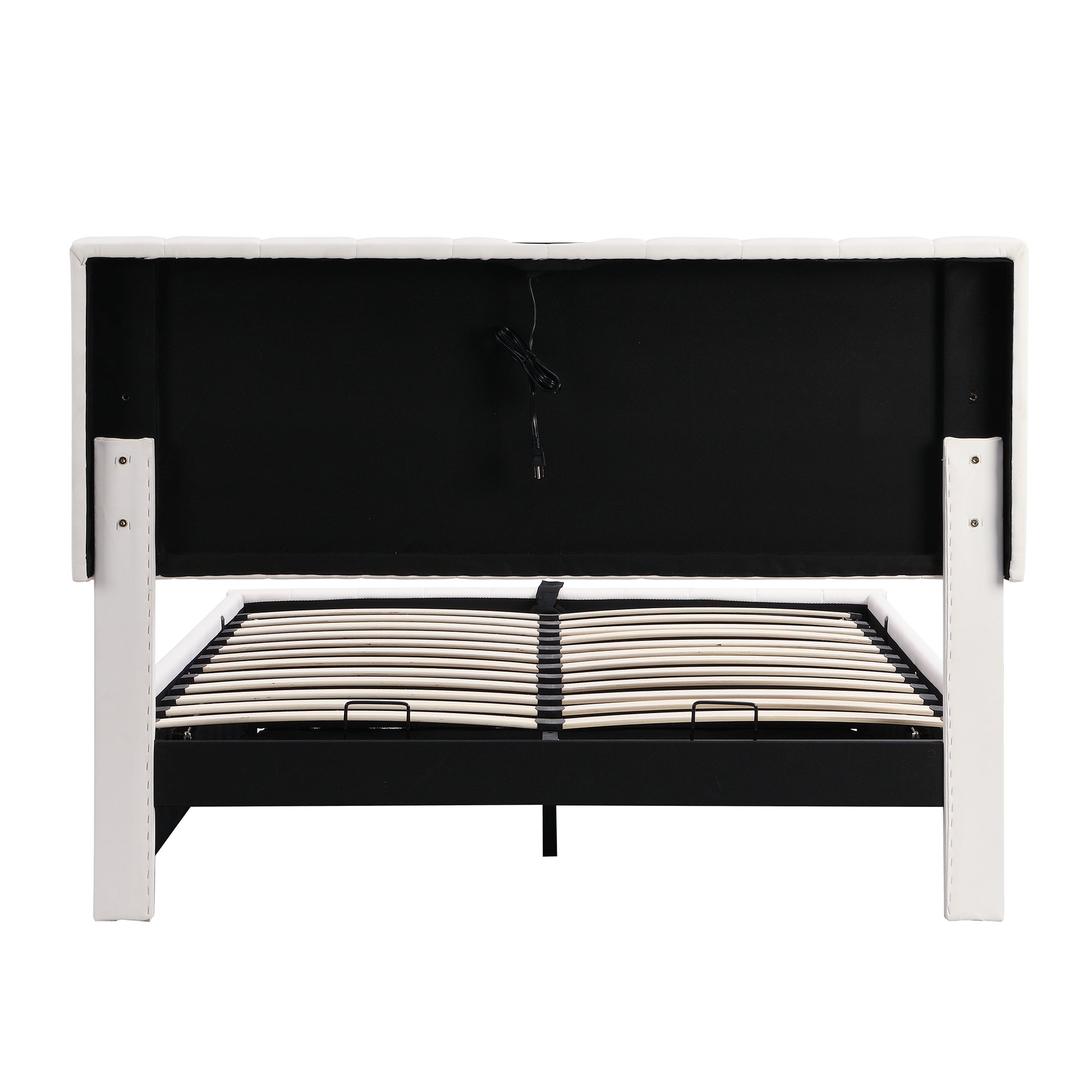 This beautiful Upholstered Platform Bed which features modern hydraulic storage system and sensor lights adds a contemporary chic look to your bedroom and filled in thick foam to add extra comfort. Our platform bed frame is equipped with latest RGB light bars.It includes 16 colors of LED lights and 4 lighting patterns. Colorful lights make your life colorful, you can change lights by remote control at ease. A hydraulic storage system underneath the mattress makes storing your bedroom things in smaller spaces possible without compromising the size of bed you want. What's more, a set of two sockets and USB Ports is equipped above the headboard for your convenience.