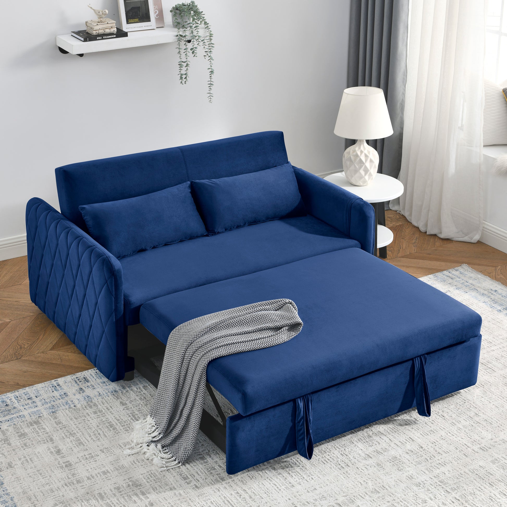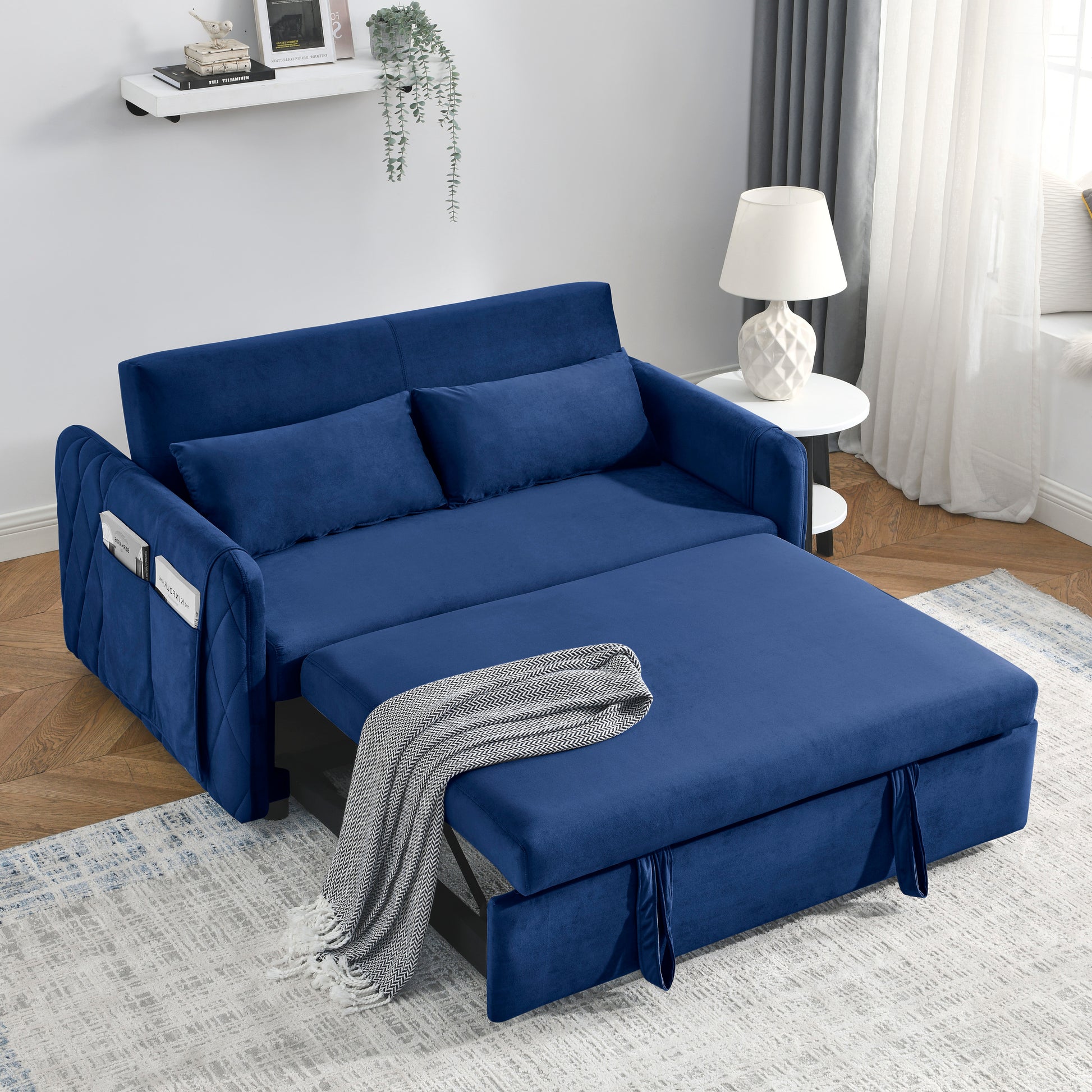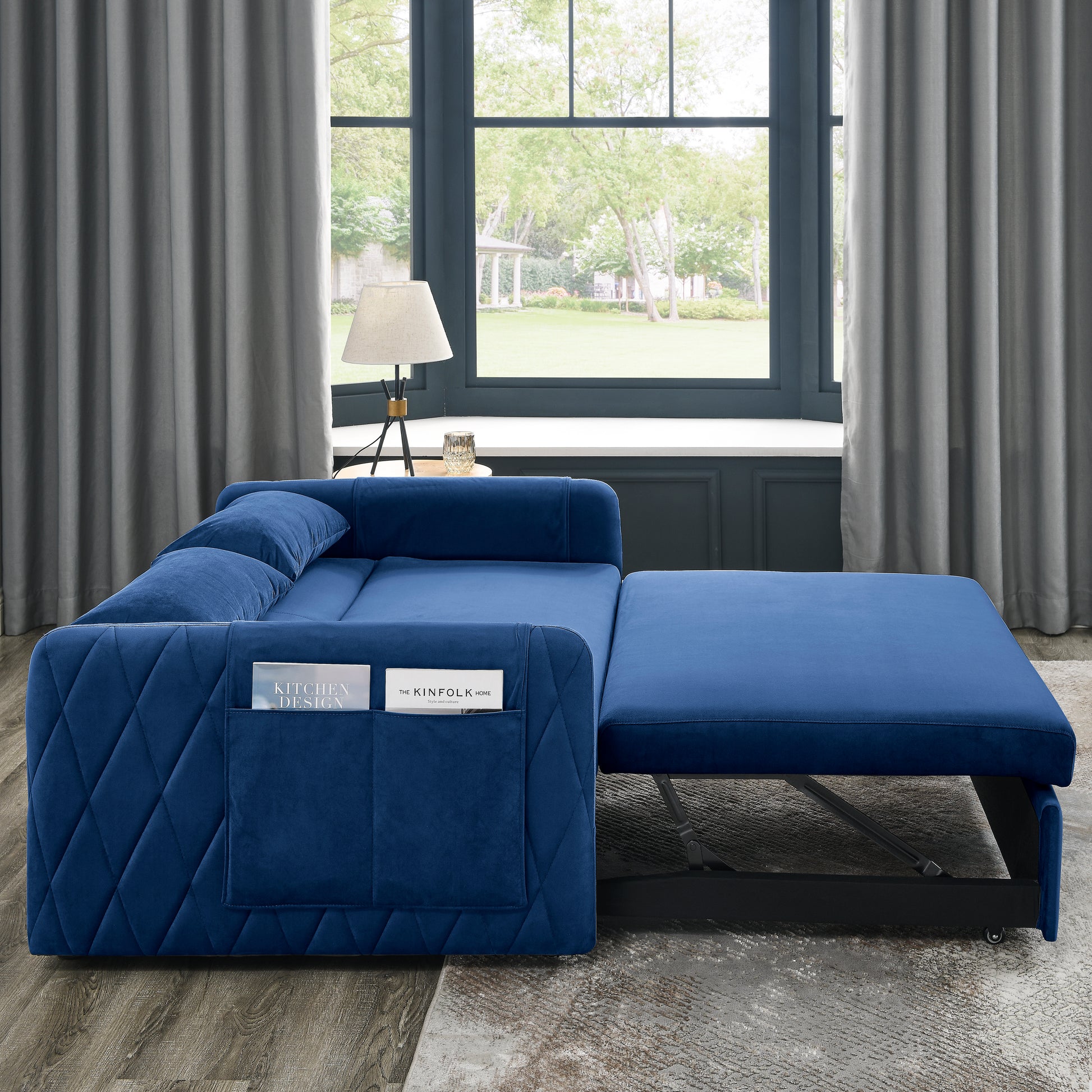 55" Modern Convertible Sofa Bed with 2 Detachable Arm Pockets, Velvet Loveseat Sofa with Pull Out Bed, 2 Pillows and Living Room Adjustable Backrest, Grid Design Armrests
