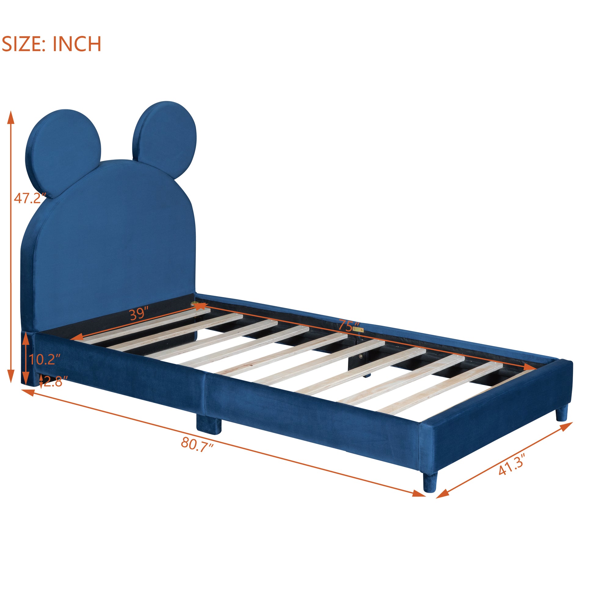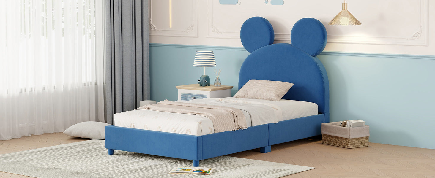 Twin Size Upholstered Platform Bed with Bear Ear Shaped Headboard, Blue