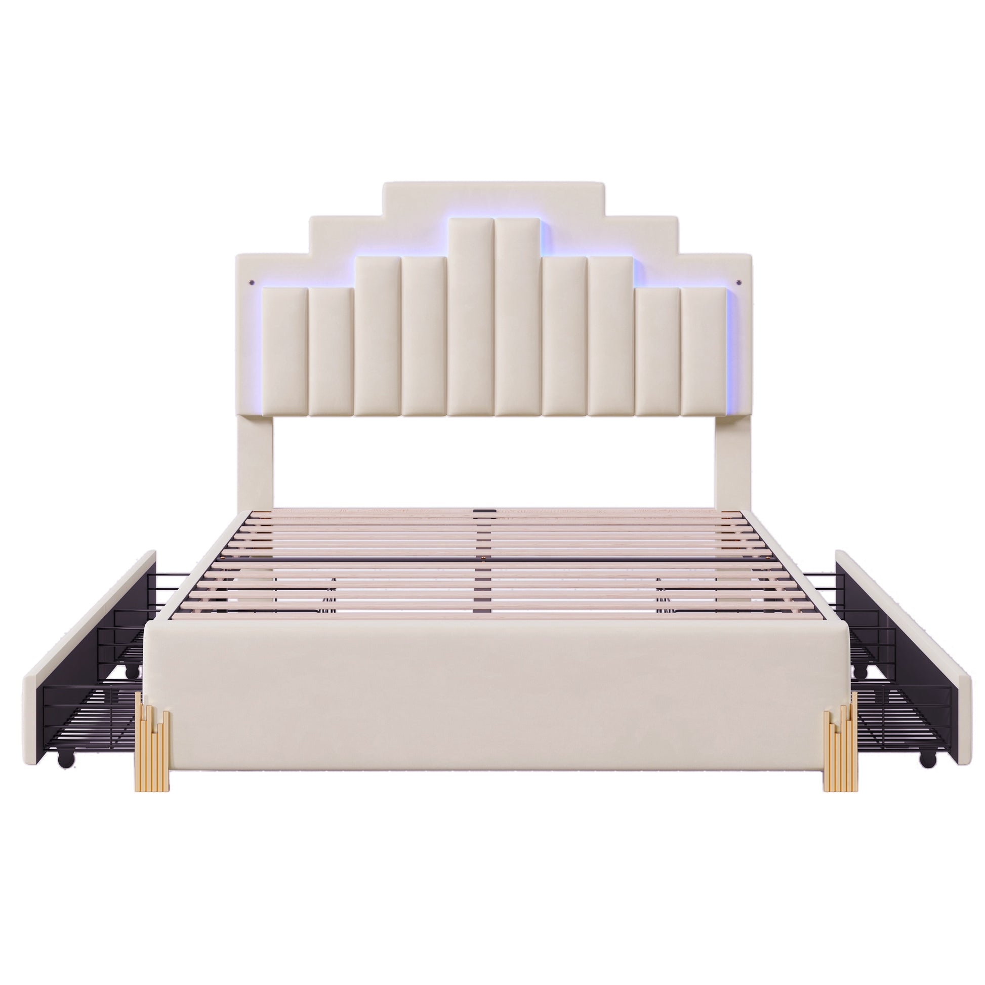 Full Size Upholstered Platform Bed with LED Lights and 4 Drawers, Stylish Irregular Metal Bed Legs Design, Beige