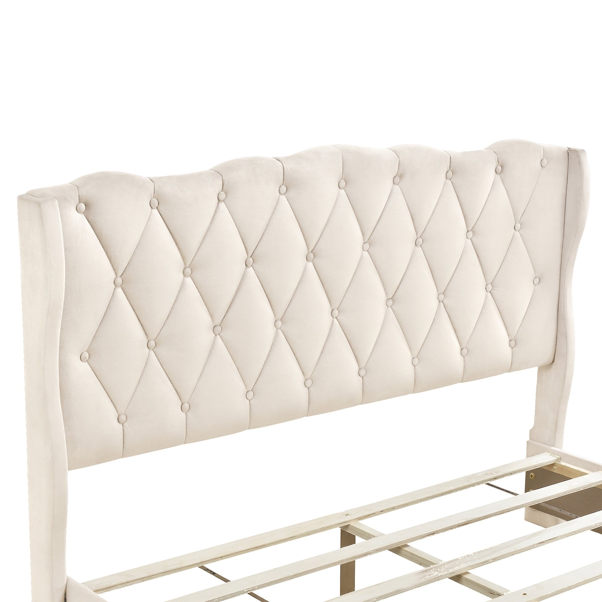 Upholstered Platform Bed with Tufted Headboard and 3 Drawers, No Box Spring Needed, Velvet Fabric, Queen Size Beige