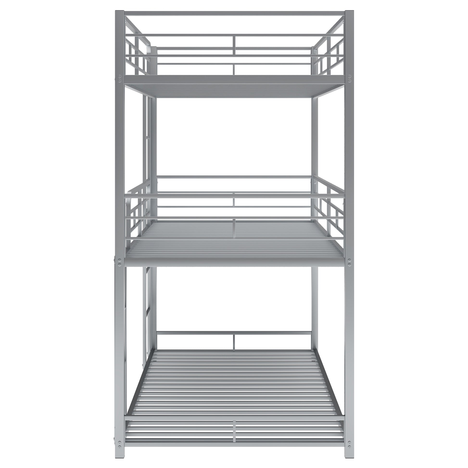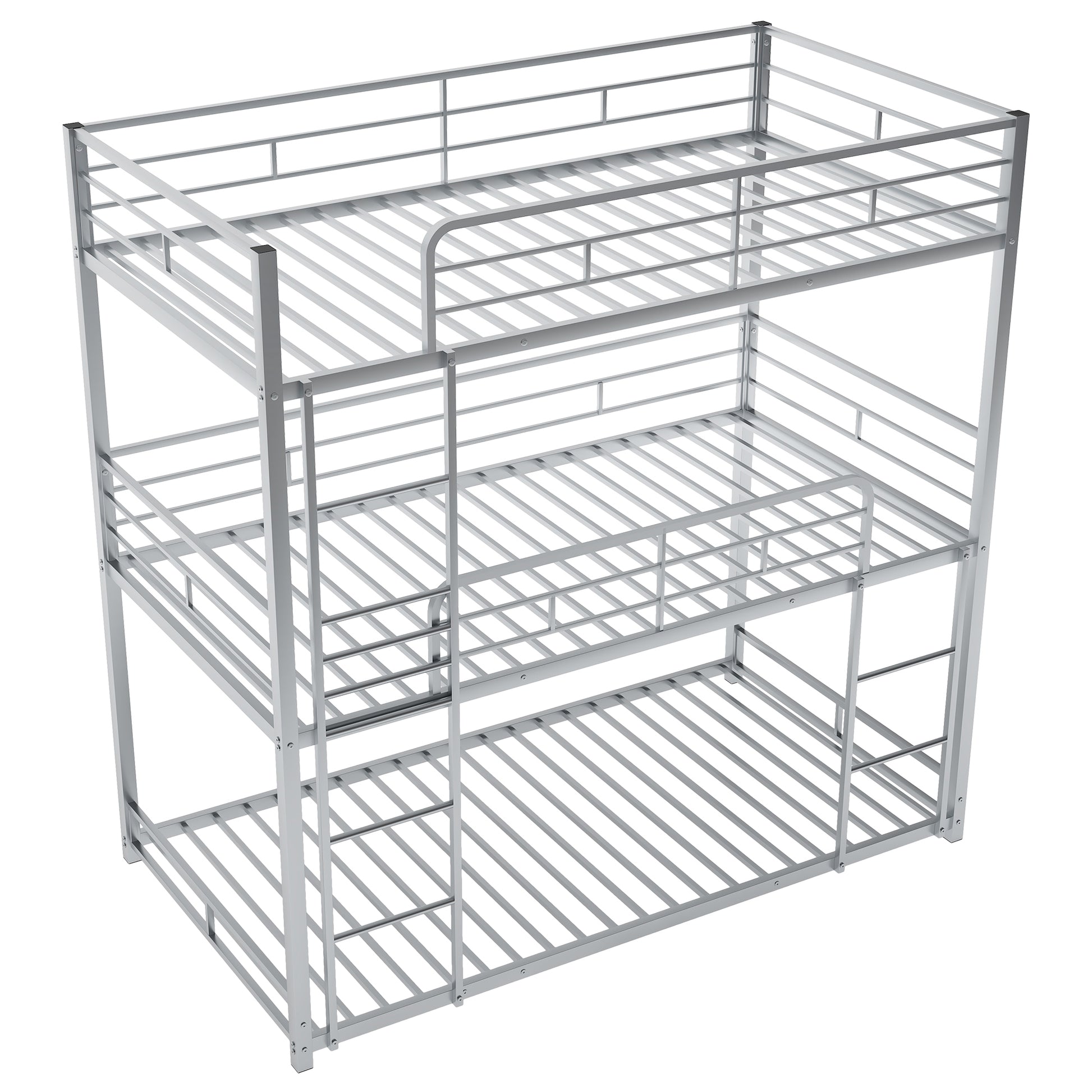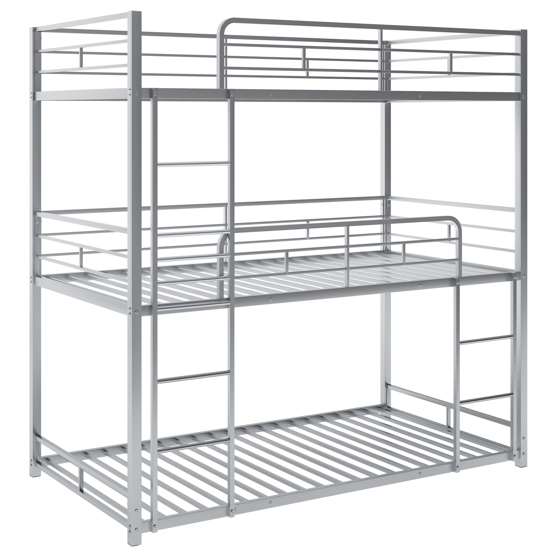 This triple bunk bed is perfect for family which has multiple members. Bunk design is space-saving and two ladders are attached to bed which provides easy access to top bed and middle bed. Constructed with heavy duty metal, the stacking three beds is securely strong and steady. Equipped with easy access slat guardrails keep your members snug and secure. With space-saving design and sturdy construction, this bed will provide great experience.
