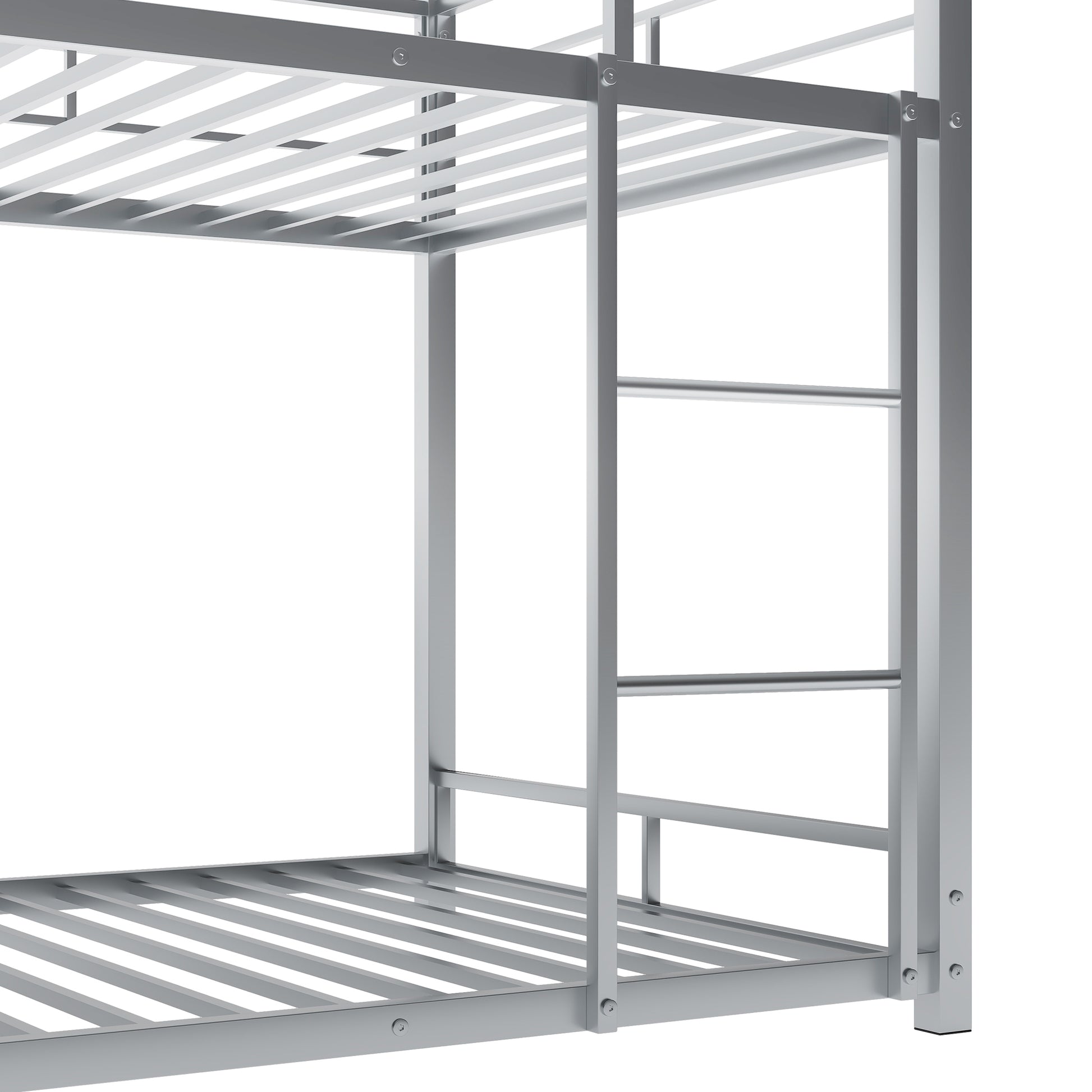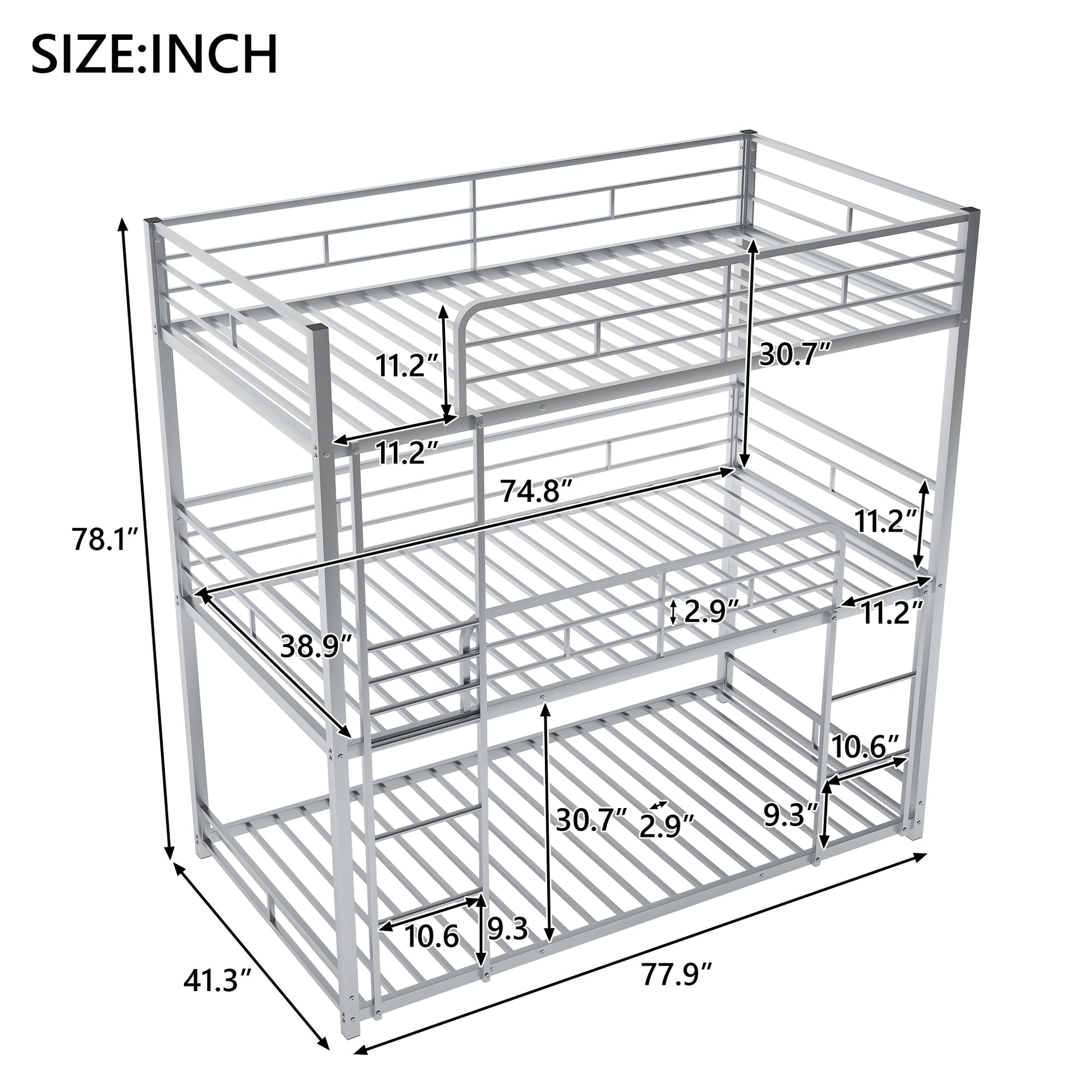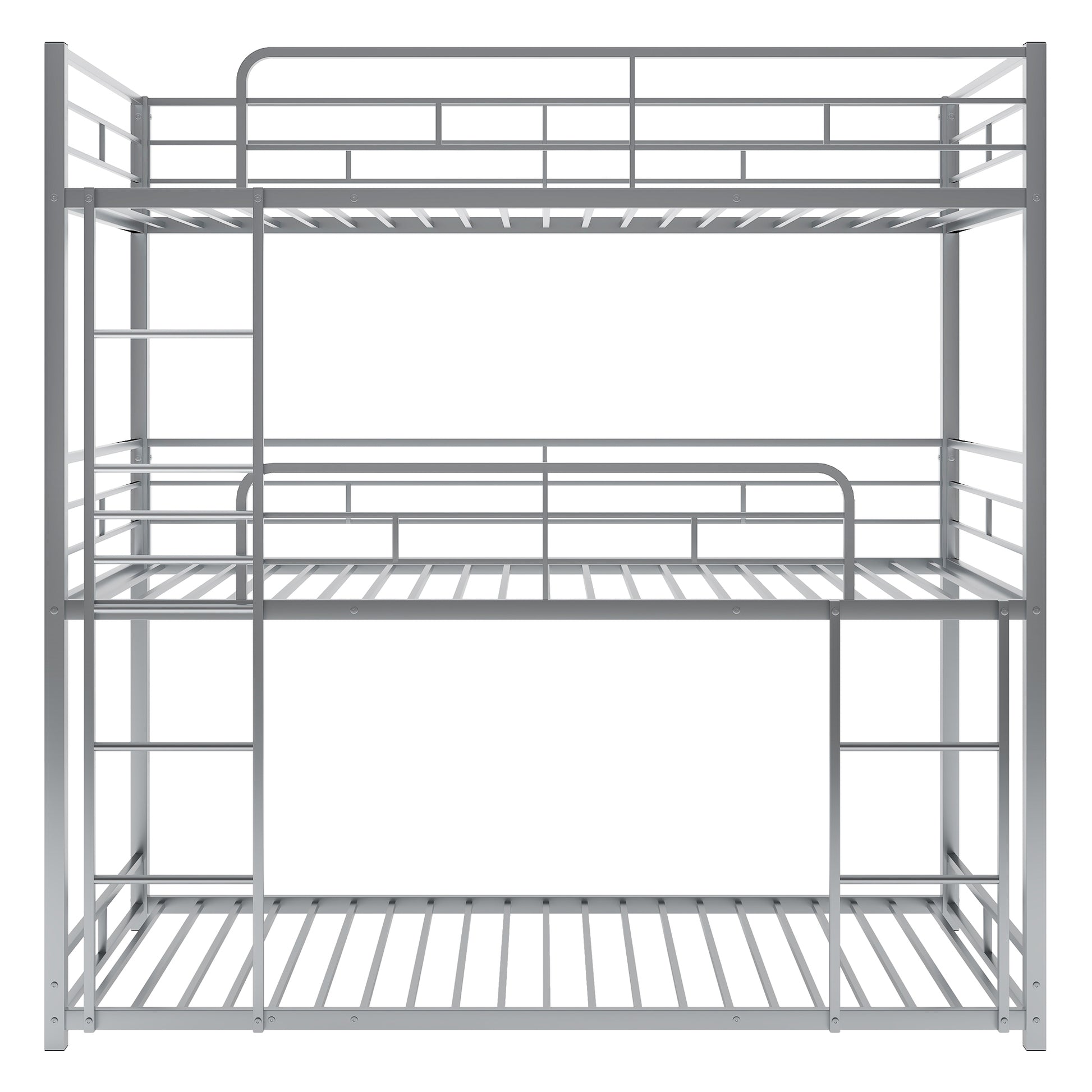 This triple bunk bed is perfect for family which has multiple members. Bunk design is space-saving and two ladders are attached to bed which provides easy access to top bed and middle bed. Constructed with heavy duty metal, the stacking three beds is securely strong and steady. Equipped with easy access slat guardrails keep your members snug and secure. With space-saving design and sturdy construction, this bed will provide great experience.