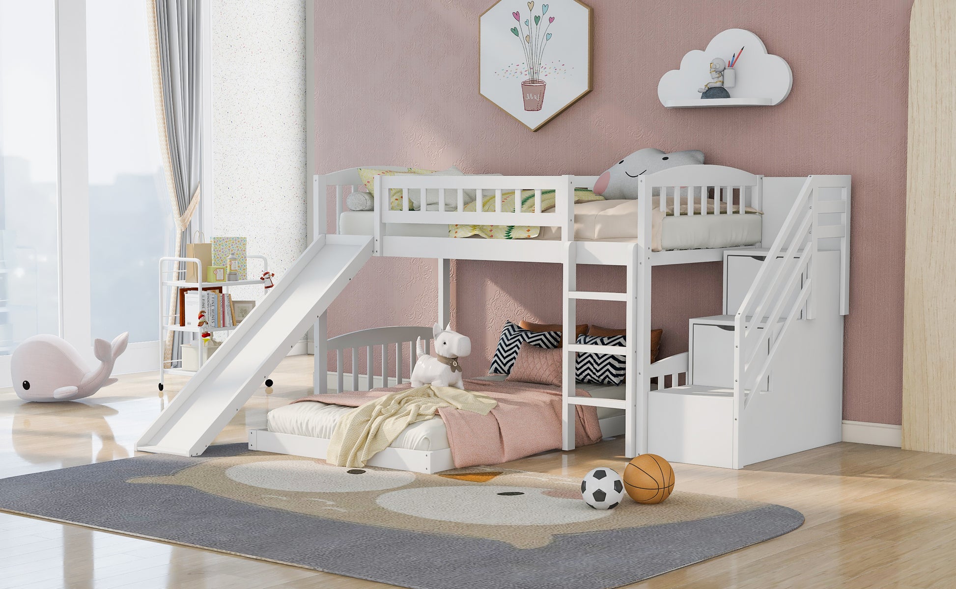 - [Convertible Ladder and Slide] With built-in ladder and staircase, it is easy for you to climb up and down from the top bed. Featuring a low slide for you to play, this bunk bed can add fun to you and develop your sense of balance and coordination. The slide and the ladder are convertible, both of them can be put left or right. What's more, the staircase with drawers can be put left or right.