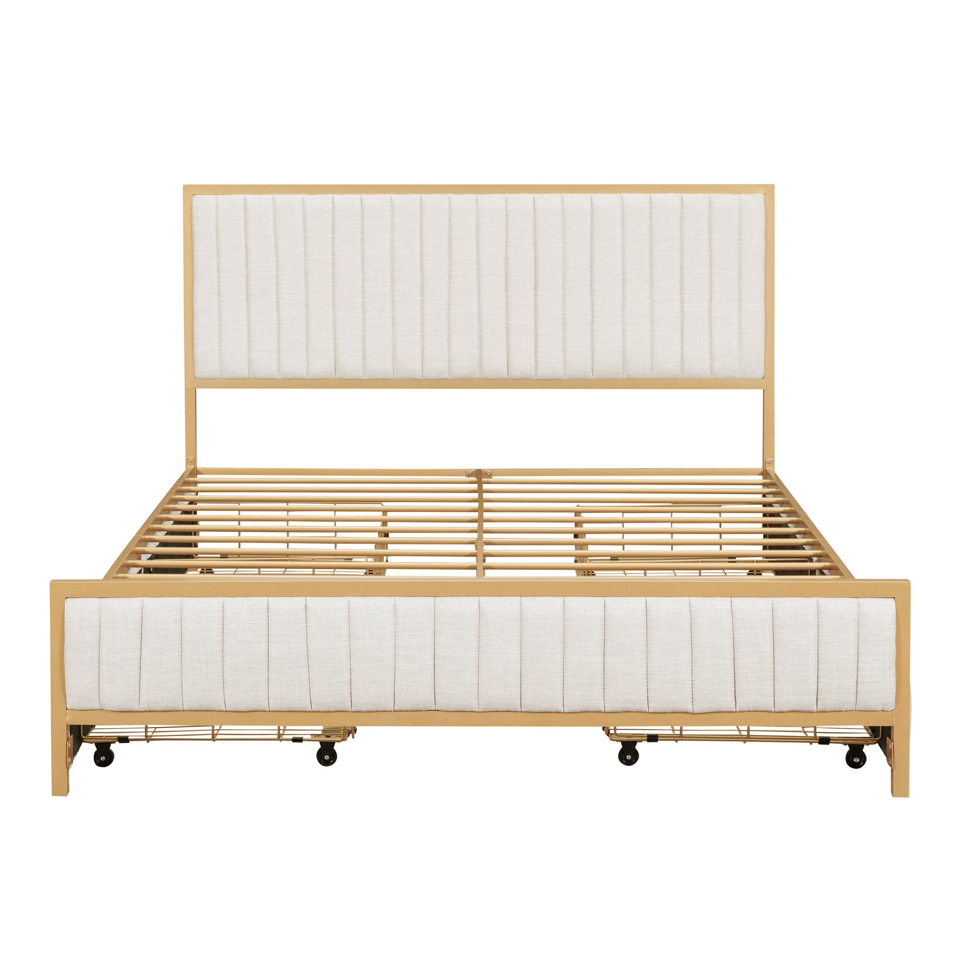This beautiful metal frame upholstered platform Bed features upholstered headboard that adds a contemporary chic look to your bedroom and filled in thick foam to add extra comfort. Sturdy metal frame construction and a metal slat system to add extra stability and safety.And the 4 big drawers underneath the bed can easily be pulled in and out for maximum storage space, perfect for organizing anything from clothes and bed linens to toys and games.This beautiful Upholstered Platform Bed will certainly be a beautiful and practical piece in your bedroom.