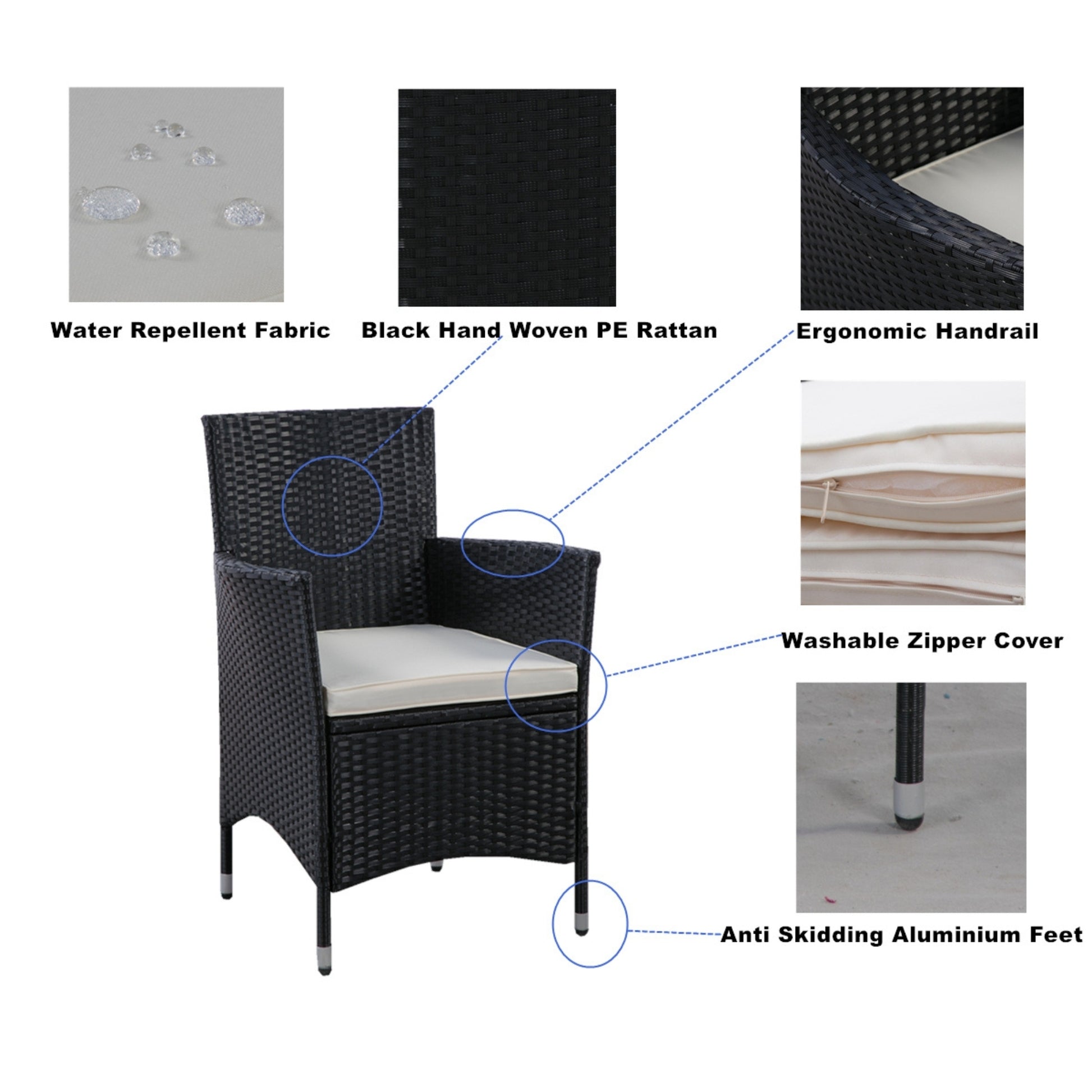 Constructed with durable powder-coated galvanize steel frames and woven PE rattan to make the table and chairs durable enough for long time use. Table and front chair leg come with adjustable feet to suit all floor condition