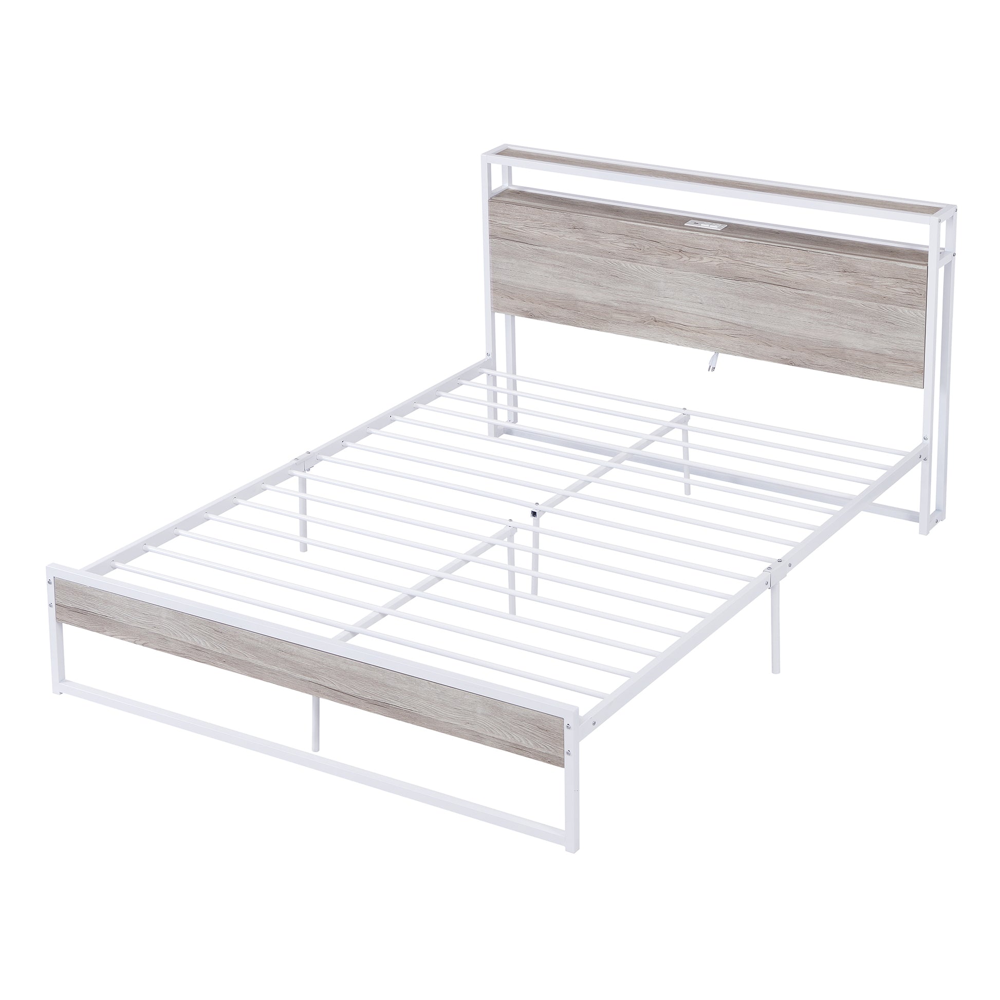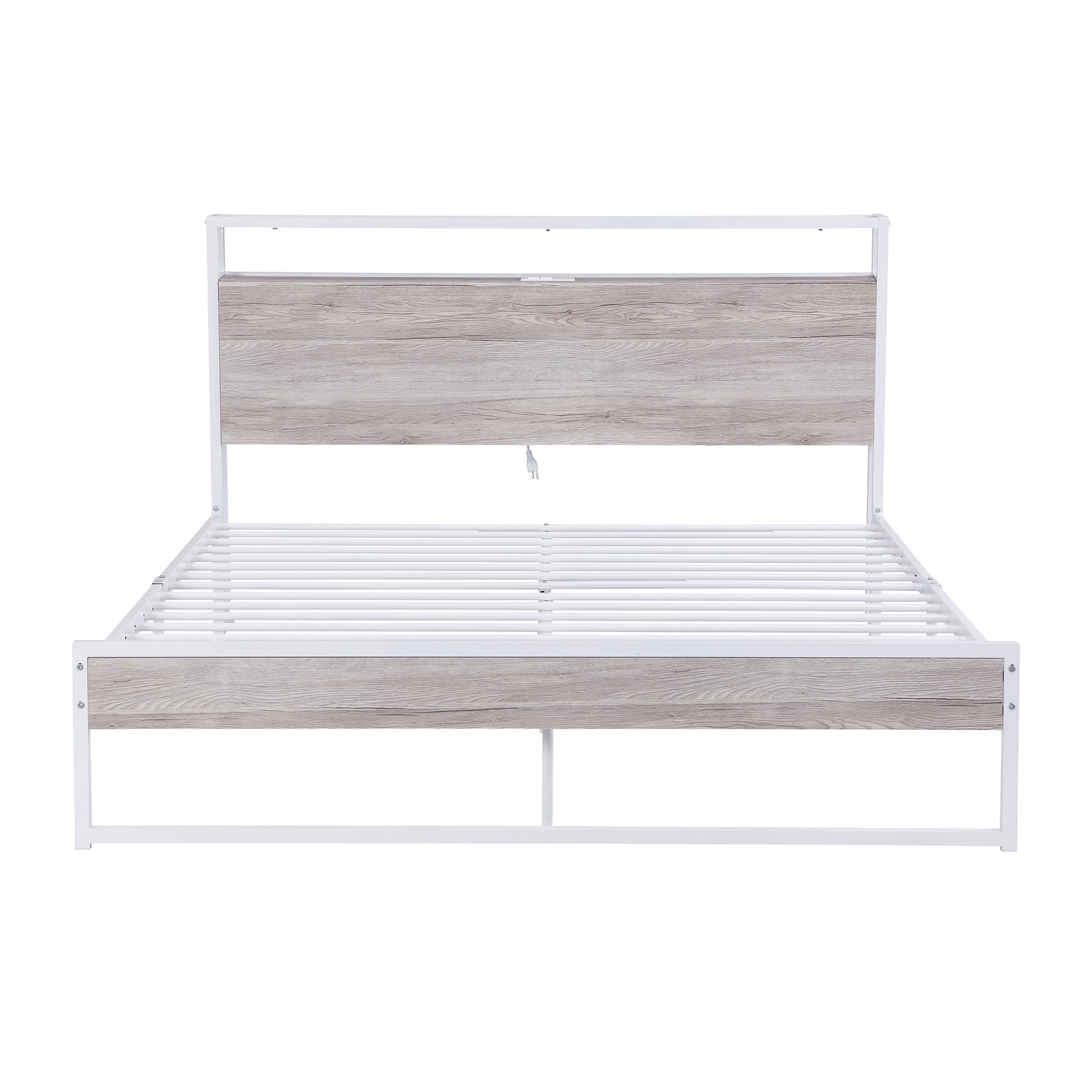 Queen Size Metal Platform Bed Frame with Sockets, USB Ports and Slat Support ,No Box Spring Needed White