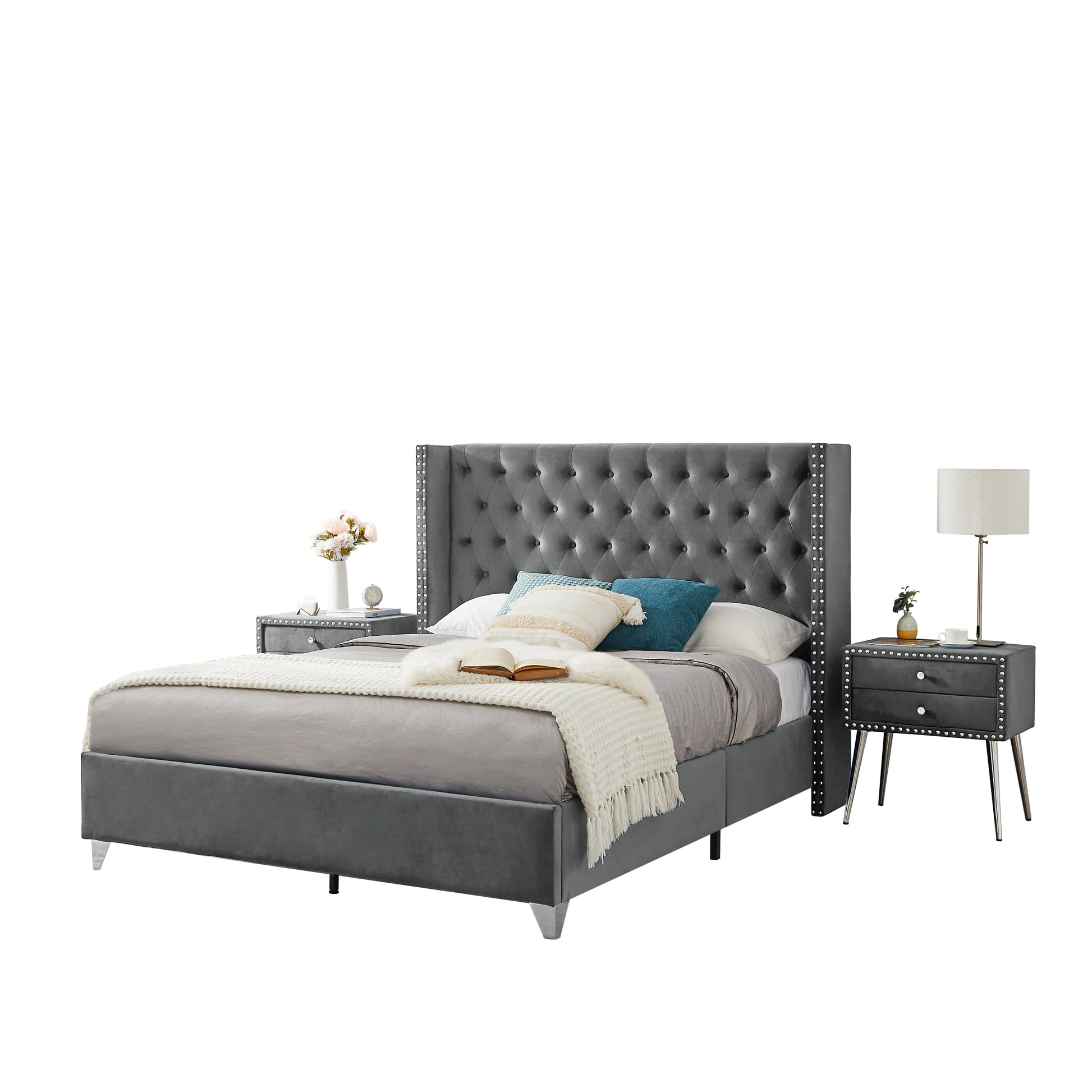 B100S Queen bed with two nightstands, Button designed Headboard,strong wooden slats + metal legs with Electroplate
