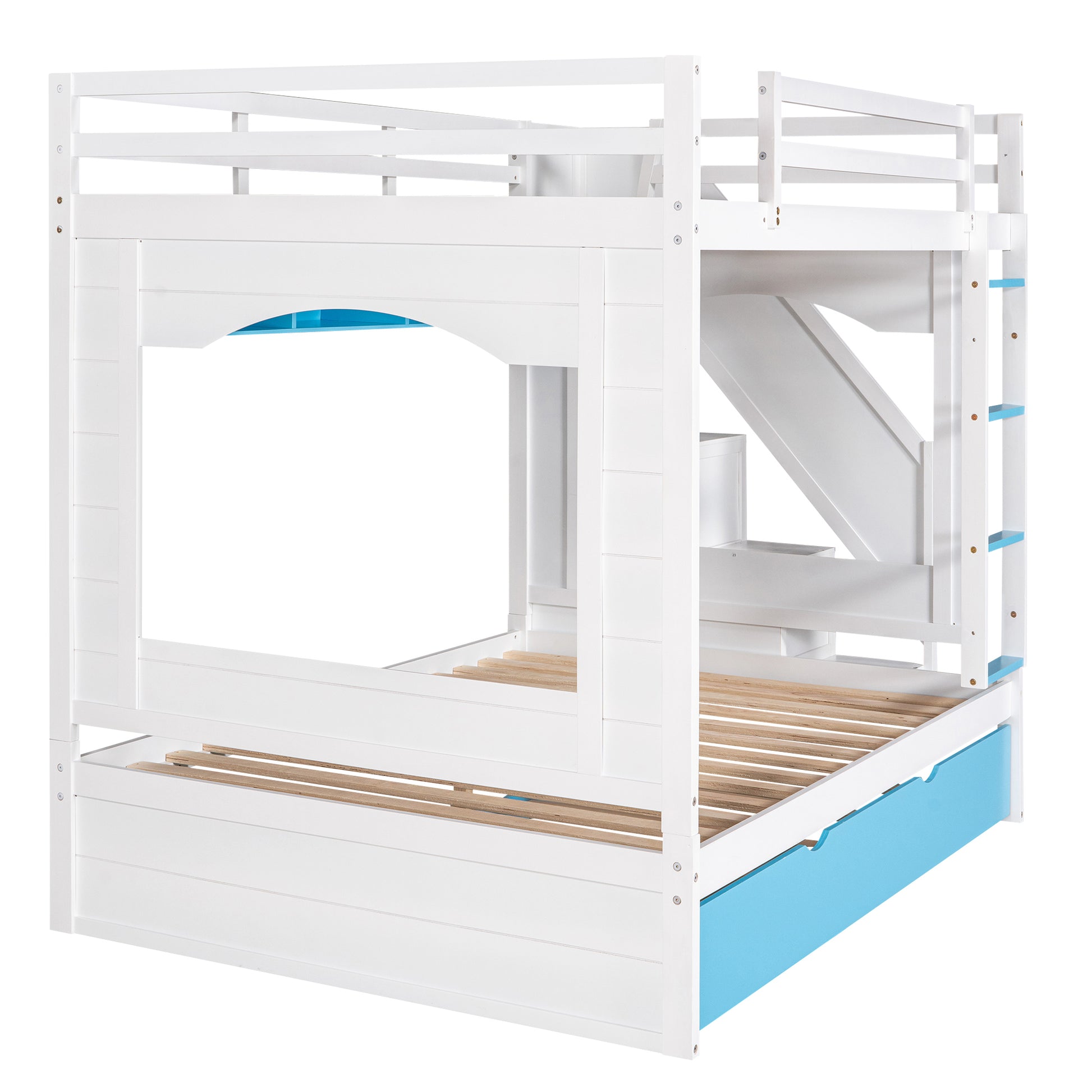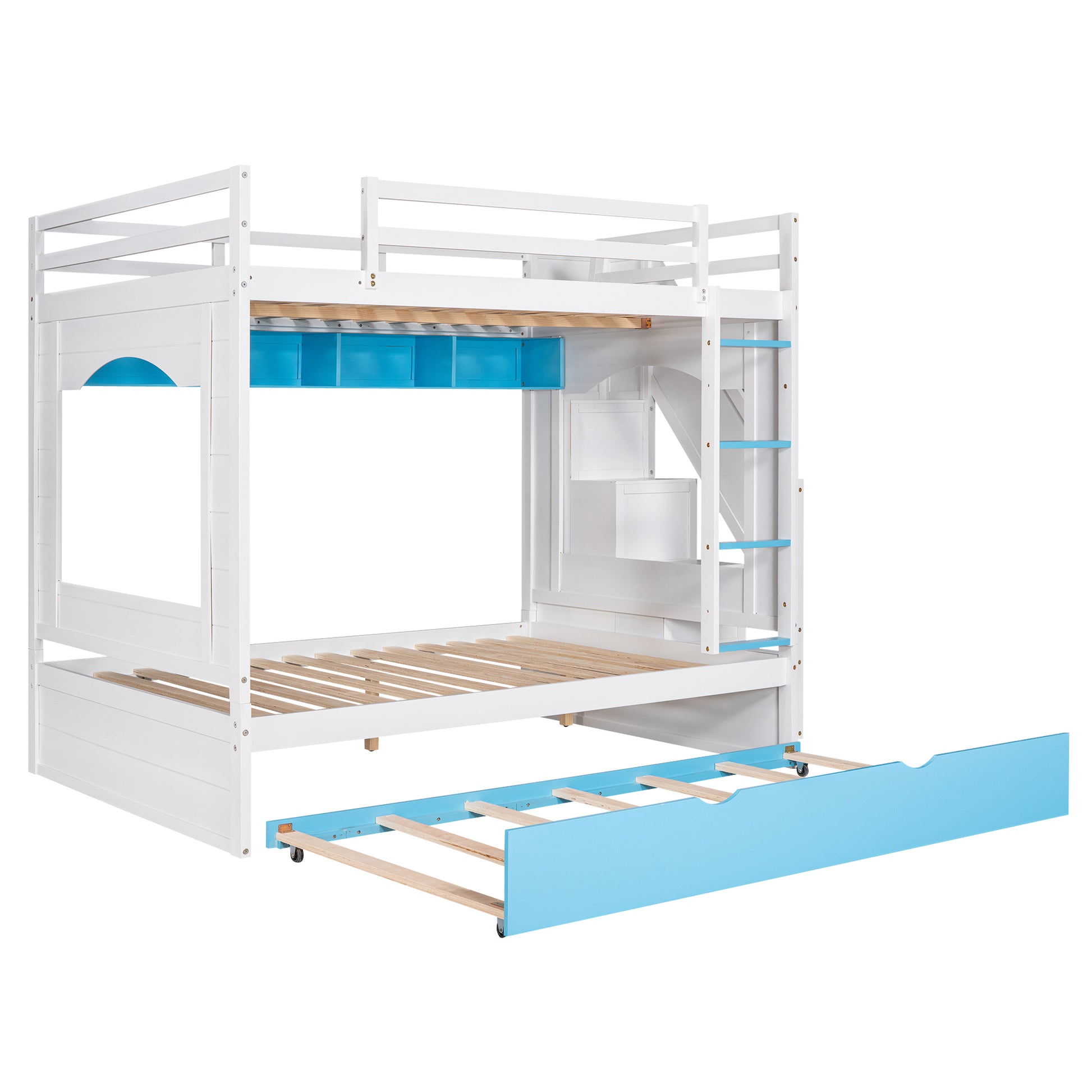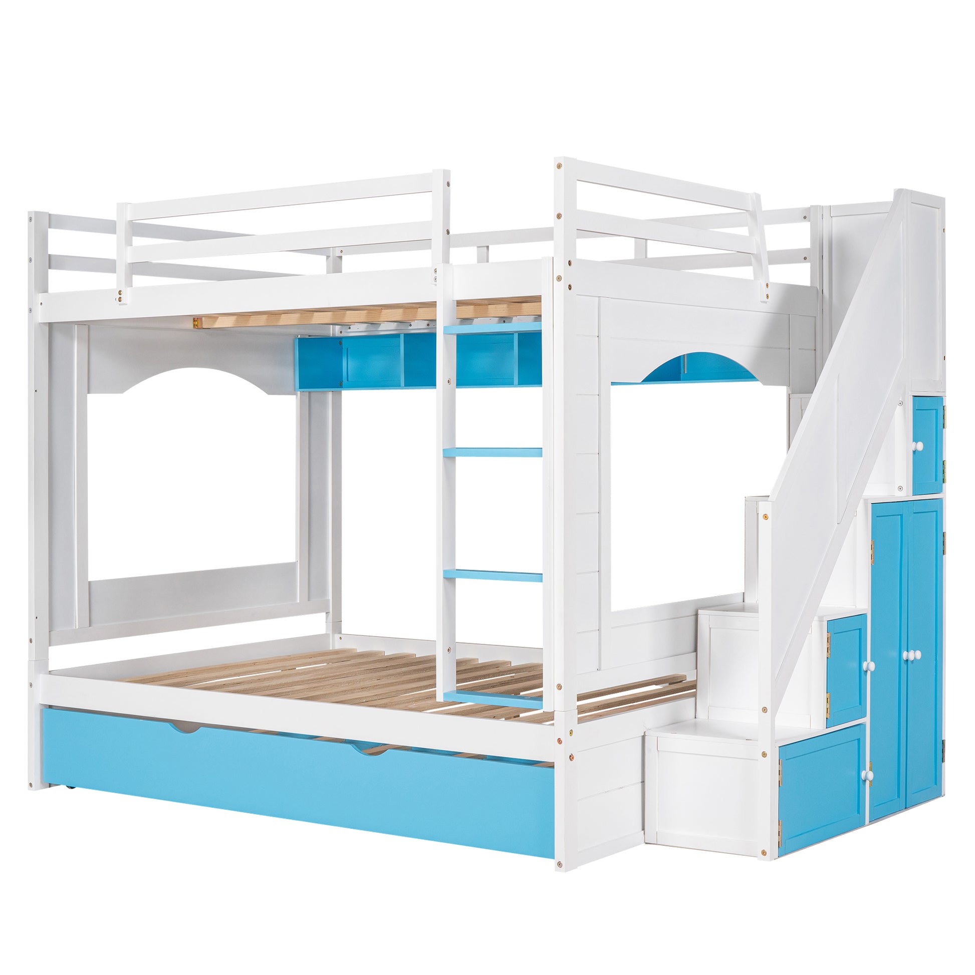 Full Over Full Bunk Bed with Trundle ,Stairs,Ladders Solid Wood Bunk bed with Storage Cabinet (White + Blue)