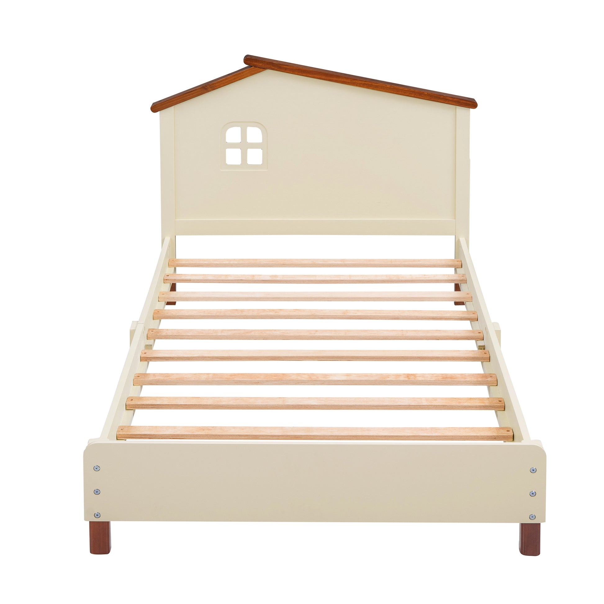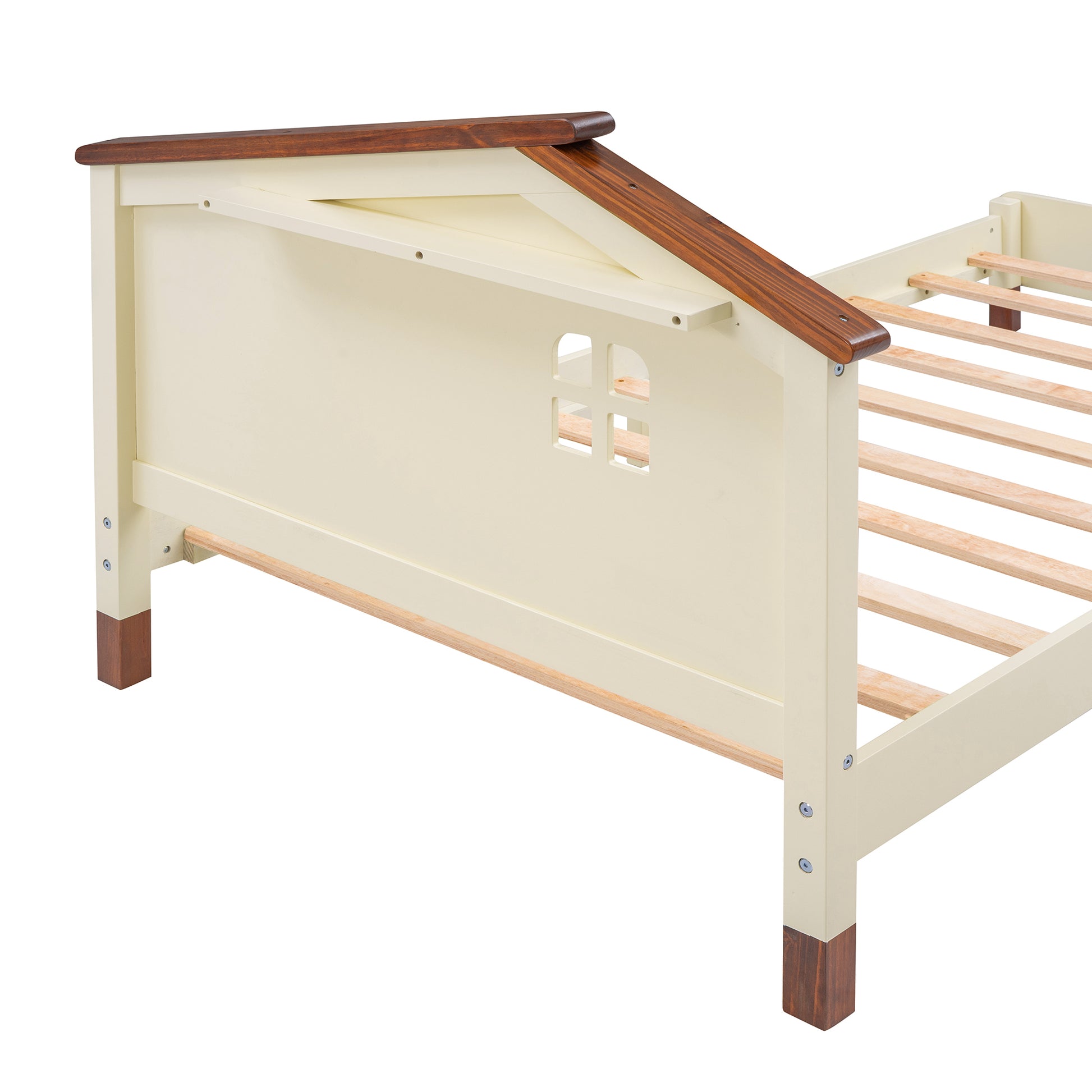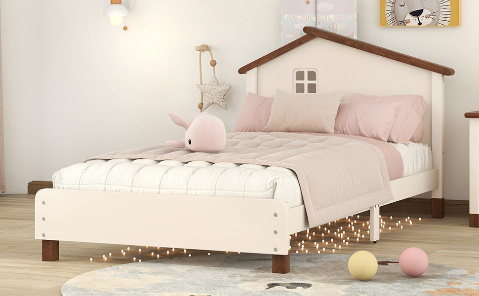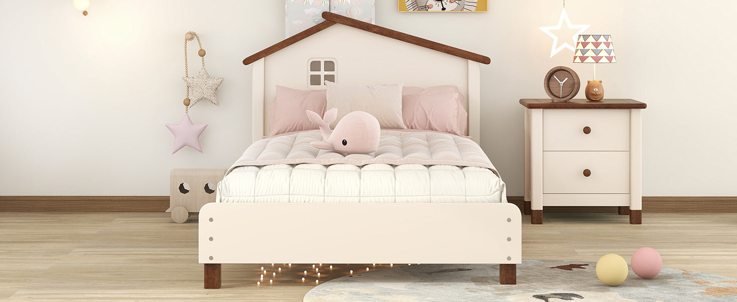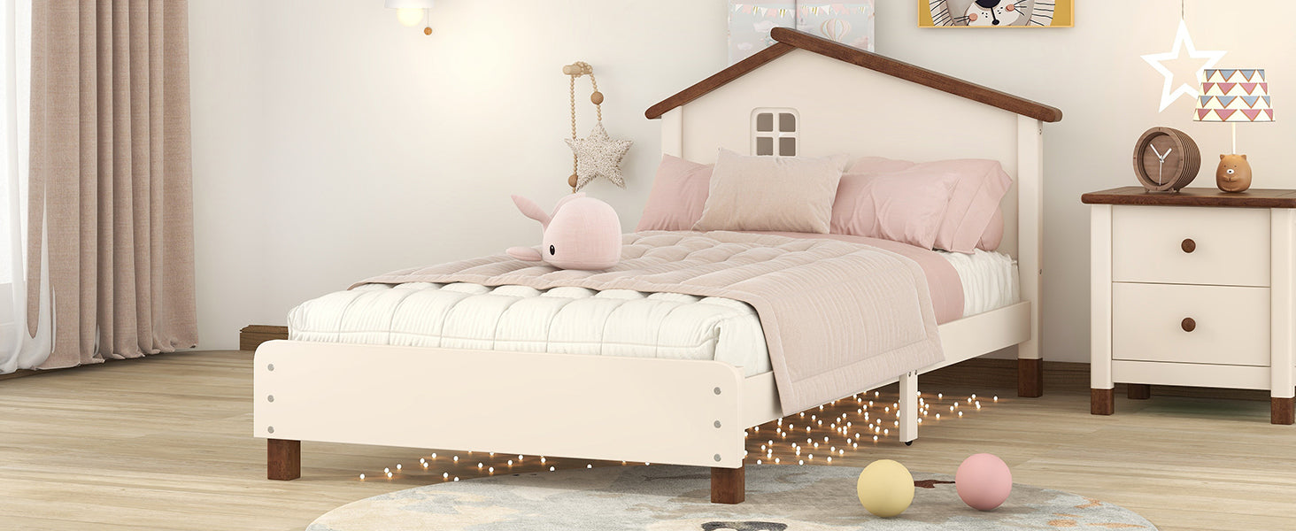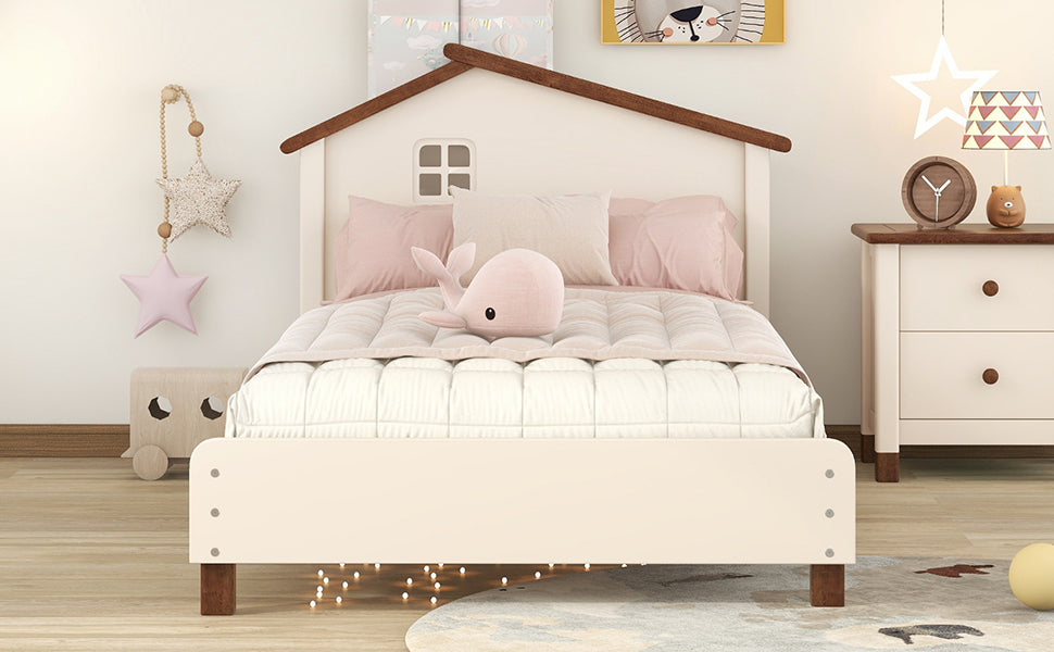 Twin Size Wood Platform Bed with House-shaped Headboard (Cream+Walnut)