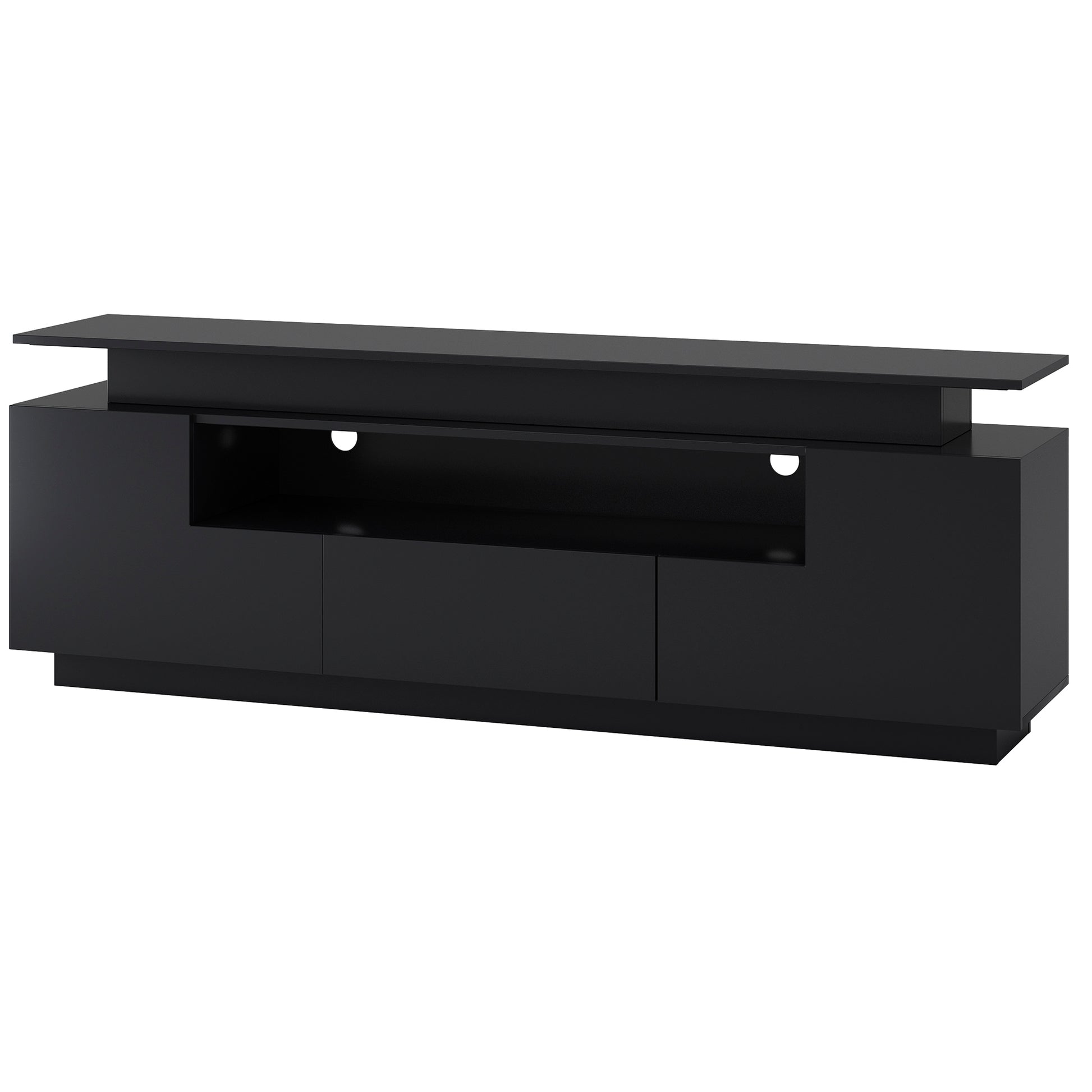 This TV stand has many different storage spaces.Drawers and cabinets can store your snacks, batteries or CDs, the middle open storage space is a good place to put game consoles, DVDs, remote controls, etc. The upper layer also has excellent load-bearing capacity, which can place a TV for 75 inches.