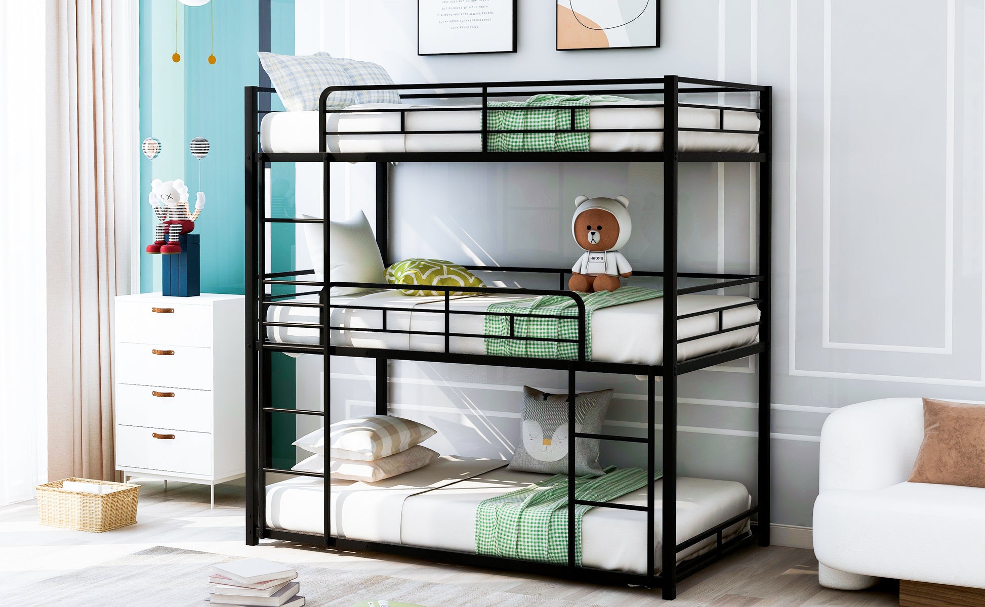 - 2.Featuring full-length guardrail on top bed and middle bed, this bed guarantees user's safety.