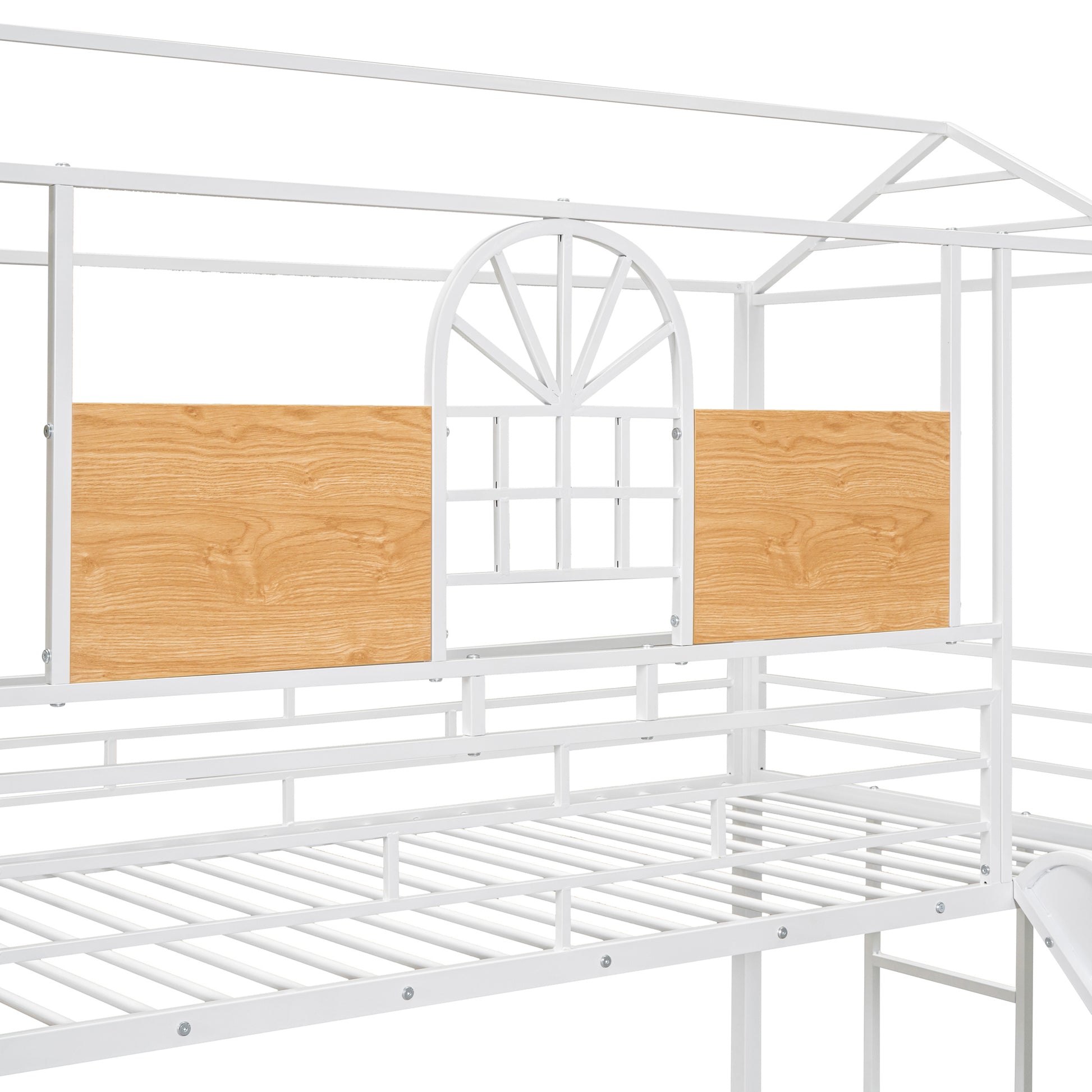 Transform your room into an exciting space for play and creativity. Crafted in the shape of a house, this novelty bunk bed comes equipped with a built-in slide for hours of entertainment.Three compartments of different sizes hide underneath the stairs of this bunk bed and are perfect for you to store anything you want.Crafted as a cabin-inspired playhouse with side shelf and bottom bunk and the slide , this bed doubles as a semi-enclosed play place to let the imagination of you run wild.