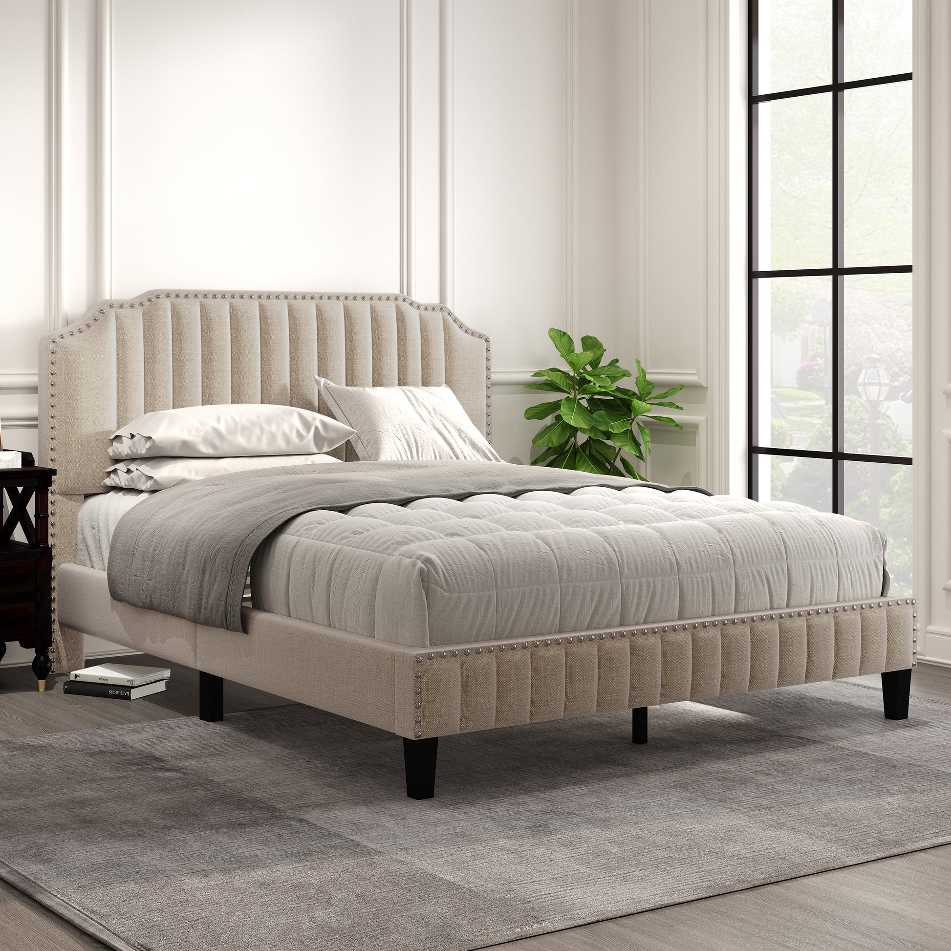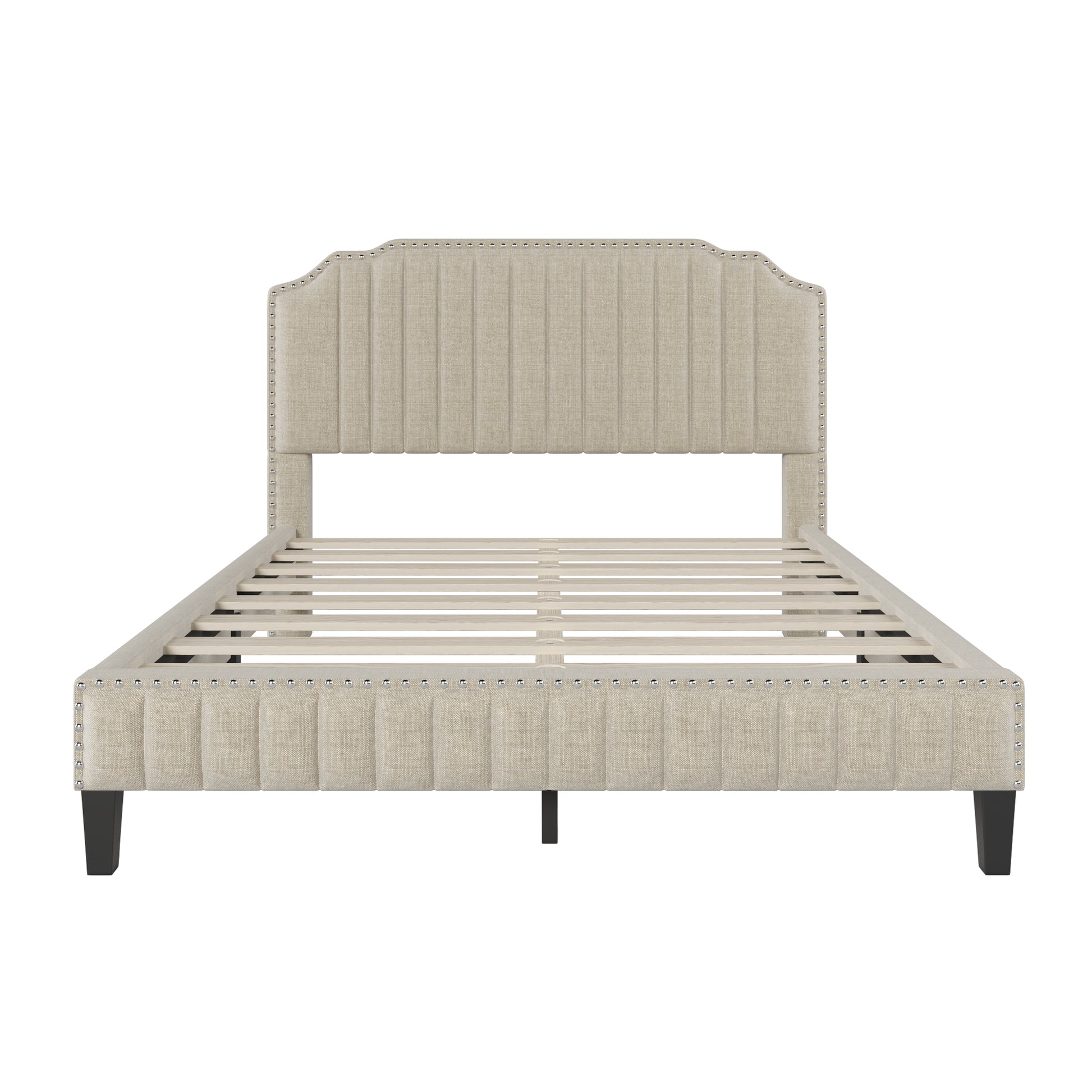 Modern Linen Curved Upholstered Platform Bed , Solid Wood Frame , Nailhead Trim, Beige (Queen)