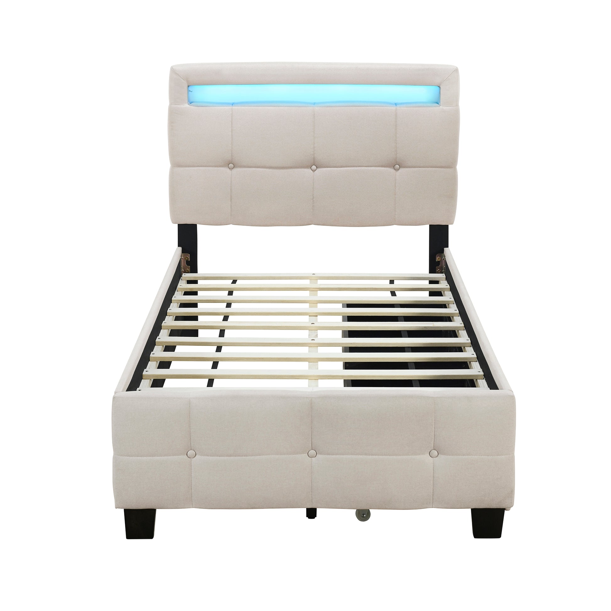 Twin Size Upholstered Platform Bed with LED Frame and 2 Drawers, Linen Fabric, Beige