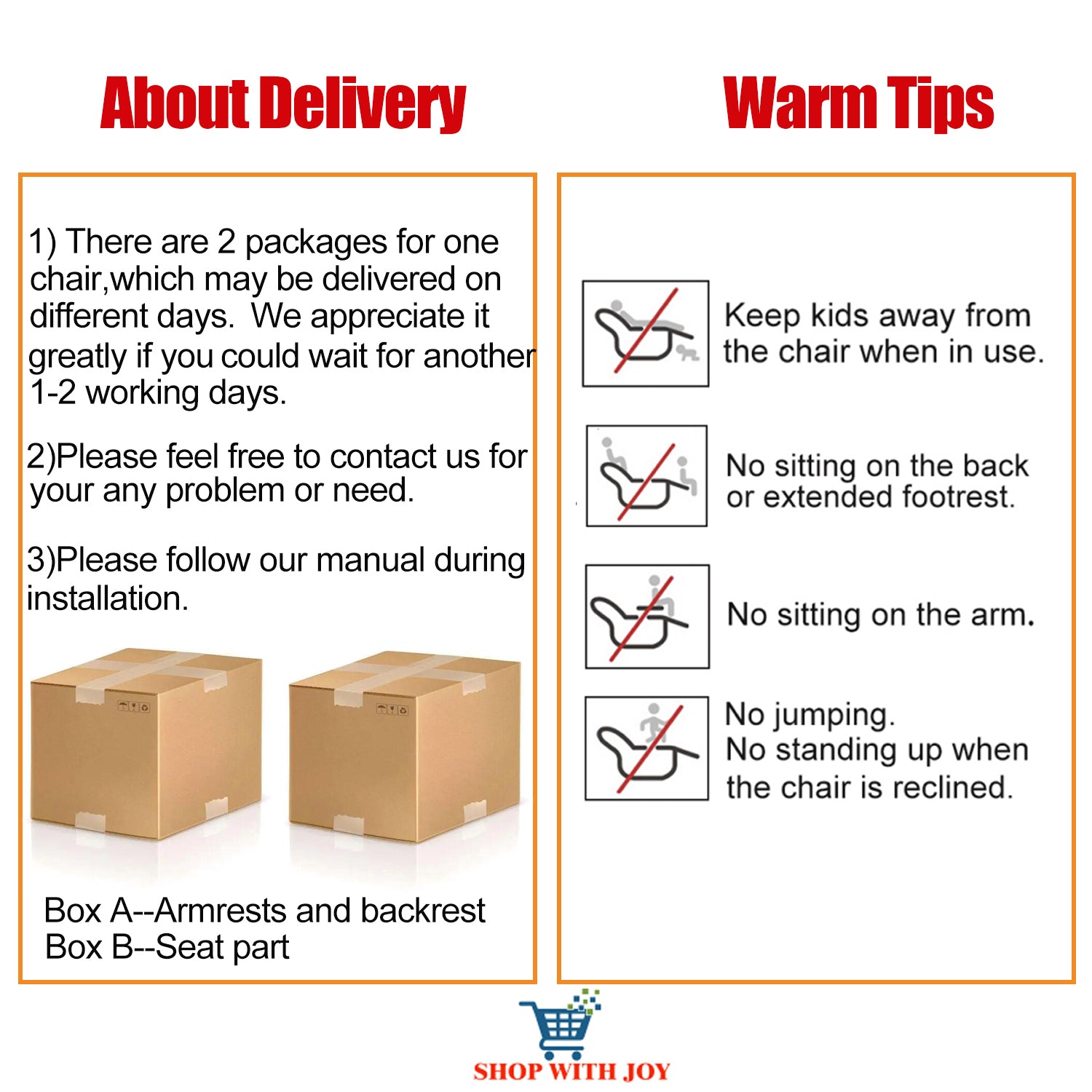 - Warm Notice:(1) Please do not throw yourself into the chair to avoid tipping over. (2) Make sure that the recliner chair has been back to upright position before you leaving the chair. (3) Children are not allowed to pay around it when the recliner is in operation state. (4) This electric recliner is designed for one adult at a time. (5) Never sit on the armrest or footrest,especially when the footrest is extended.Or it will tip over.