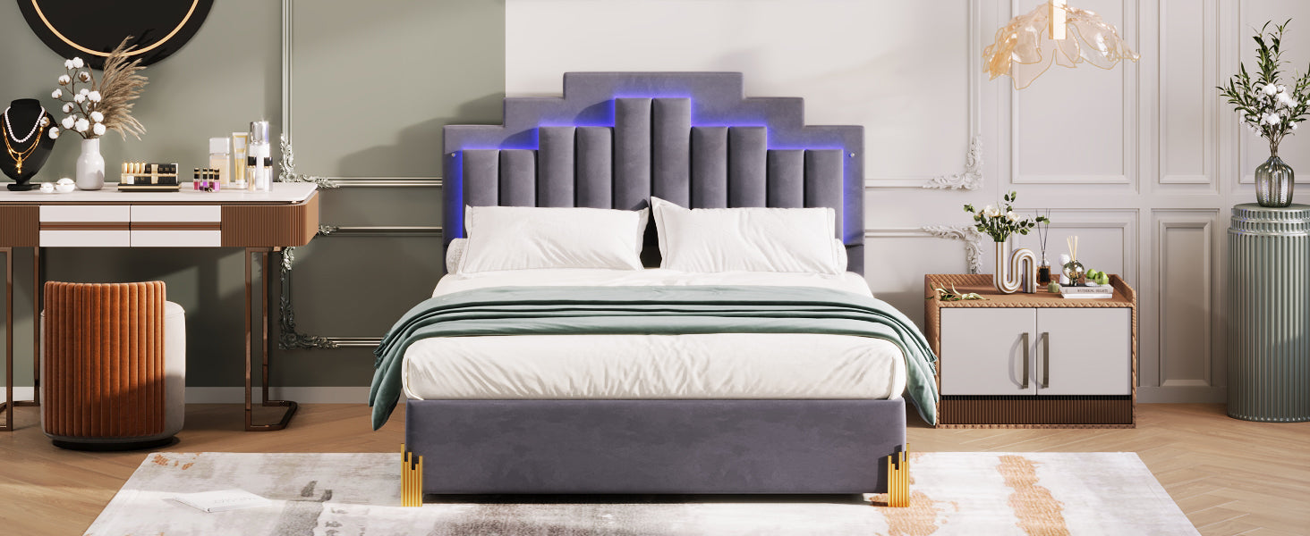 Queen Size Upholstered Platform Bed with LED Lights and 4 Drawers, Stylish Irregular Metal Bed Legs Design, Gray