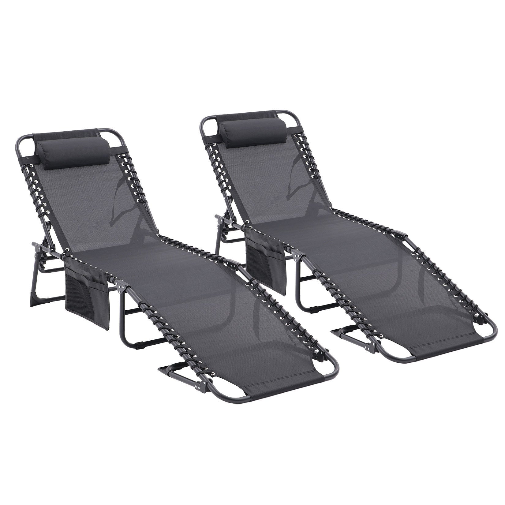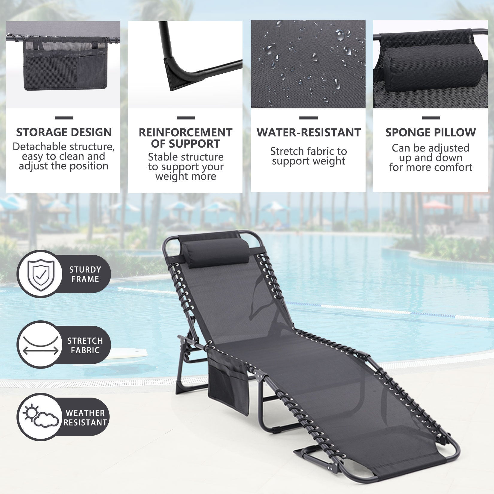 Folding Textilene Waterproof Patio Chaise Lounge Chair,Outdoor Adjustable and Reclining Tanning Chair with Pillow and Side Pocket for Lawn,Beach,Pool,Portable Camping and Sunbathing(2 Pieces,Black)