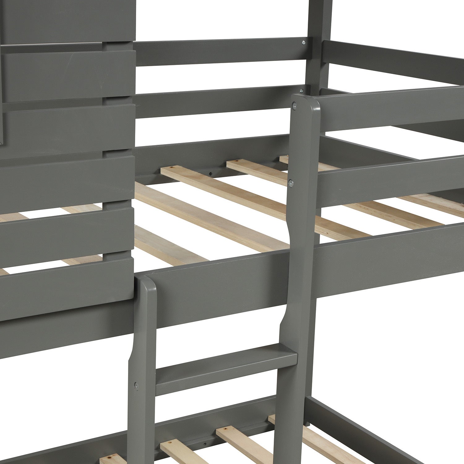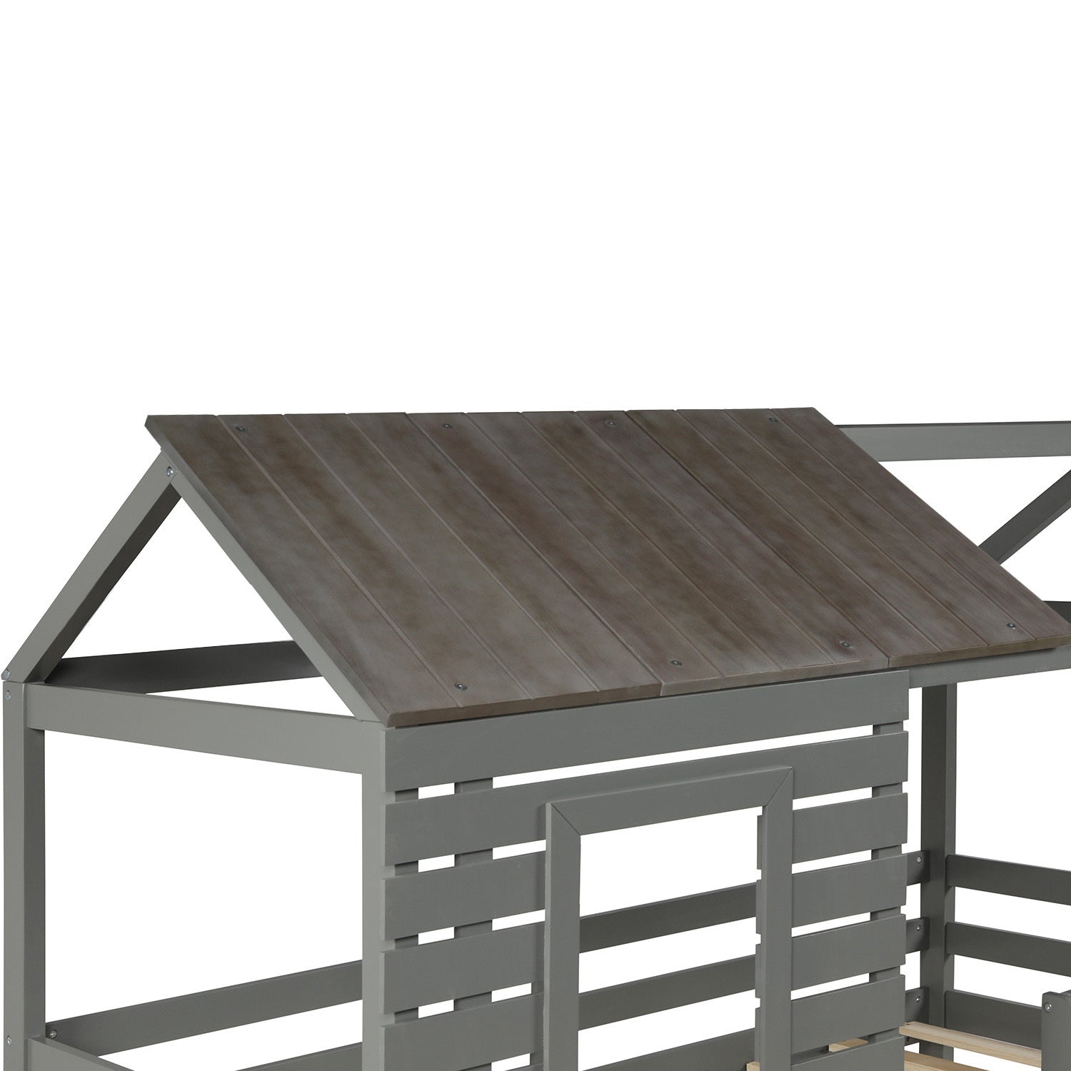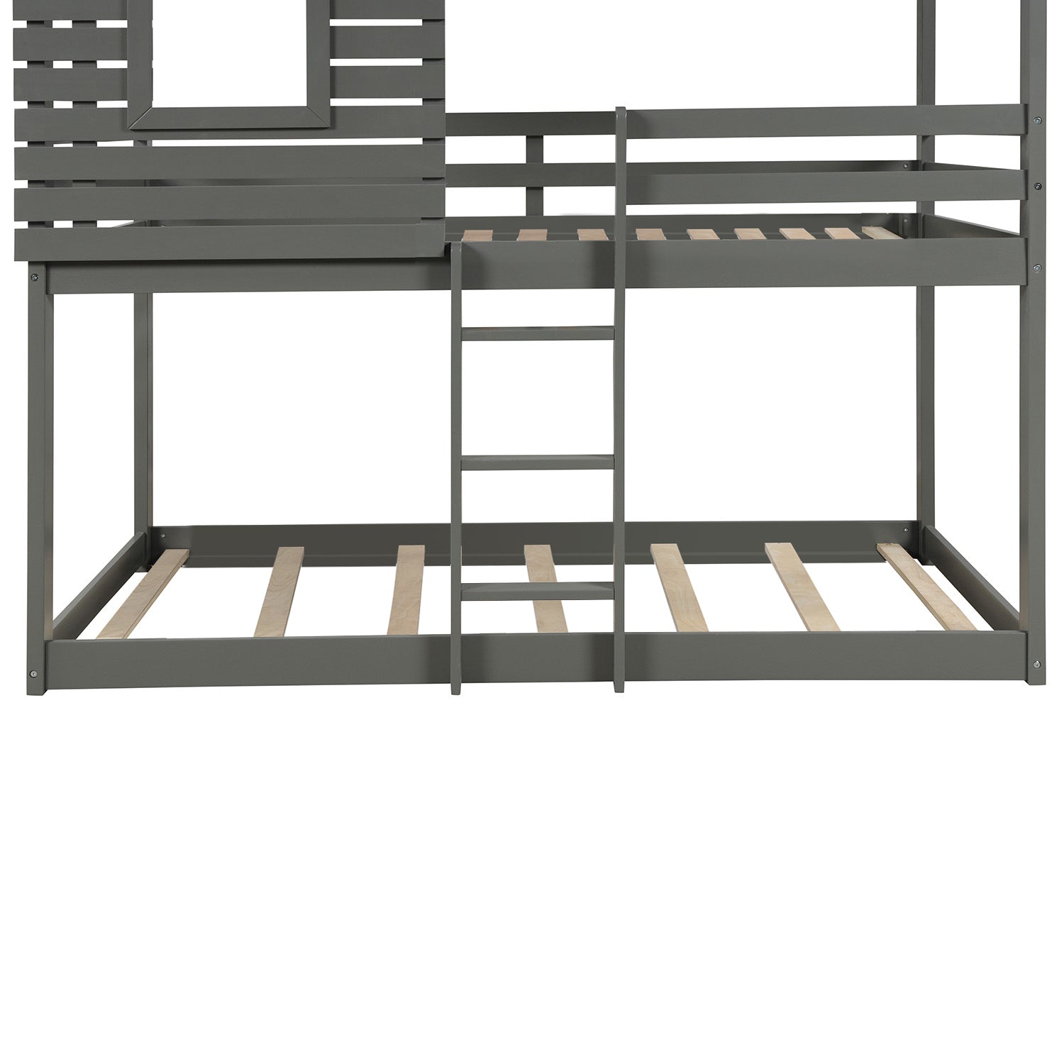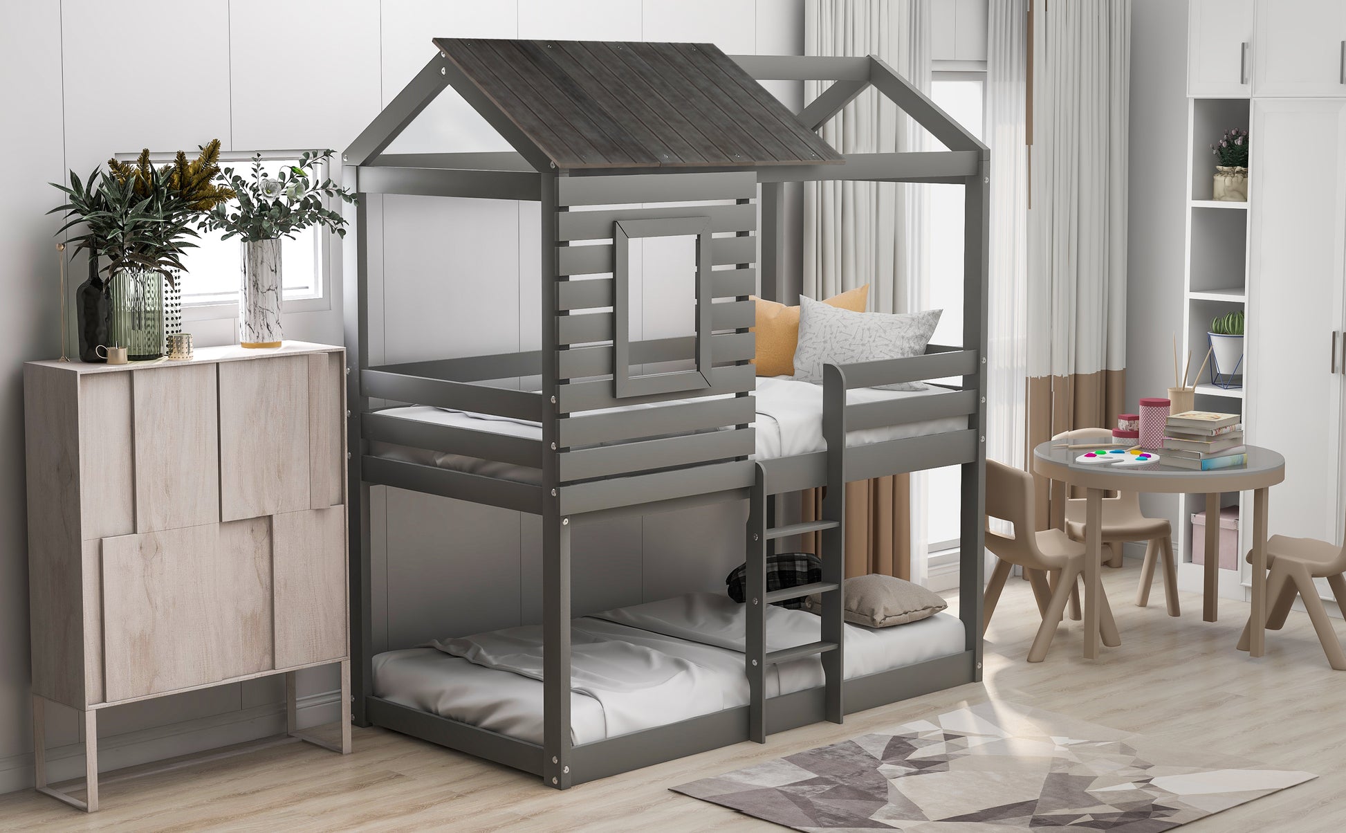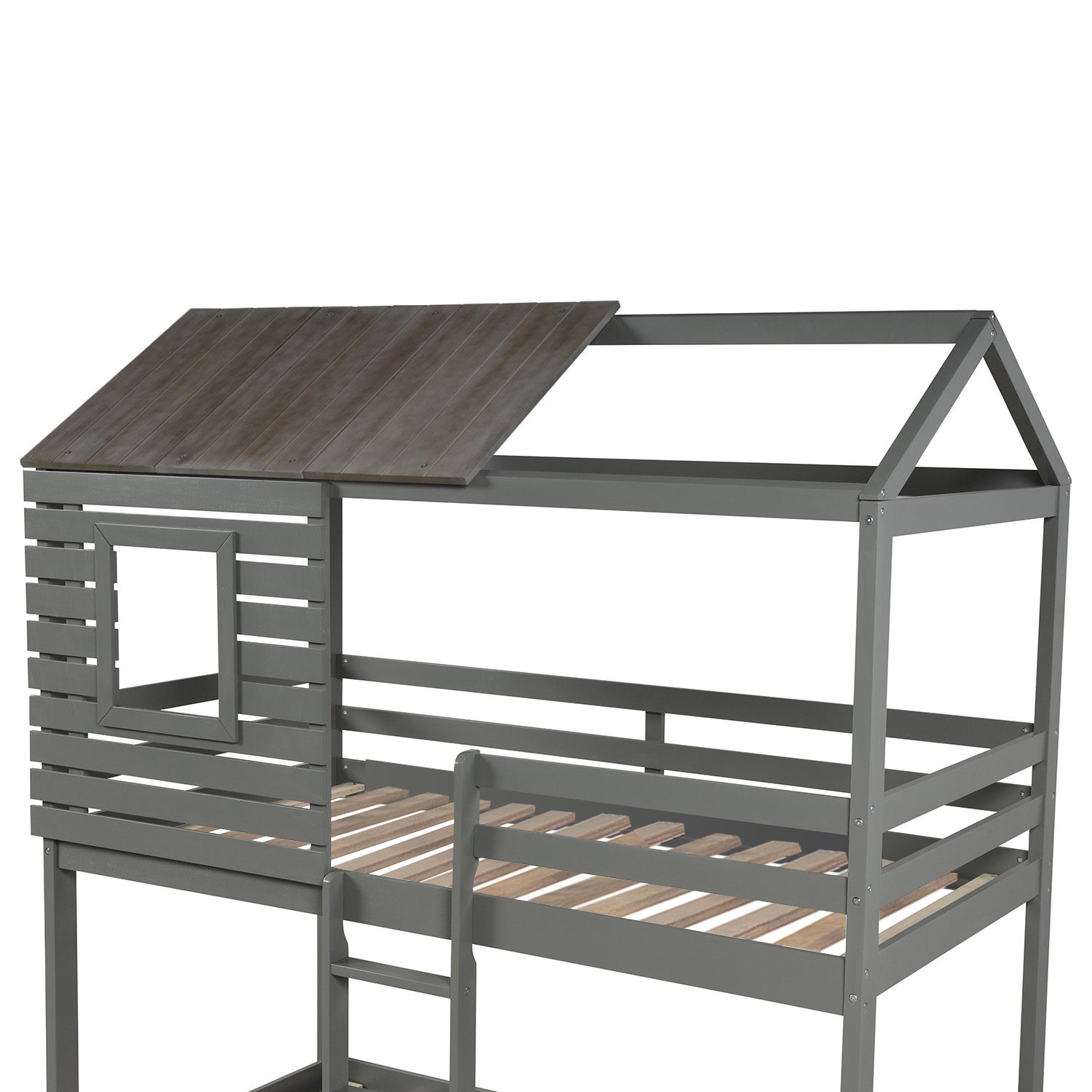 Twin Over Twin Bunk Bed Wood Loft Bed with Roof, Window, Guardrail, Ladder (Gray) OLDSKU LP000088AAN